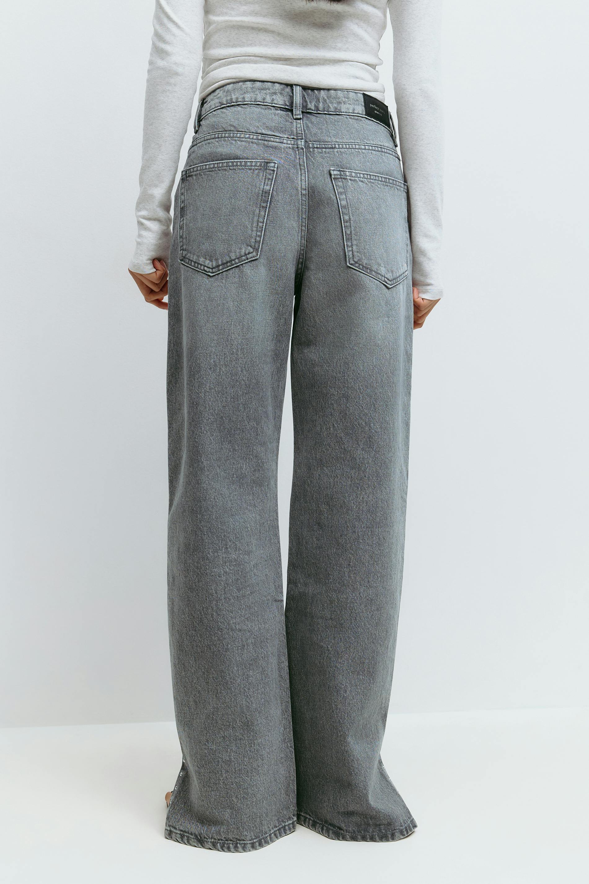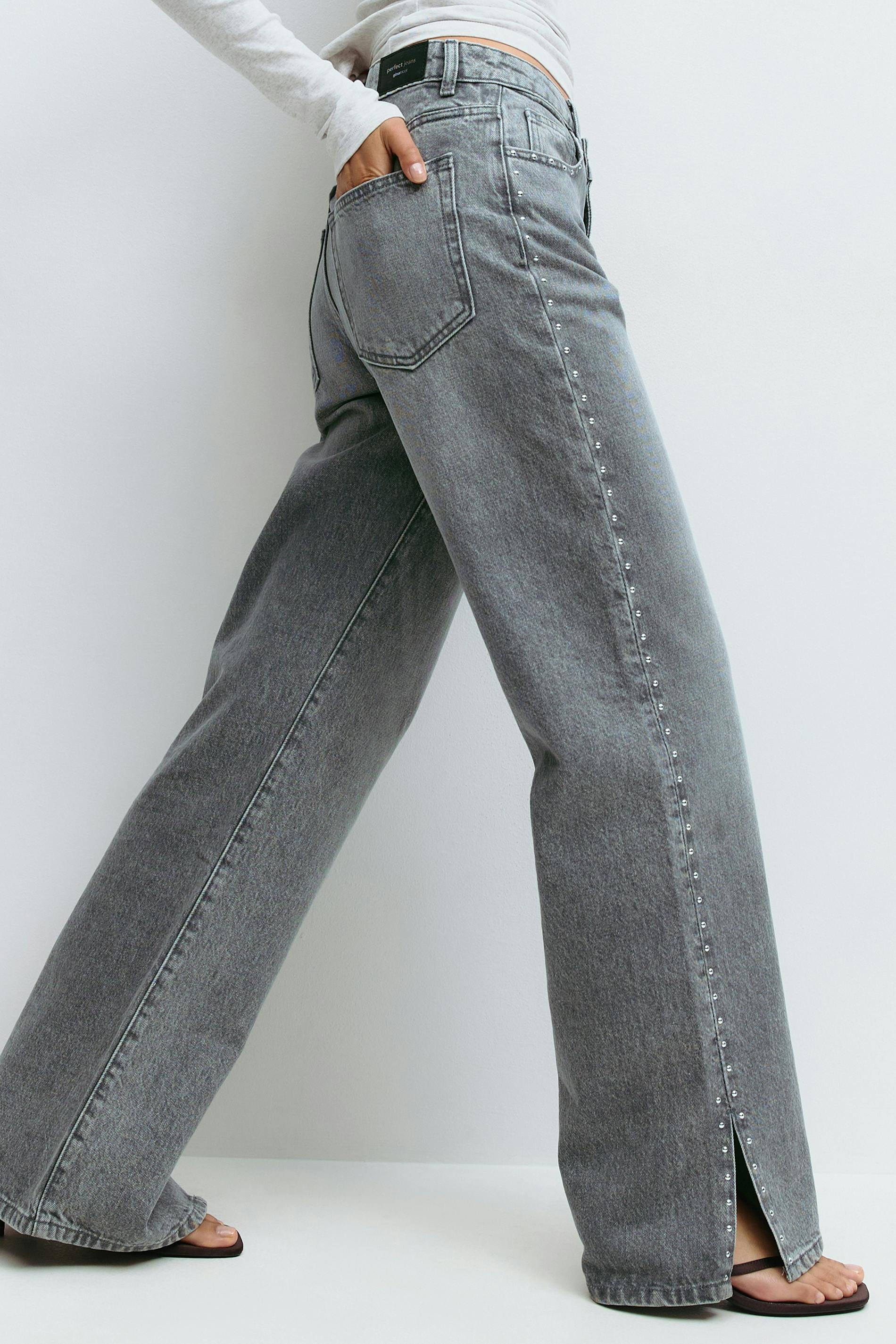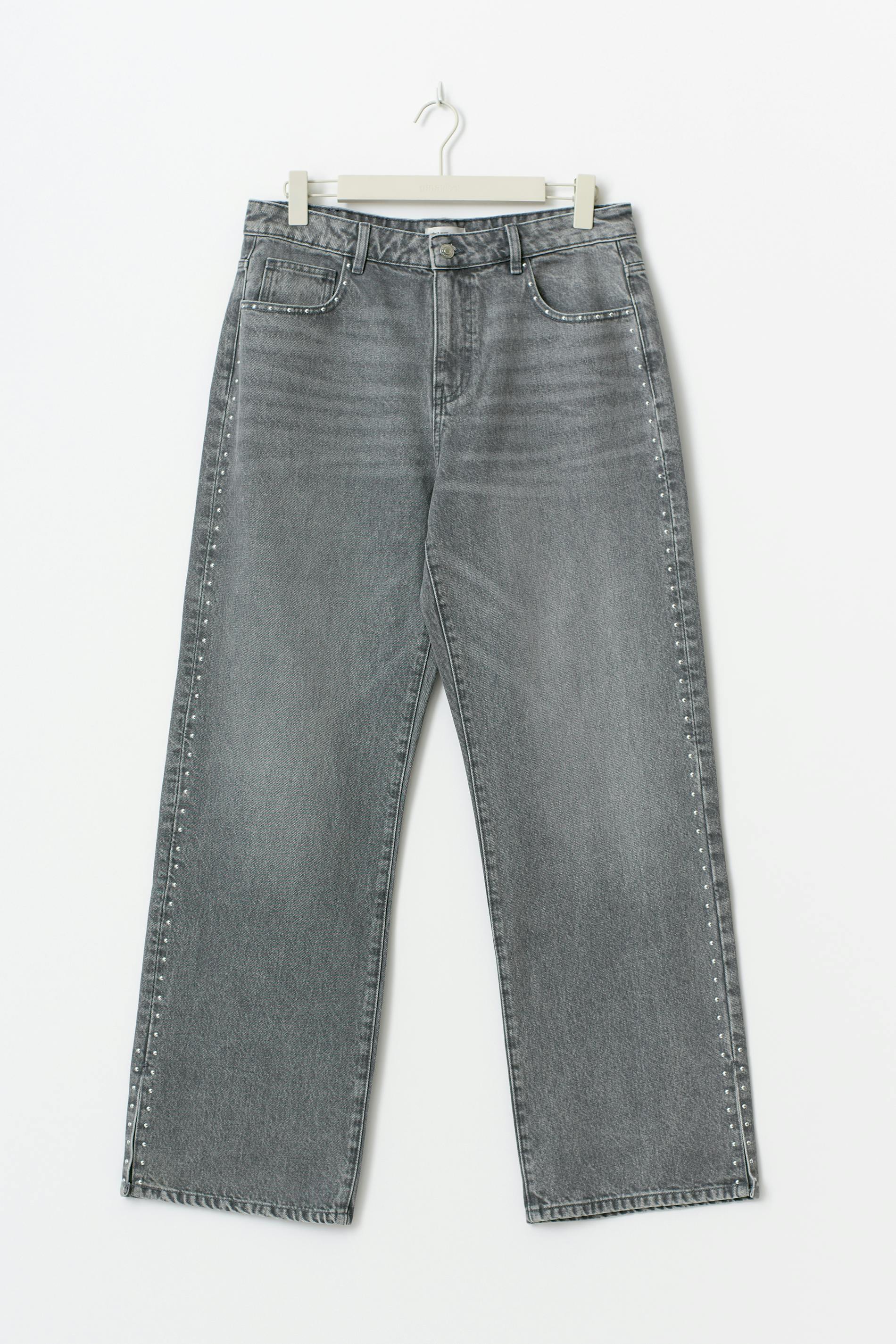 Raka jeans med nitdetaljer. Jeansen är gråa. De har fullängd, medelhög midja, lös passform, slits i sidorna, dragkedjegylf och femficksdesign.