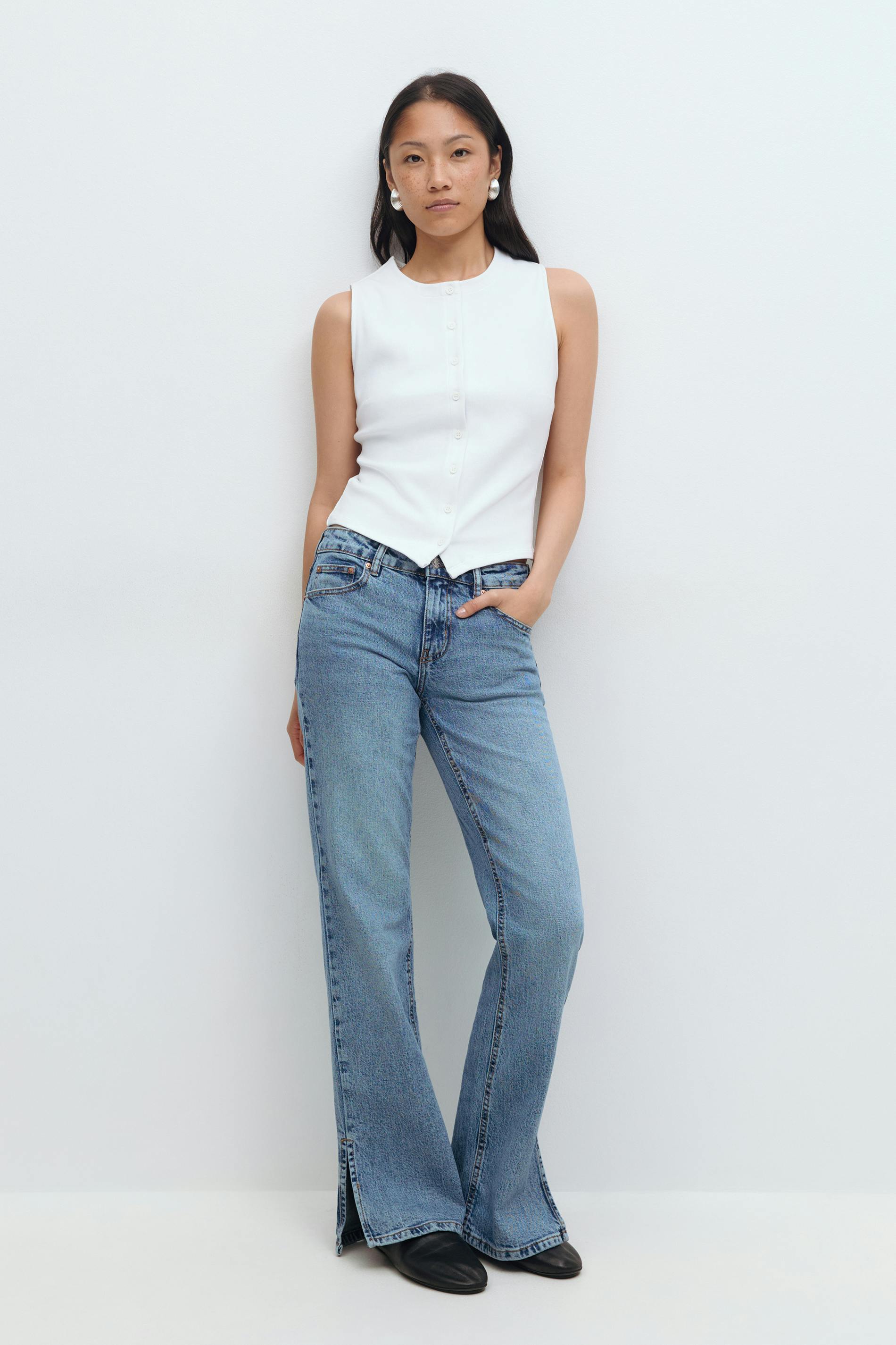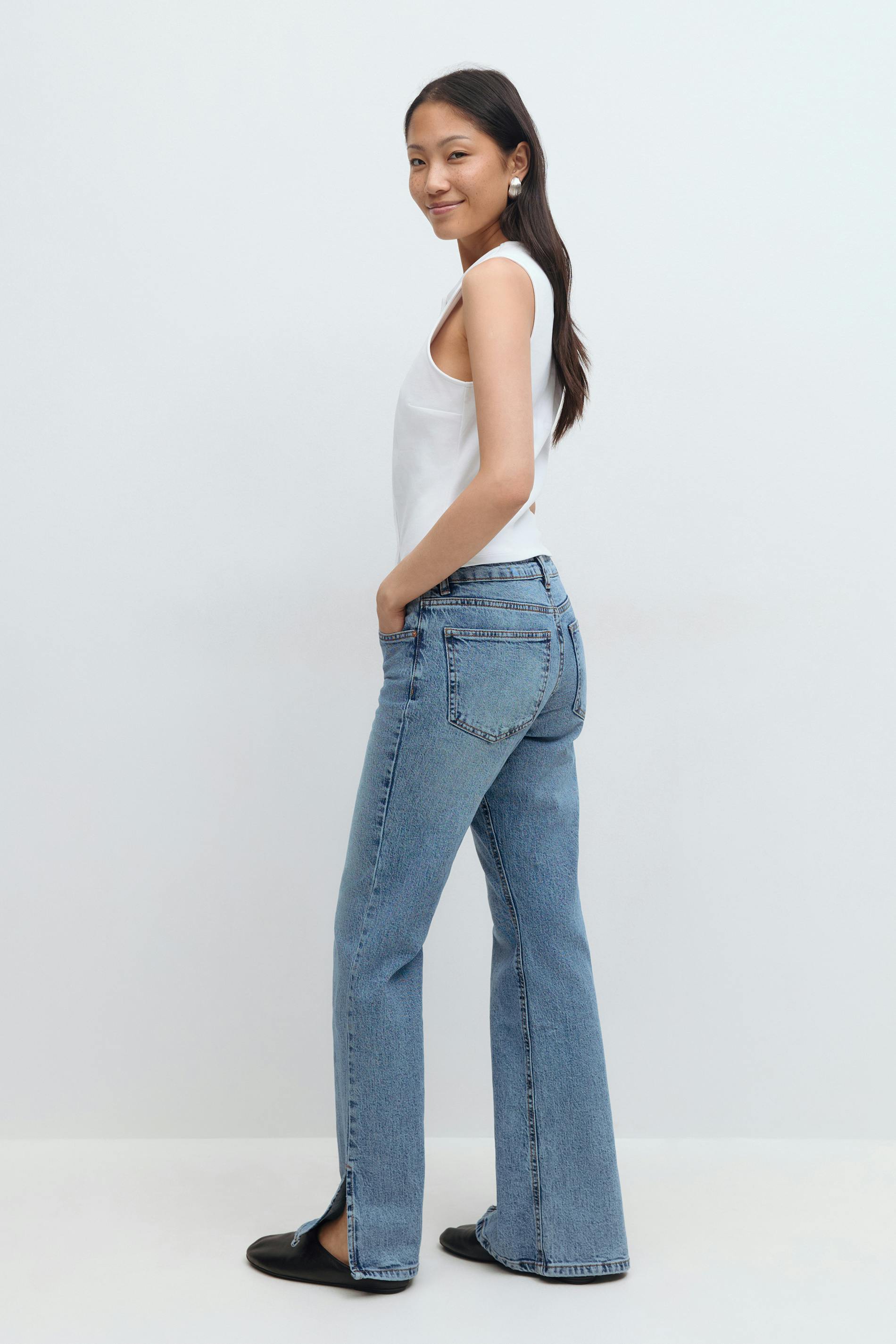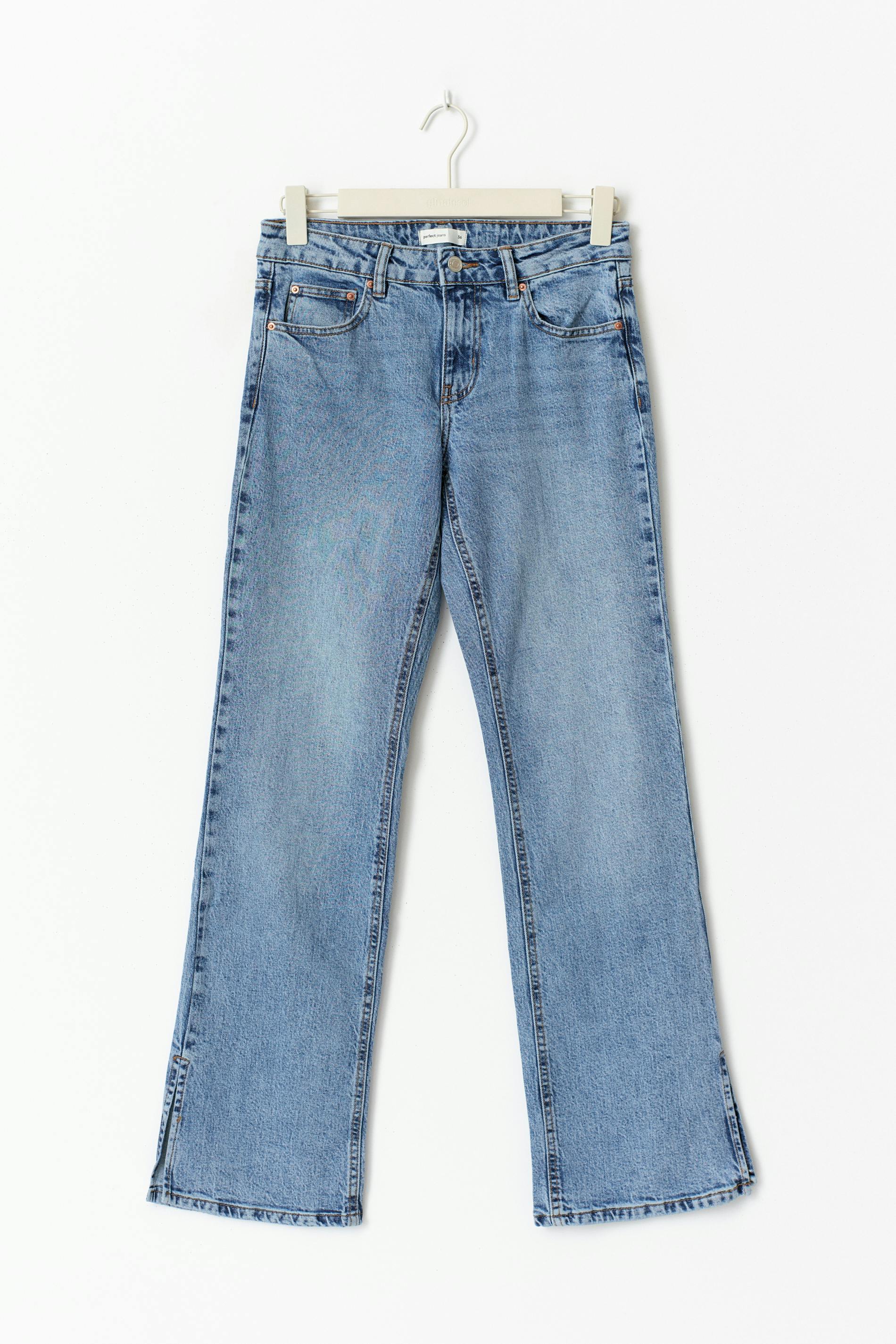 Jeans med en låg midja. Jeansen är blåa och har raka ben med en normallängd. De har en sidoslits på nederkanterna, en dragkedjegylf, fickor fram och bak och stretch. Se gärna vår storleksguide för att hitta din storlek.