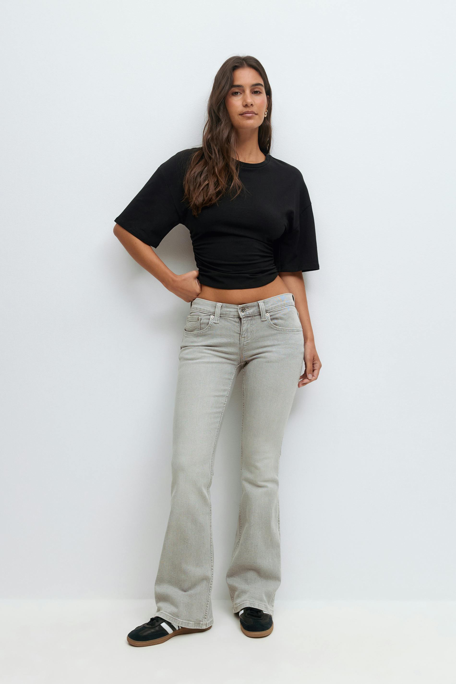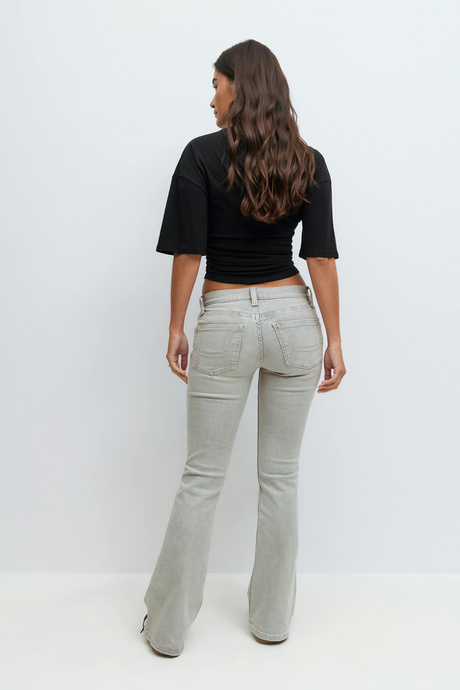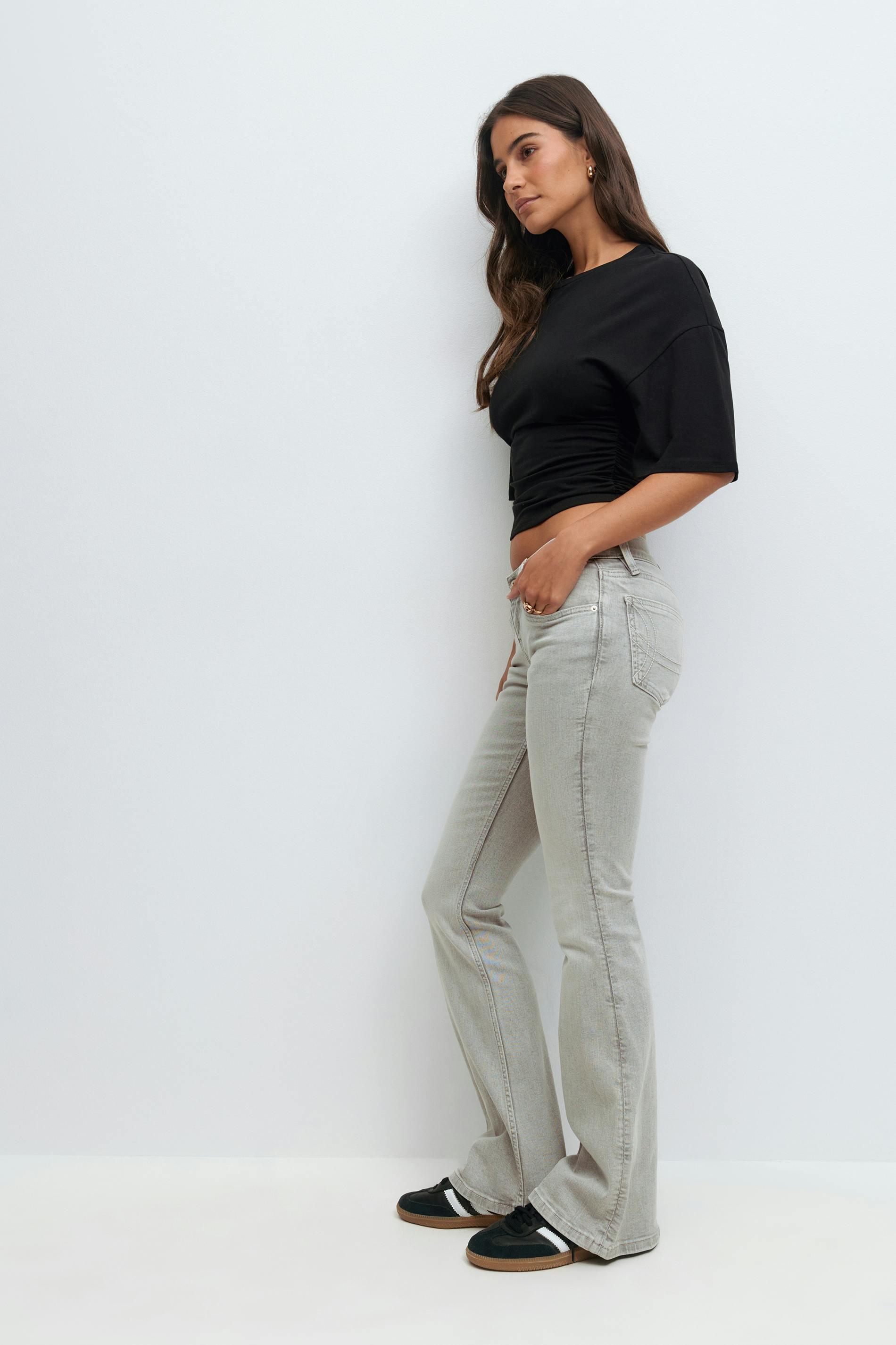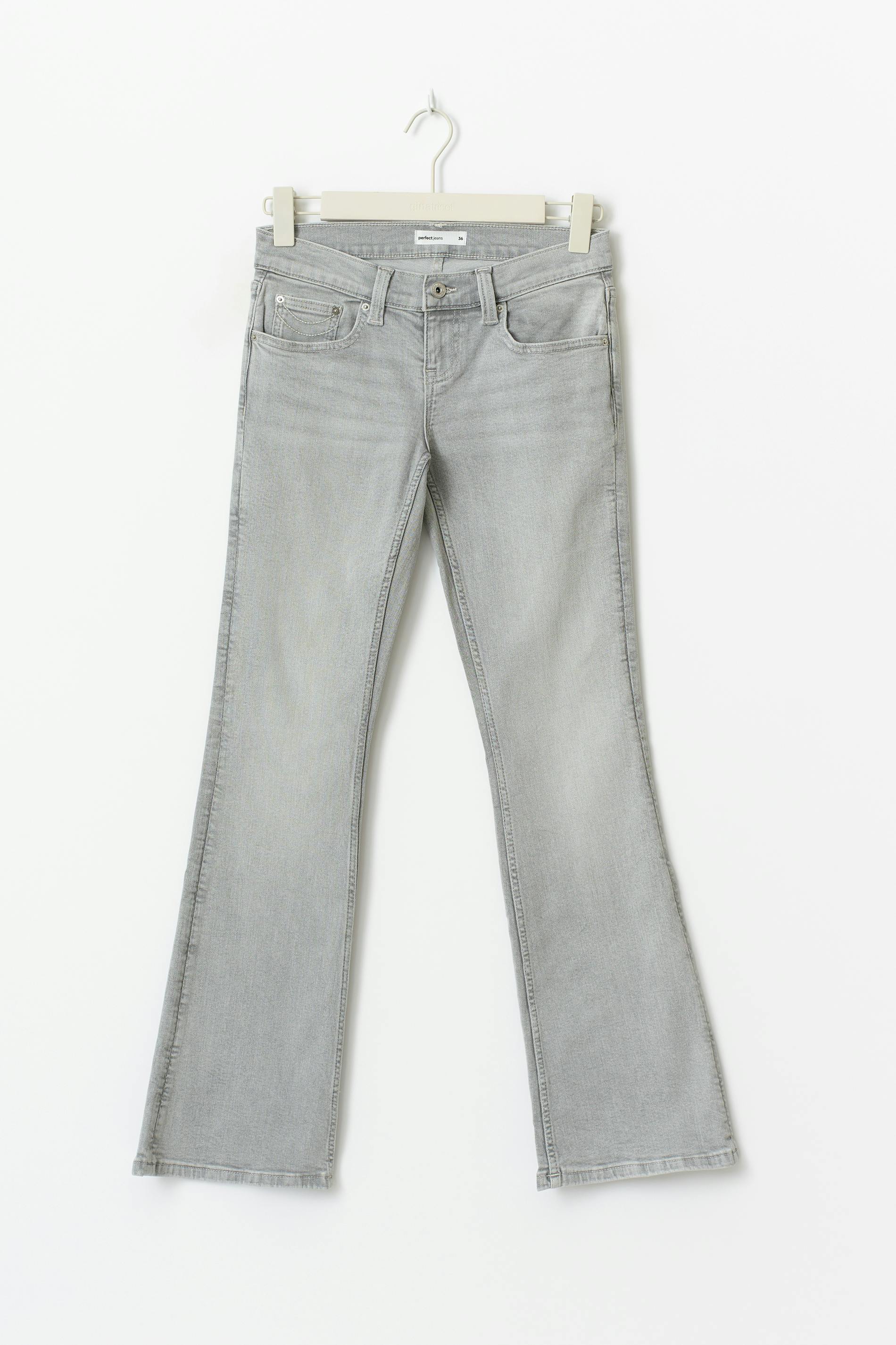 Lågmidjade bootcut jeans med figurnära passform. Jeansen är ljusgråa och har utsvängda ben med normallängd. De har stretchig kvalitet, dragkedjegylf, bälteshällor och fickor fram och bak. Se gärna vår storleksguide för att hitta din storlek.