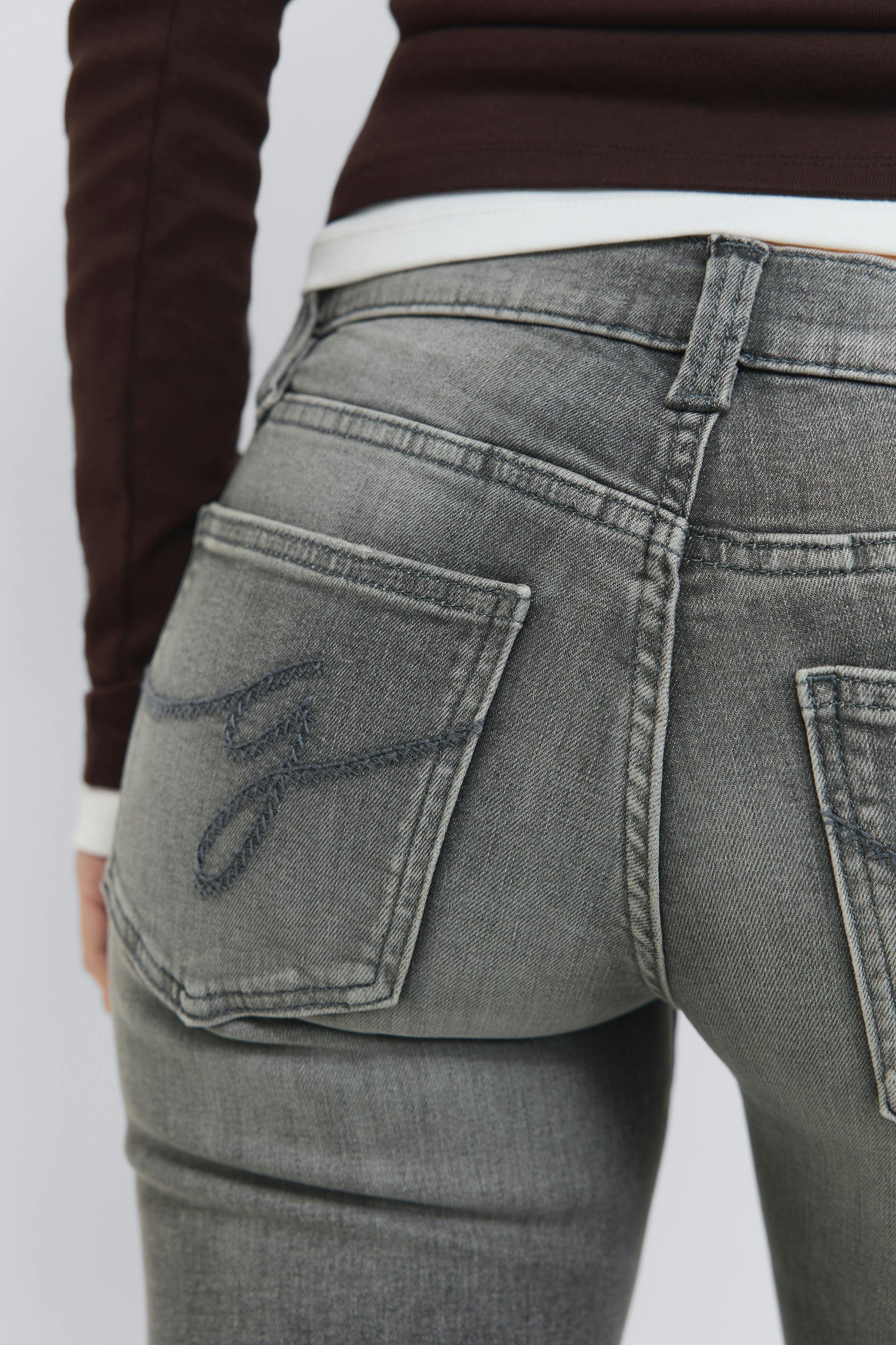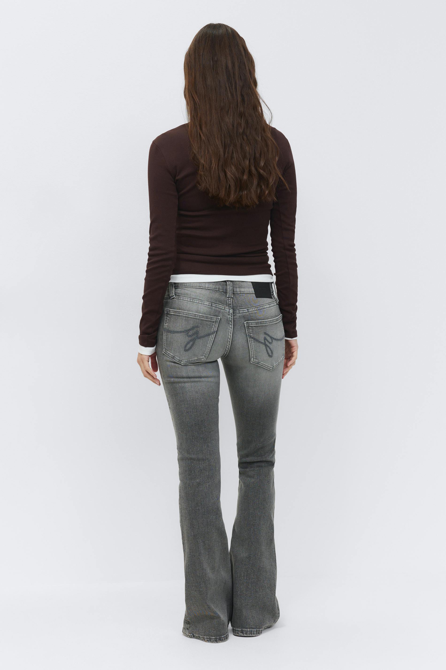 Lågmidjade bootcut jeans med figurnära passform. Jeansen är gråa och har utsvängda ben med normallängd. De har stretchig kvalitet, dragkedjegylf, bälteshällor och fickor fram och bak. Se gärna vår storleksguide för att hitta din storlek.