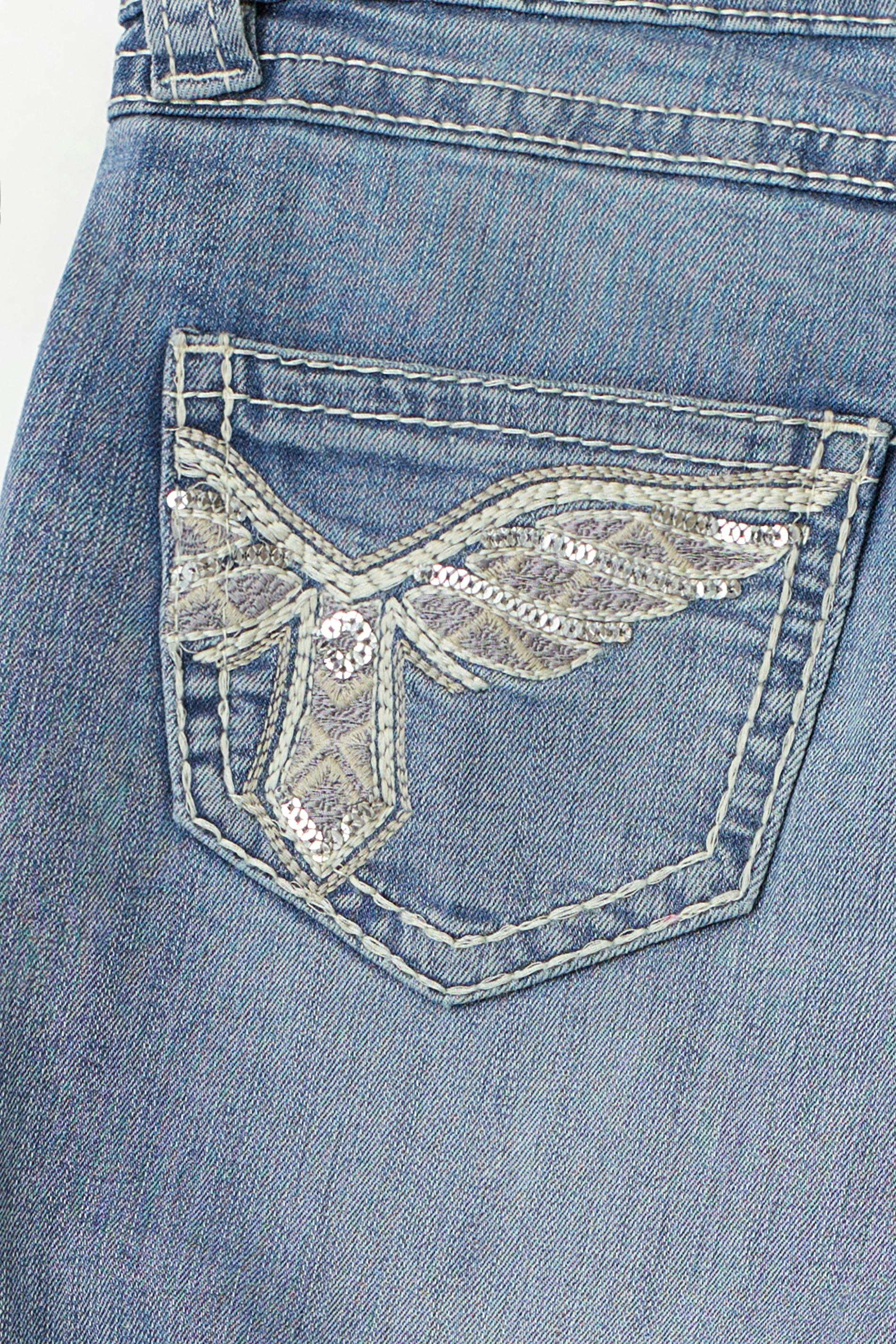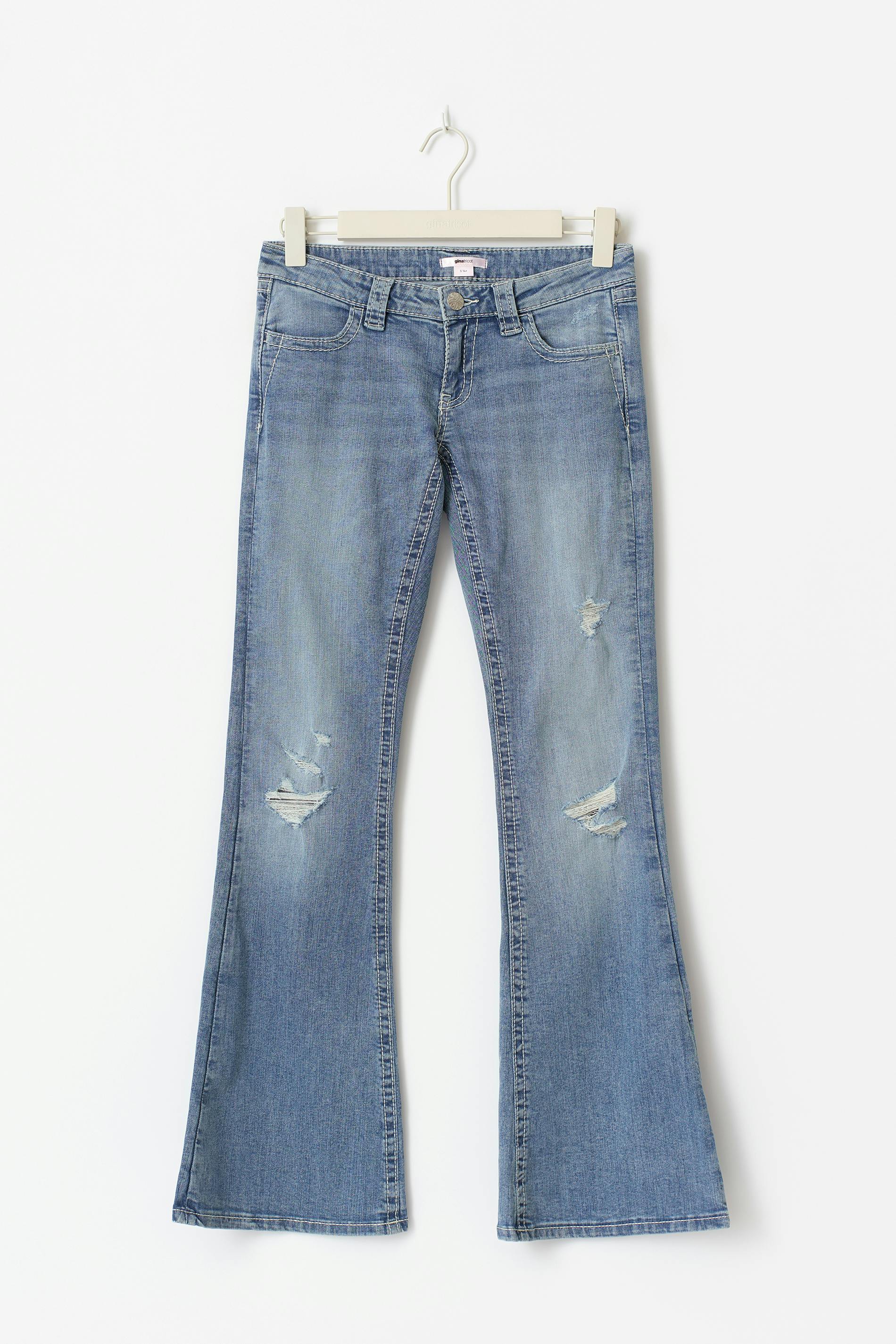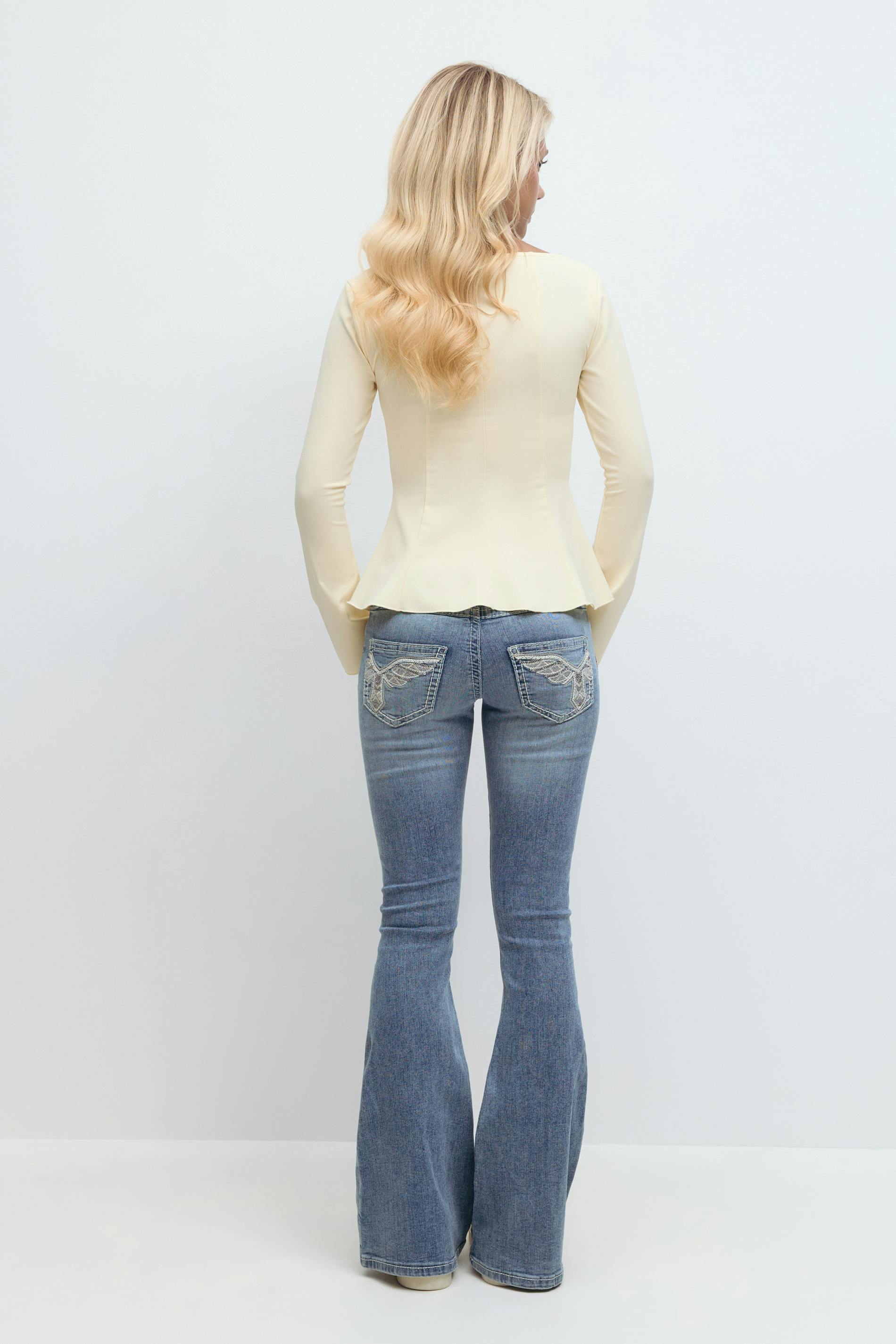 Bootcut jeans med låg midja. Jeansen är blåa och har broderade bakfickor med paljetter. De har utsvängda ben, figurnära passform och mjuk kvalitet med låg stretch.