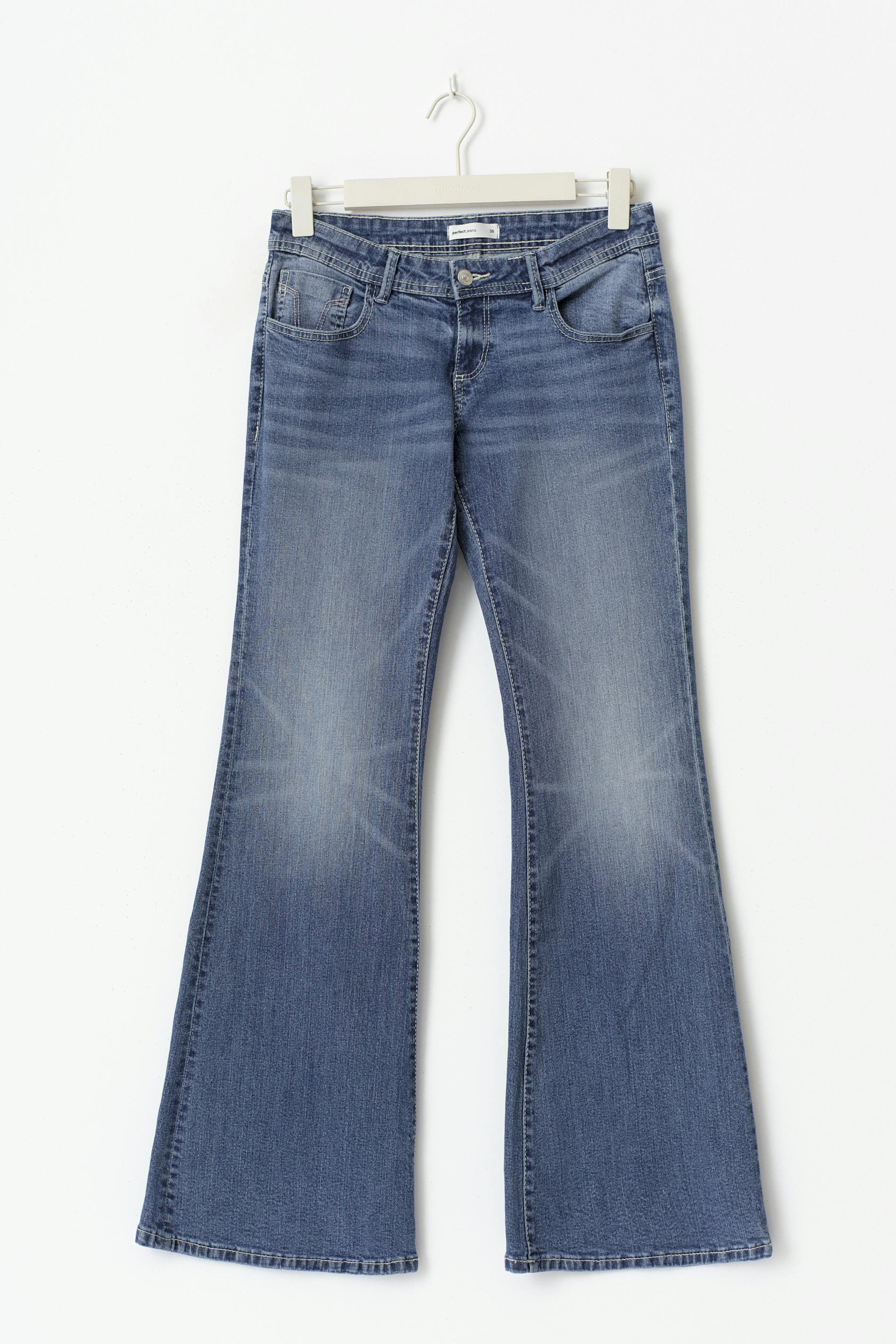 Flare jeans med låg midja. Jeansen är mörkblåa och har utsvängda ben med normallängd. De har figurnära passform, dekorativa sömmar, dragkedjegylf, bälteshällor, stretchig kvalitet och fickor fram och bak. Se gärna vår storleksguide för att hitta din storl