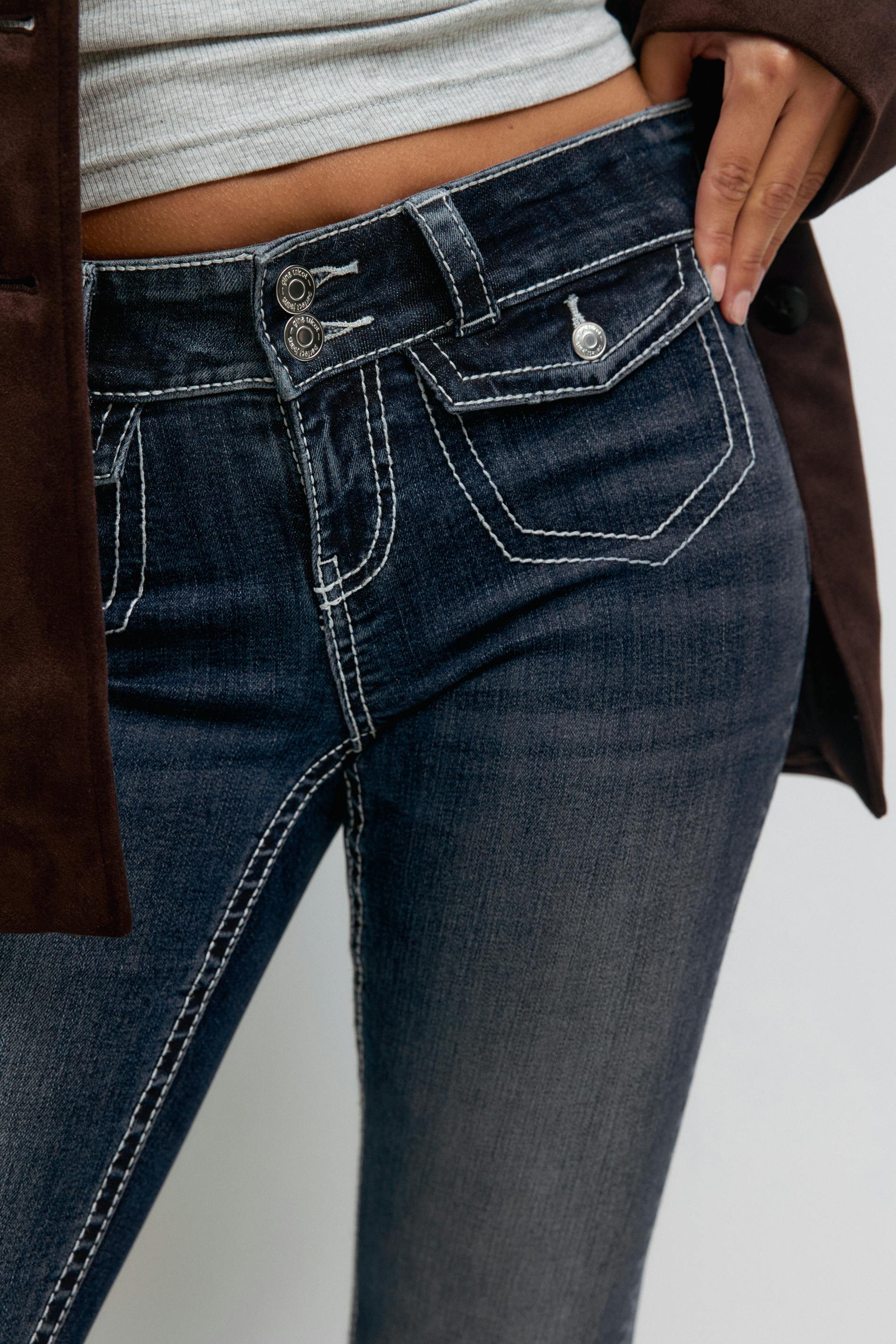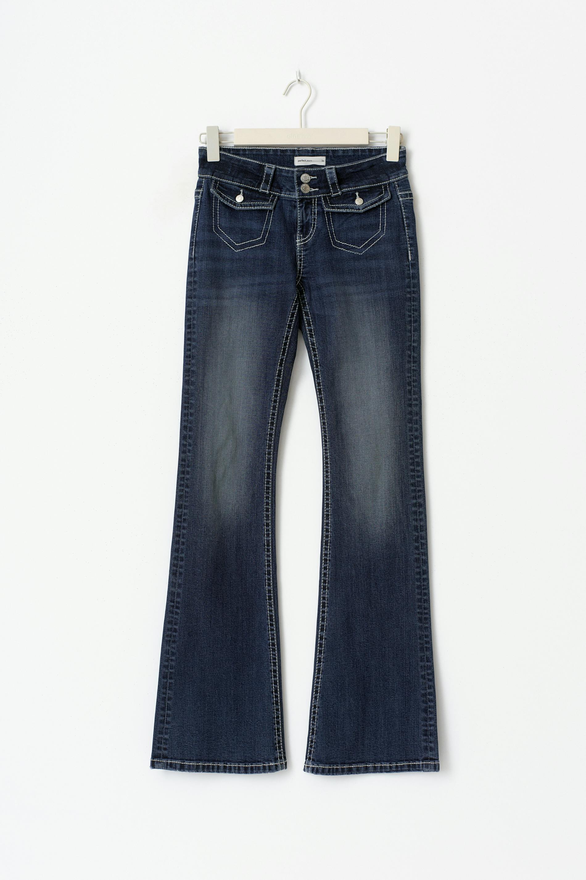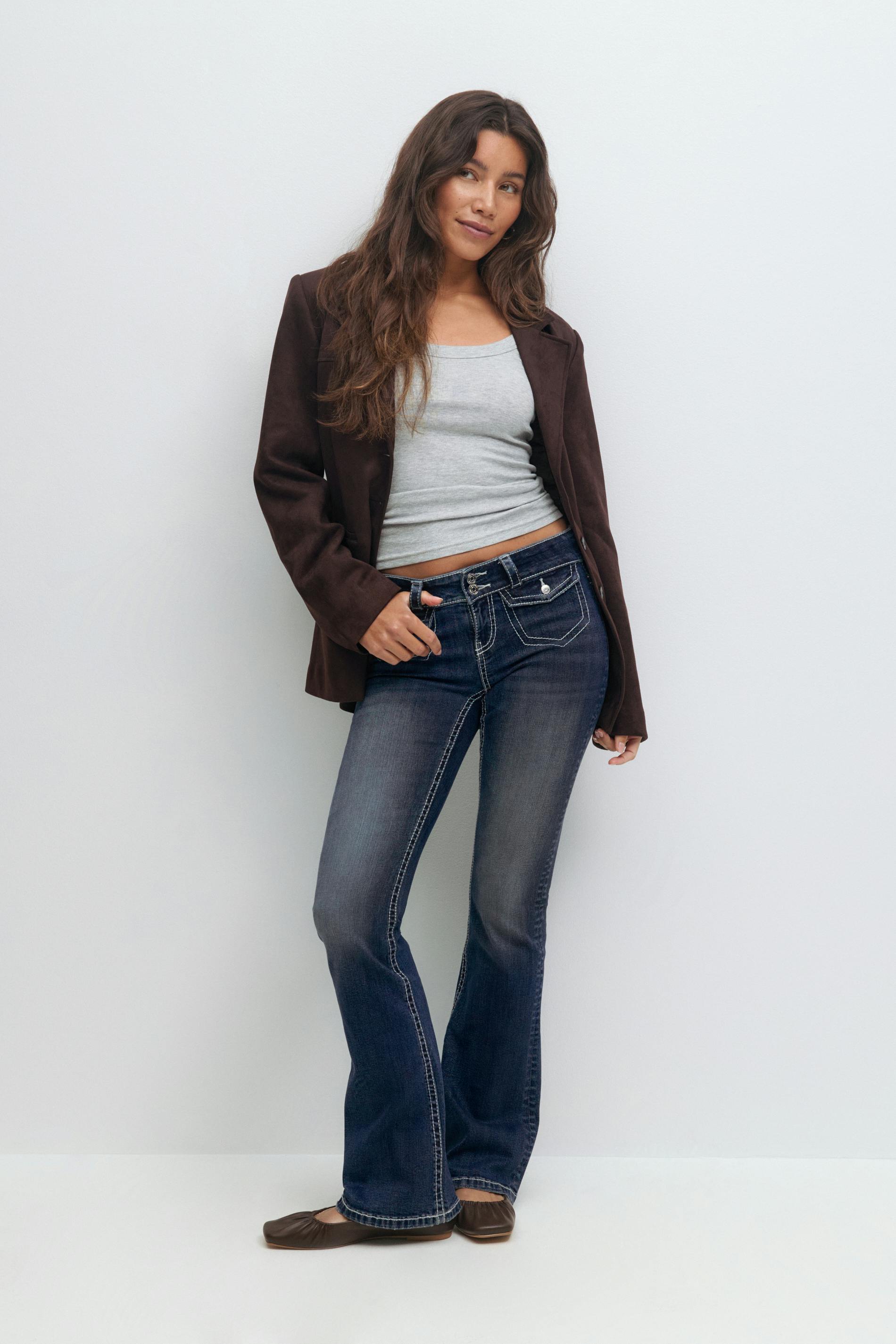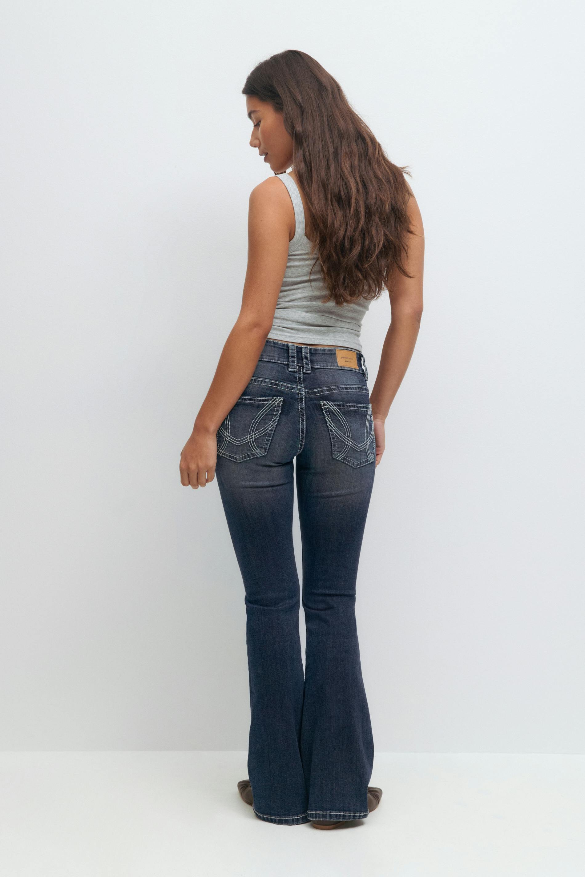Non-stretch boot cut jeans with a low waist. The jeans are mid-blue and have flap pockets at the front with a button. They have back pockets with embroidery, a figure-hugging fit, a zip fly and regular length.
