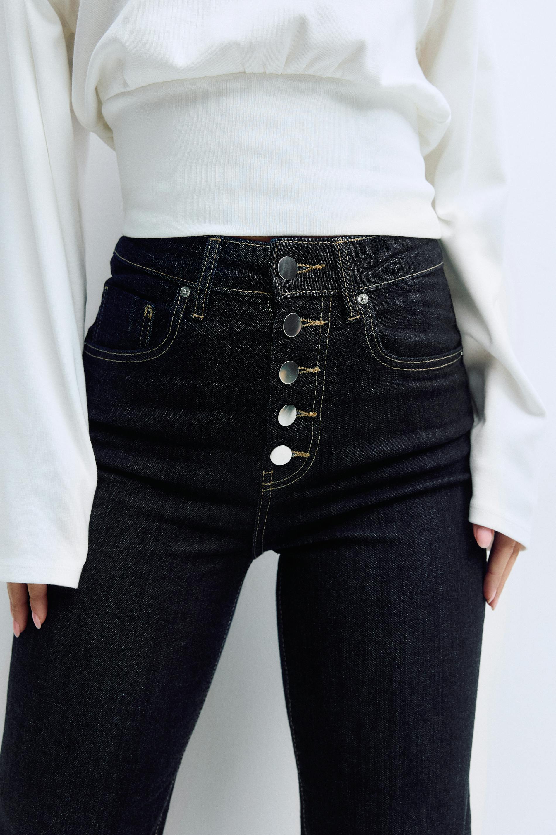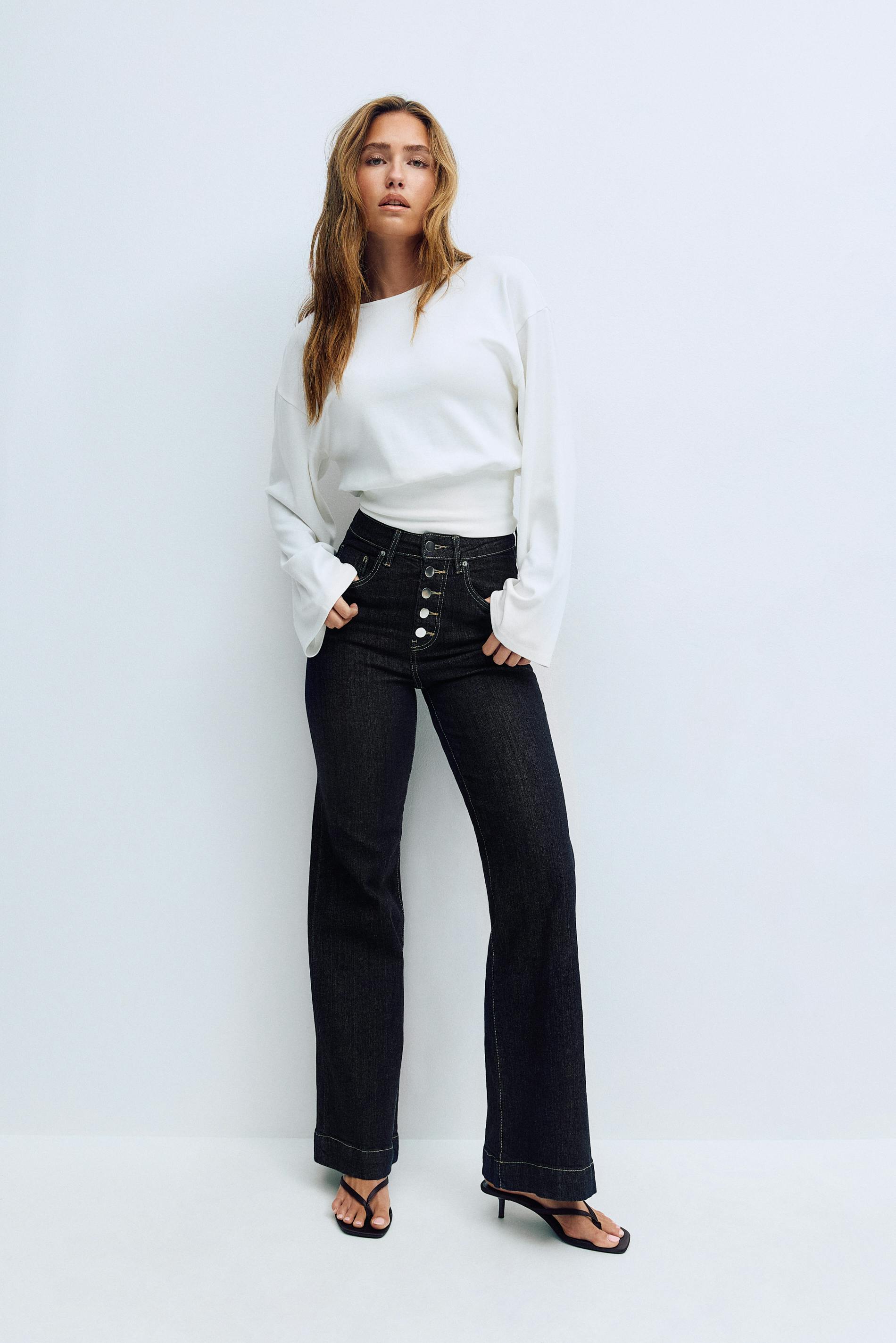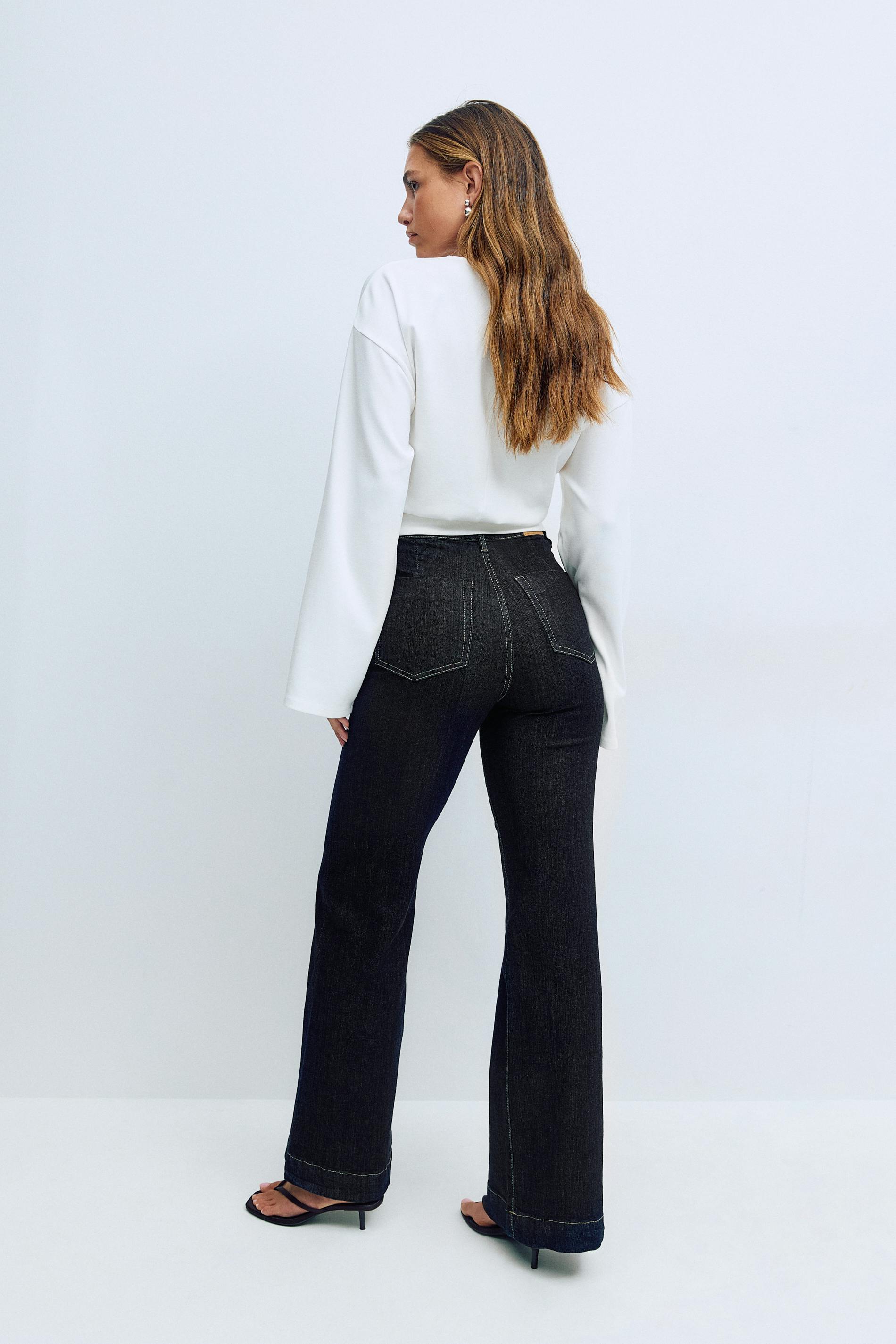 Flare jeans with button fly closure. The jeans are dark blue and have high waist. They have flared legs with regular length, stretchy material, figure-hugging fit and pockets at the front and back. Use our size guide to find your size.