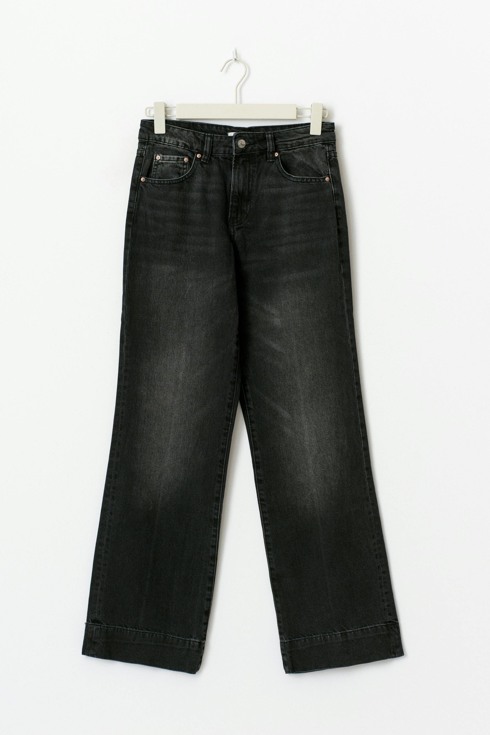 Petite jeans with a non-stretch regular waist. The jeans are black-grey and have straight legs. They have a zip fly, pockets at the front and back and wide leg ends. Perfect for those who are 160 cm (5 ft 3 in.) or shorter.
