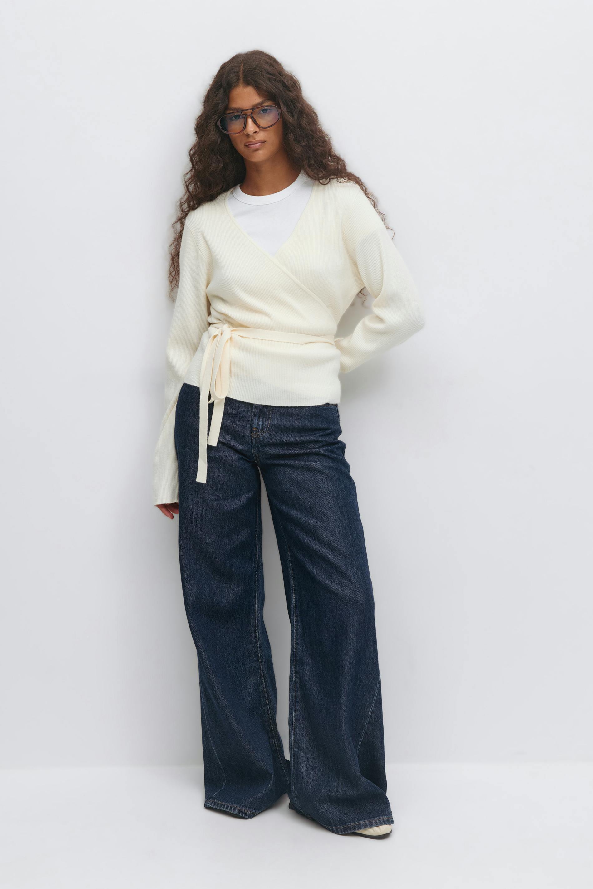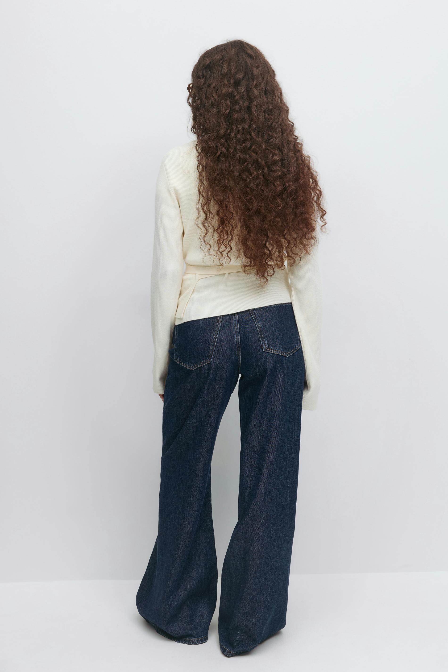 Jeans utan stretch med en hög midja. Jeansen är mörkblåa och har vida ben. De har en vriden söm nedtill, en knäppning i sidorna, en dragkedjegylf och fickor fram och bak.