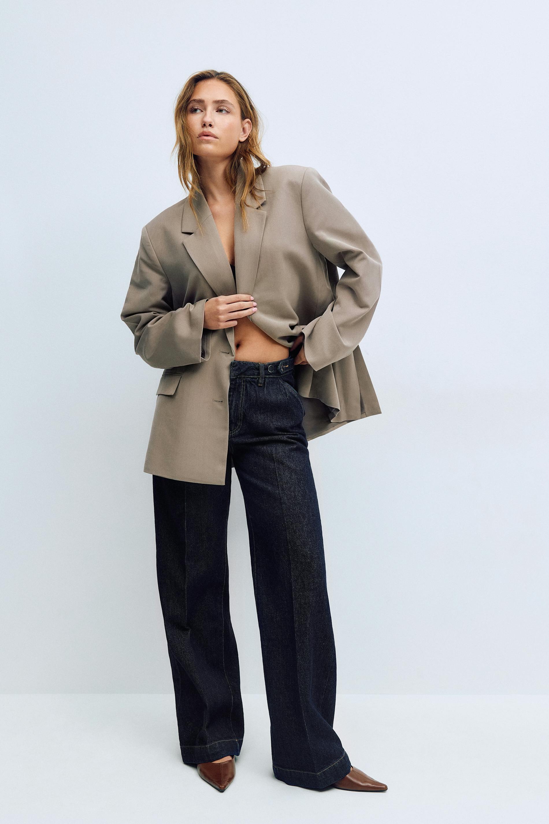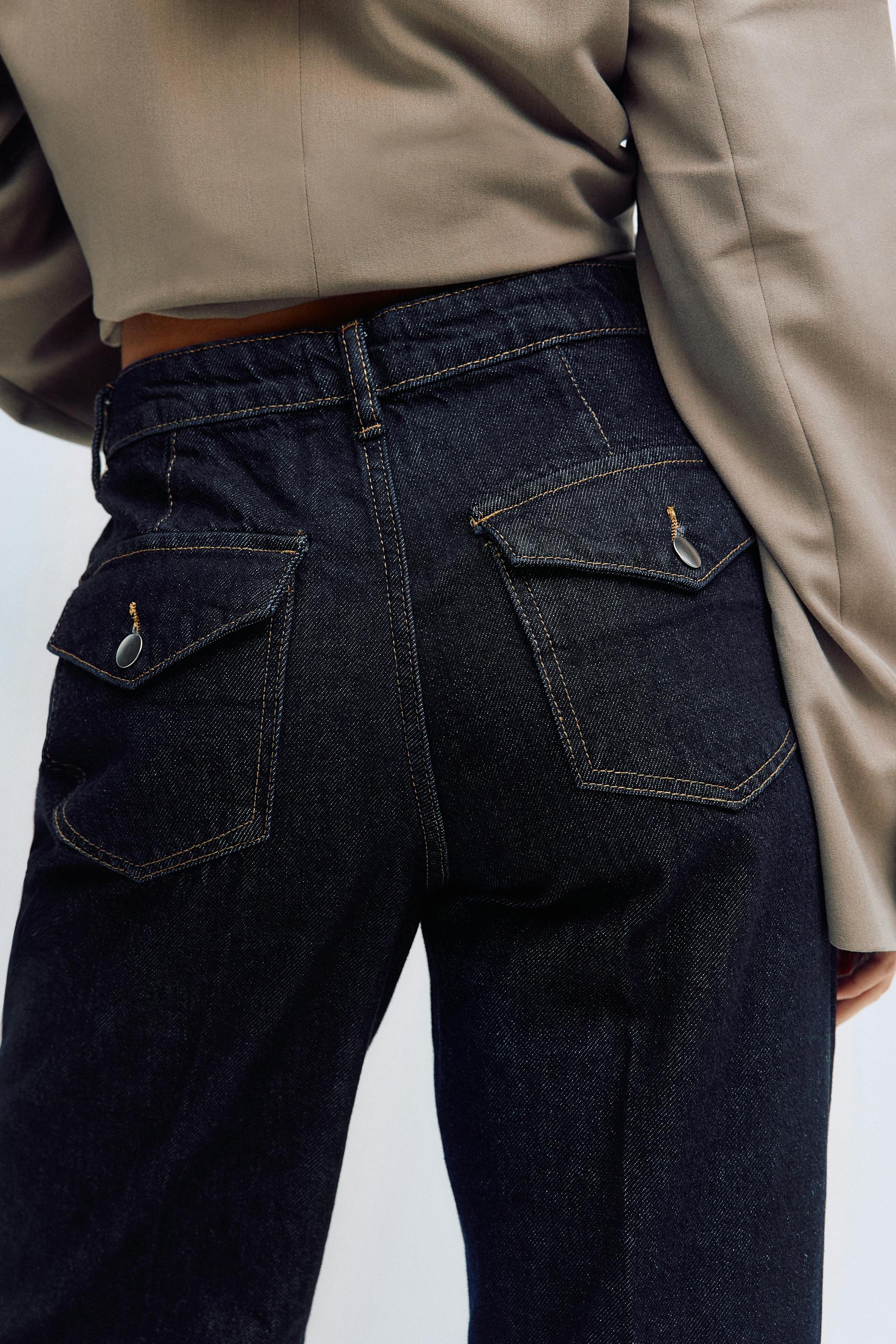 Vida jeans med pressveck. Jeansen är mörkblåa och har medelhög midja. De har sidofickor, bakfickor med lock och knapp, vida ben med fullängd, dragkedjegylf och normal passform. Utan stretch. Se gärna vår storleksguide för att hitta din storlek.