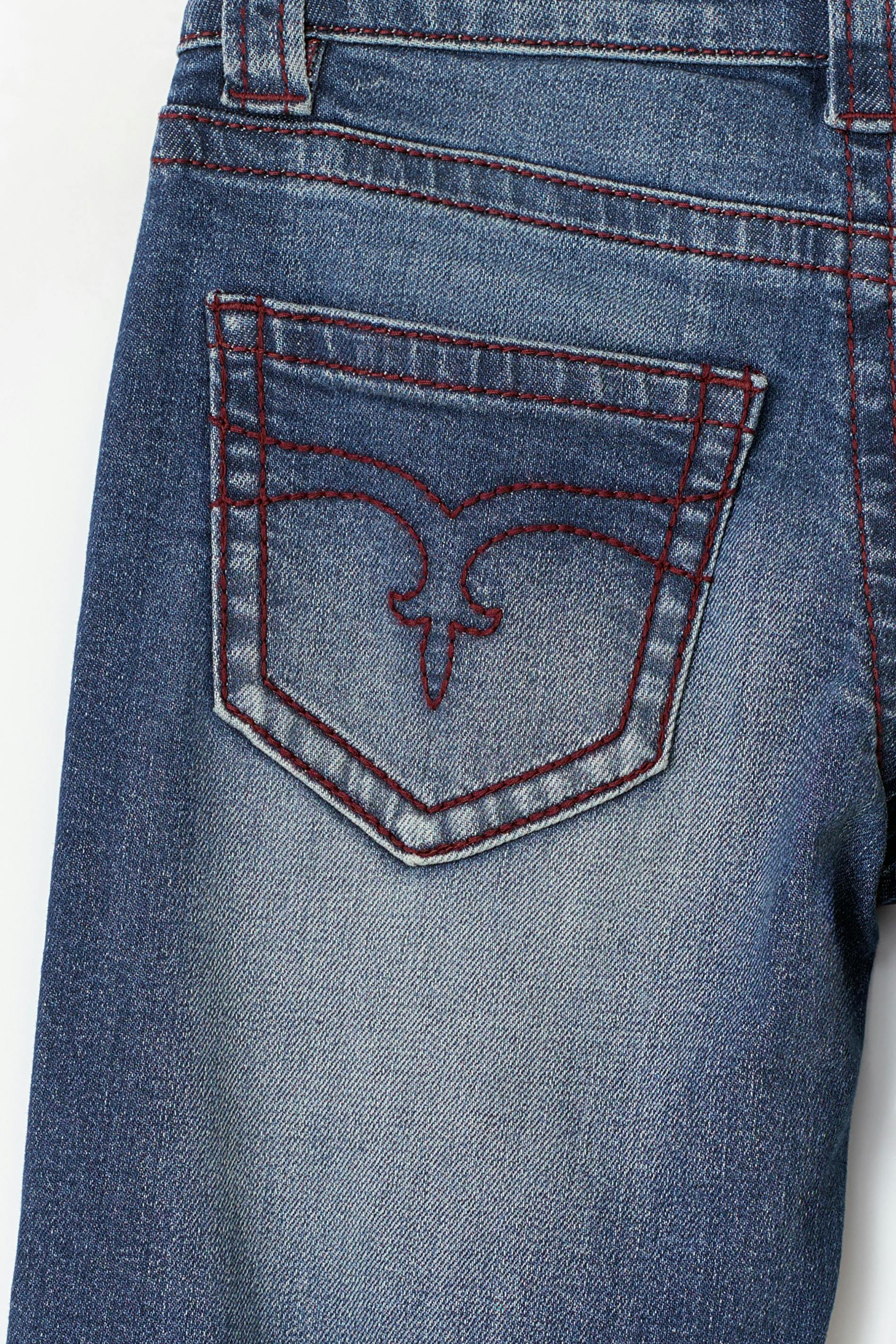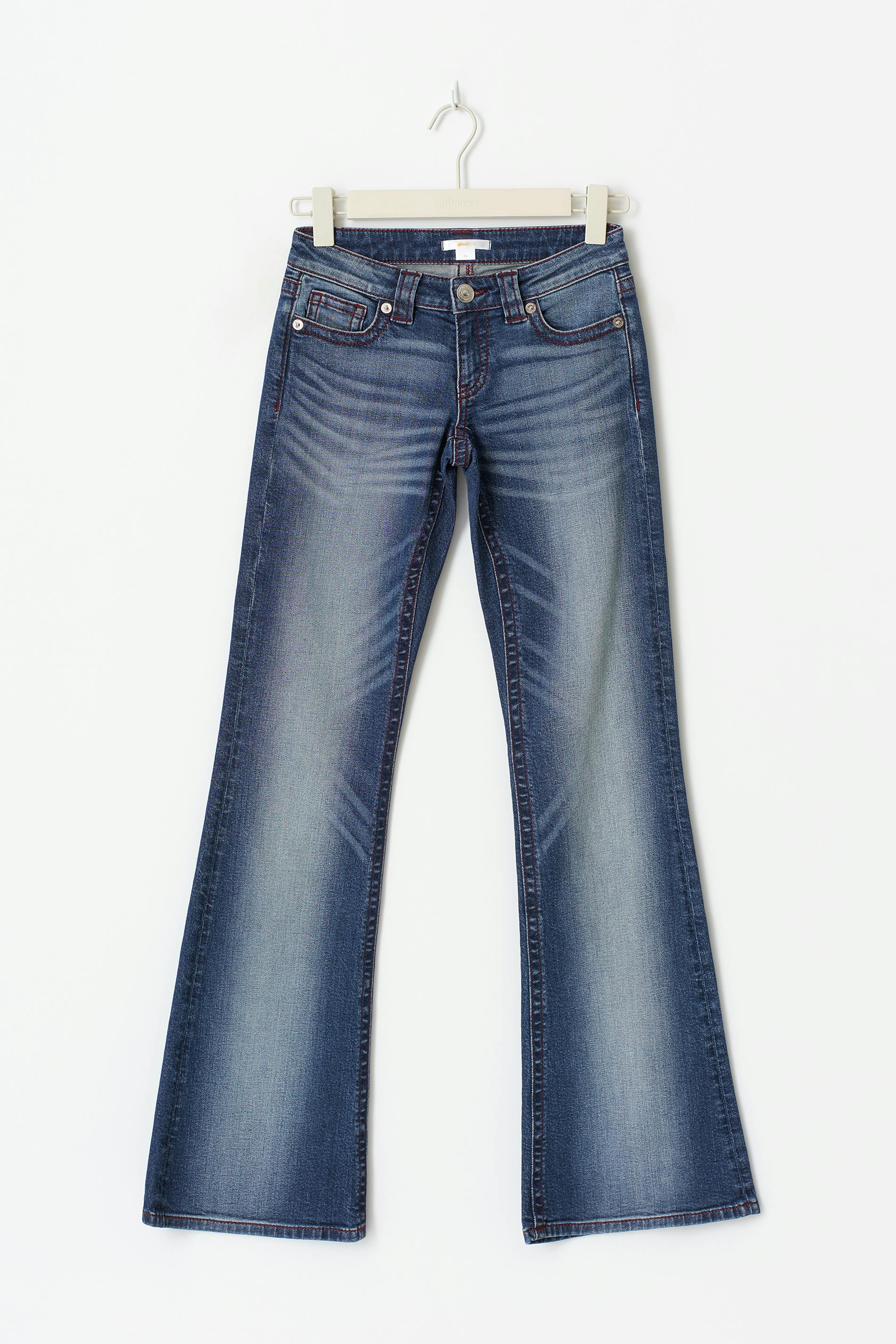 Low waist jeans med utsvängda ben. Jeansen har bakfickor med ett broderi. De har en normallängd, en dragkedjegylf och en knapp på framsidan.