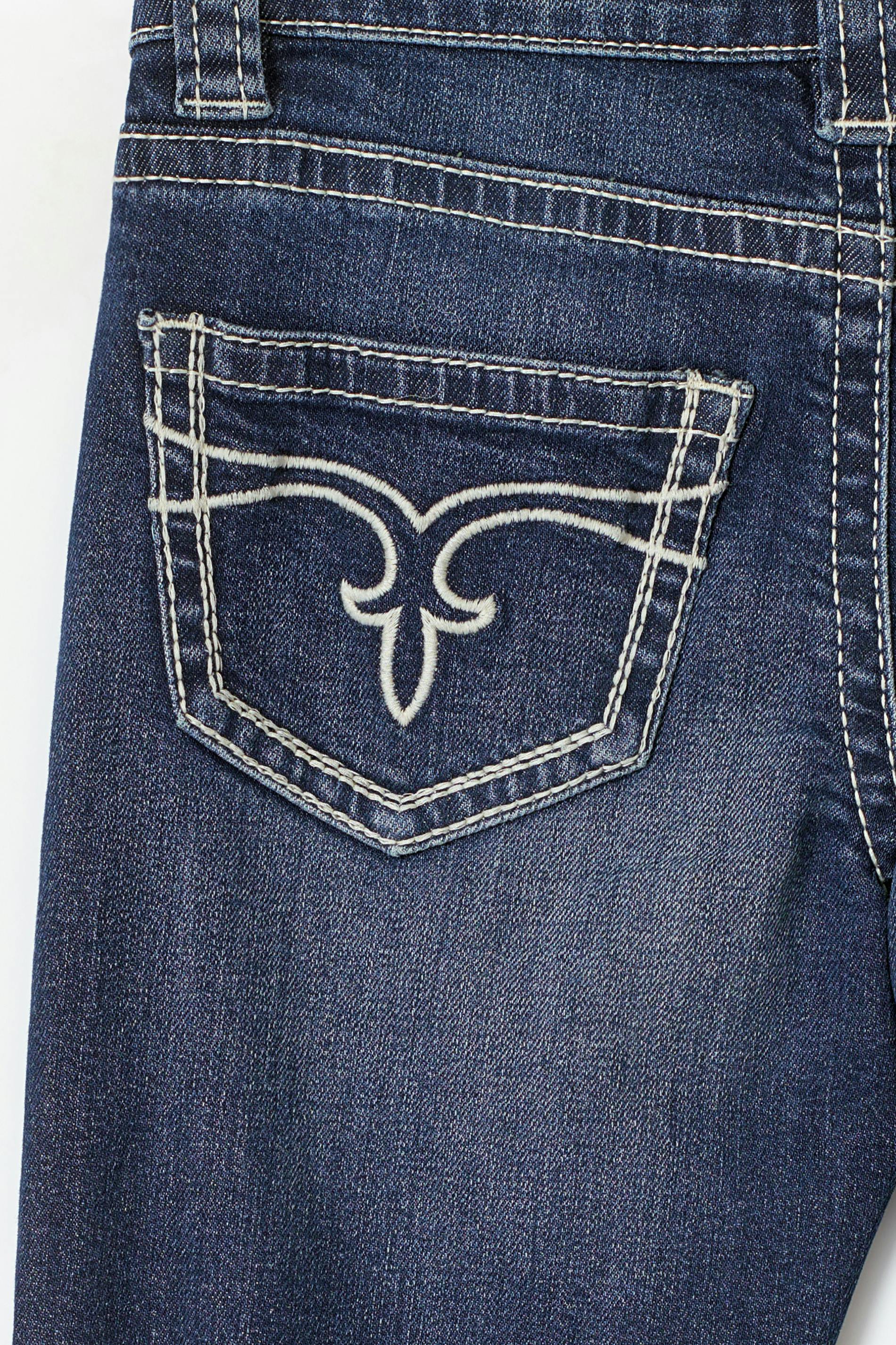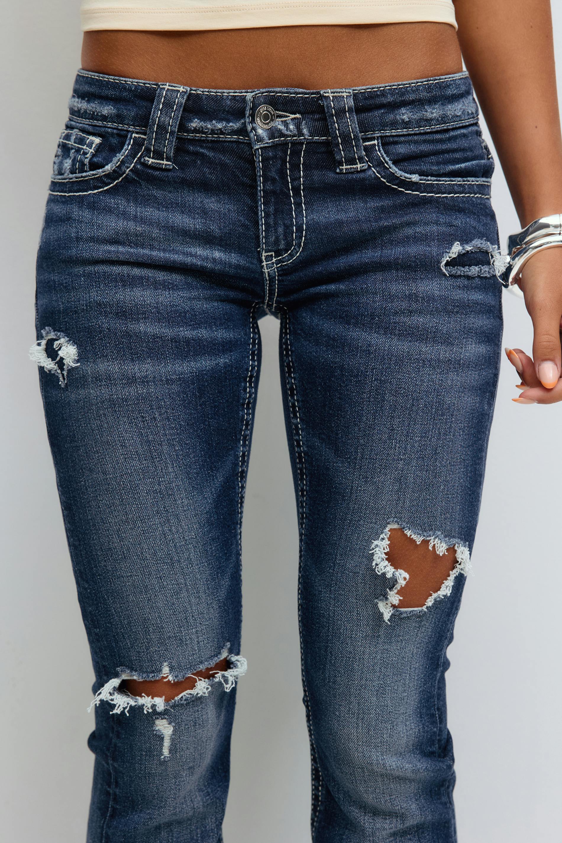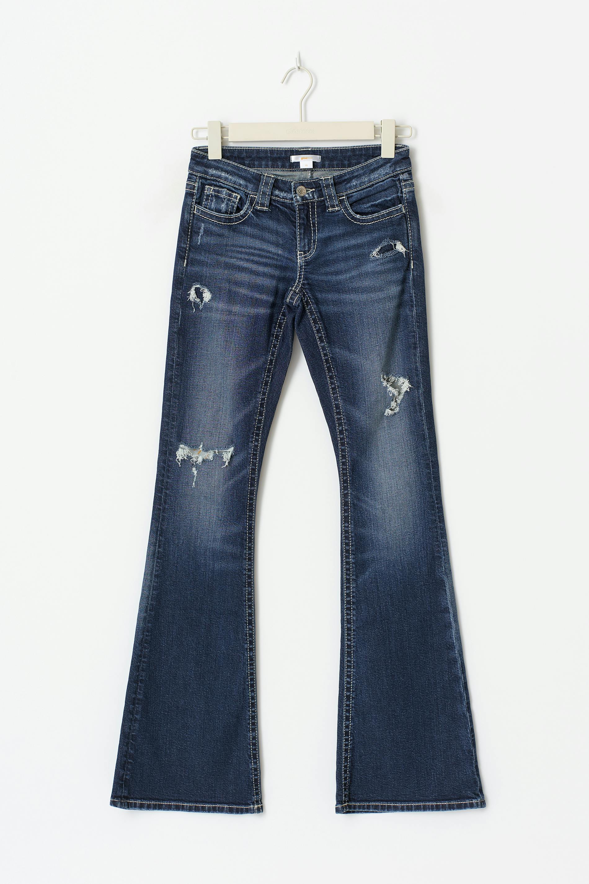 Low waist jeans med utsvängda ben. Jeansen har bakfickor med ett broderi. De har en normallängd, en dragkedjegylf och en knapp på framsidan.