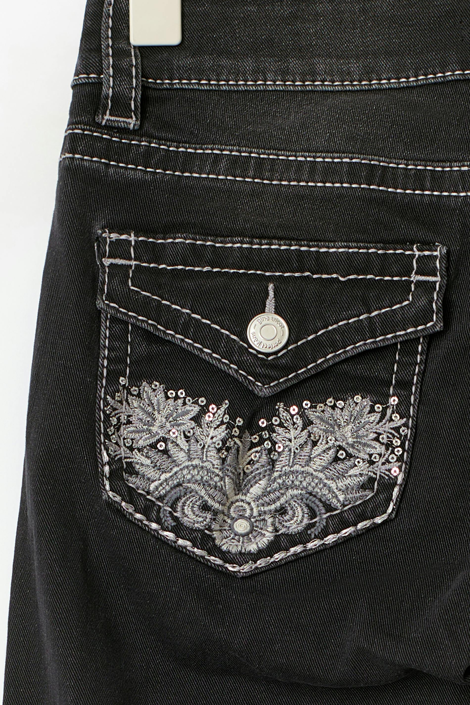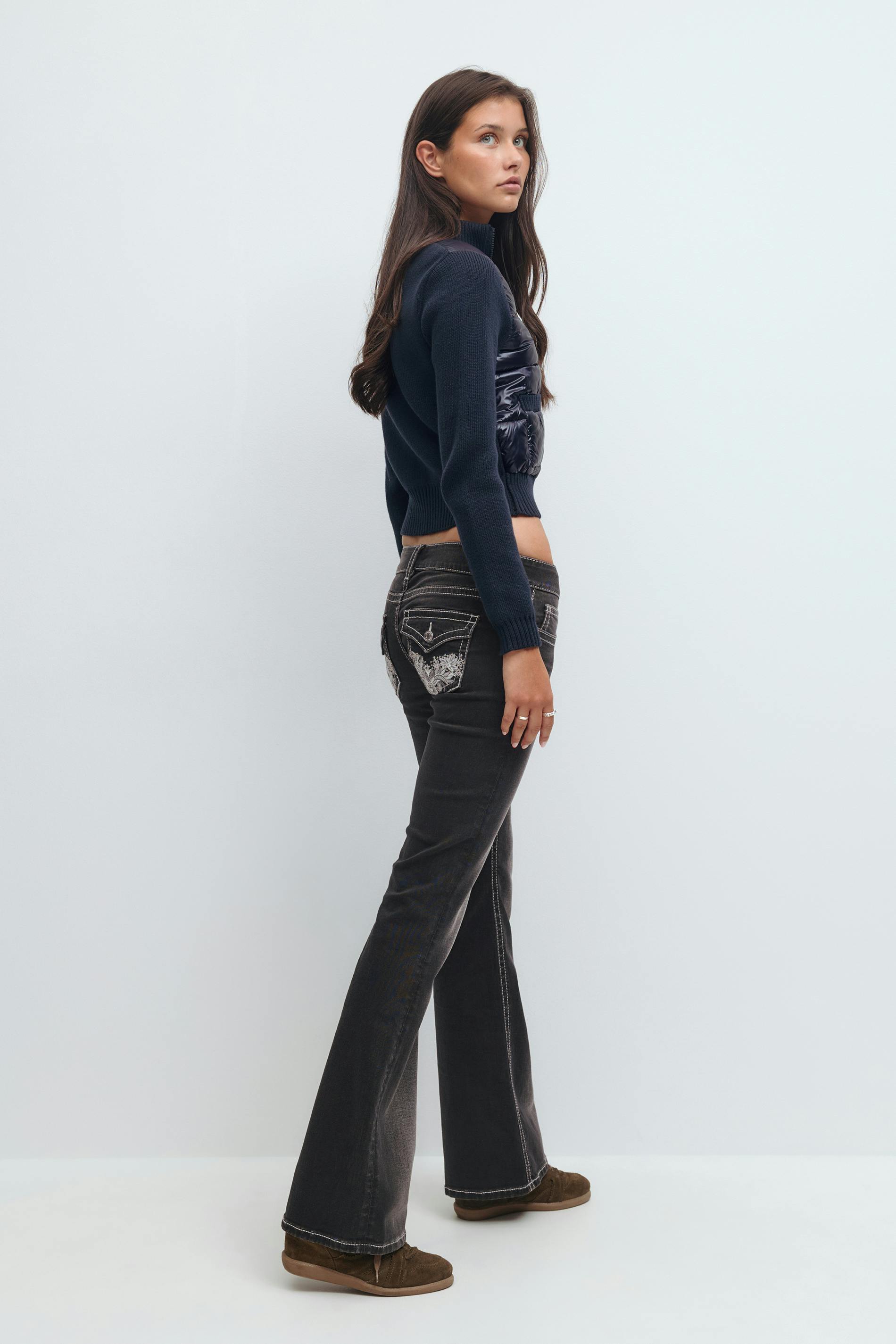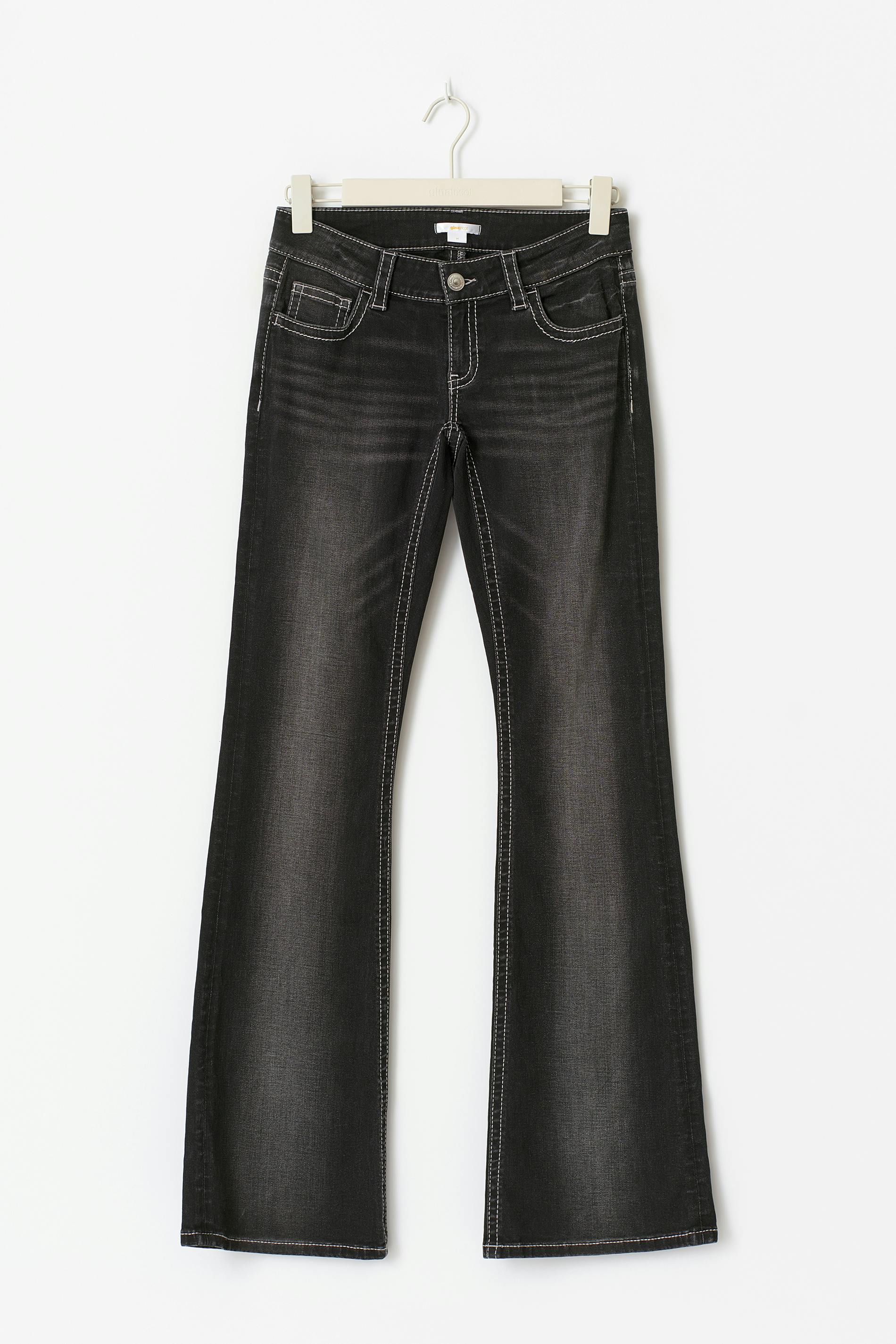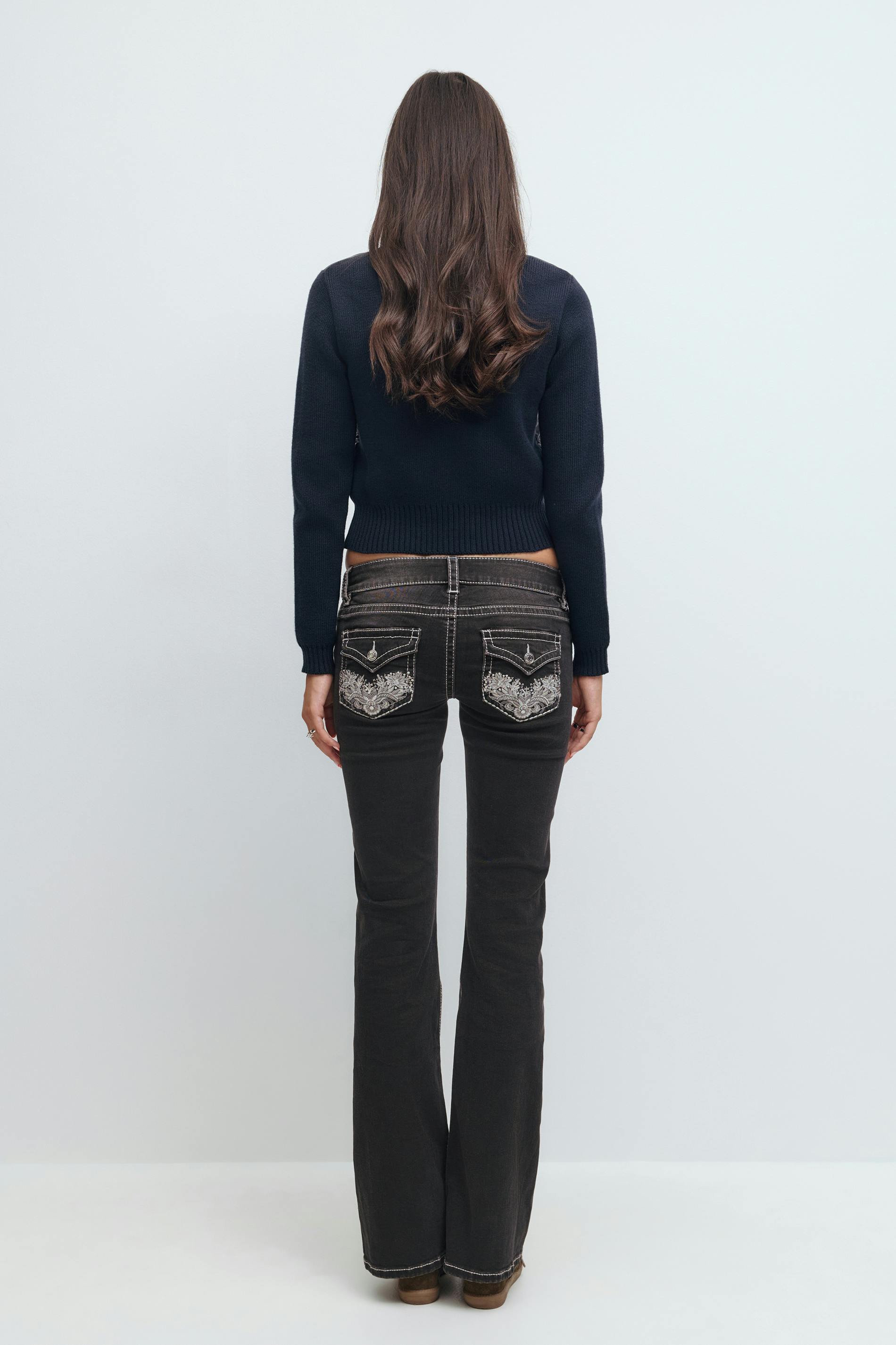 Flare jeans med låg midja. Jeansen är svartgråa och har broderade bakfickor med paljetter. De är gjorda av denim med låg stretch och har utsvängda ben, figurnära passform och en normallängd.