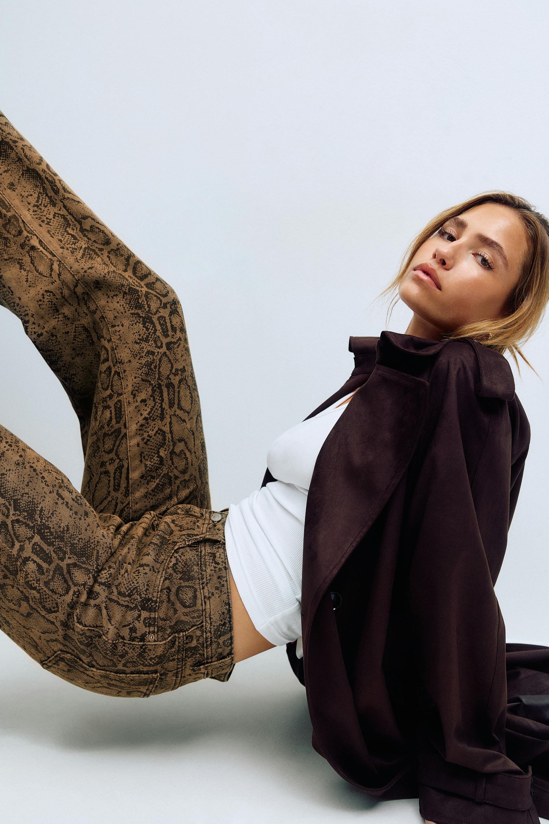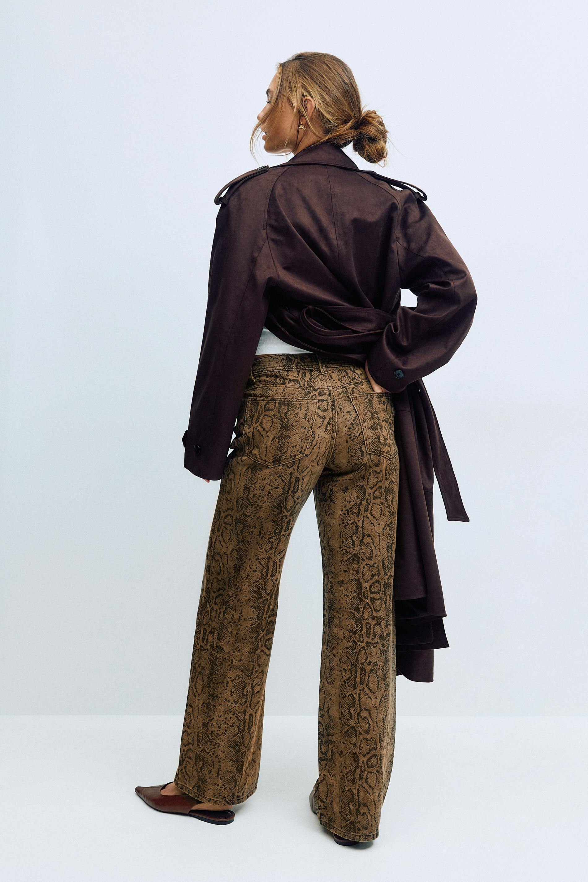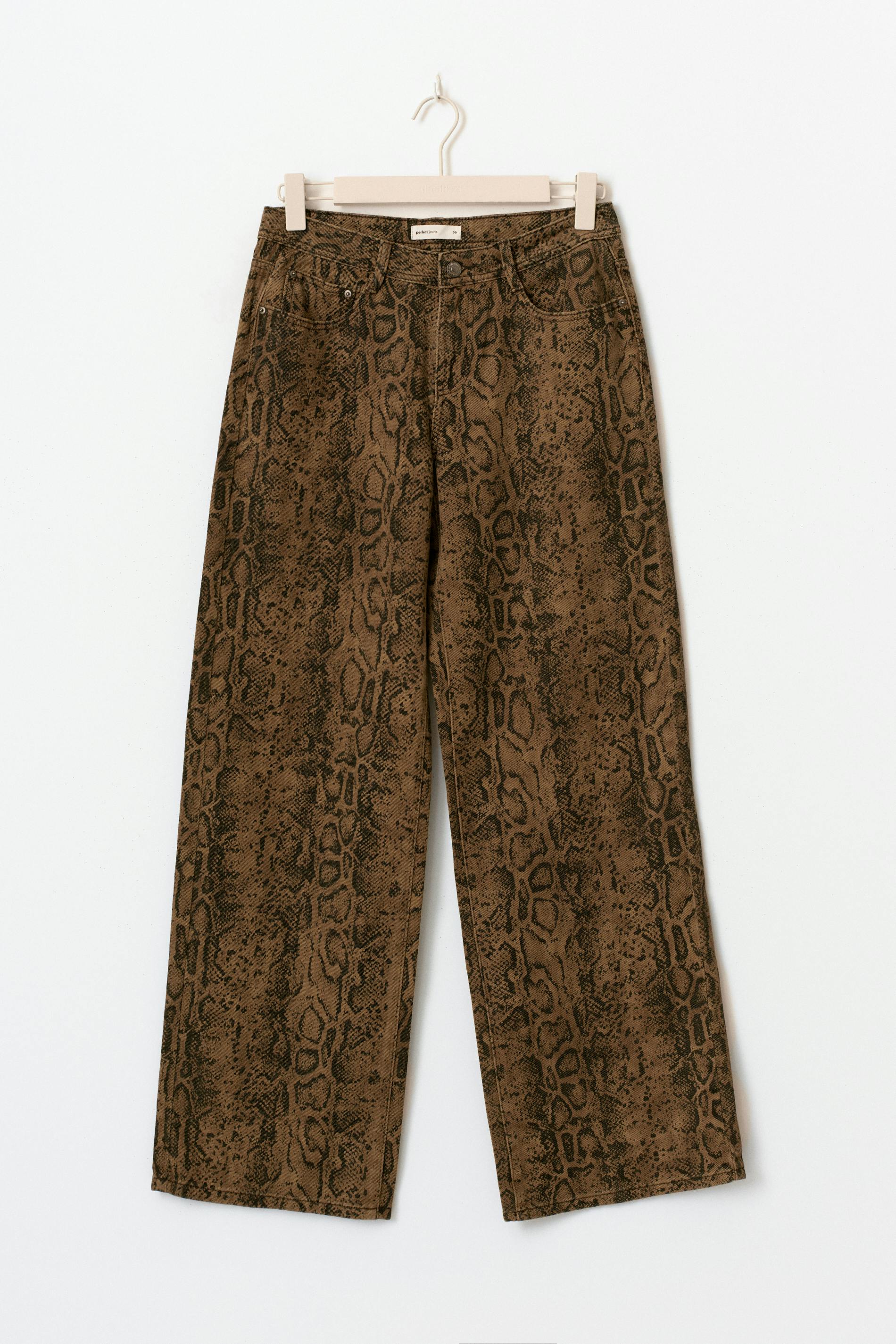 Ormskinnsmönstrade jeans med medelhög midja i denim utan stretch. Jeansen är bruna och har vida ben med fullängd. De har normal passform, bälteshällor, dragkedjegylf och fickor fram och bak. Se gärna vår storleksguide för att hitta din storlek.