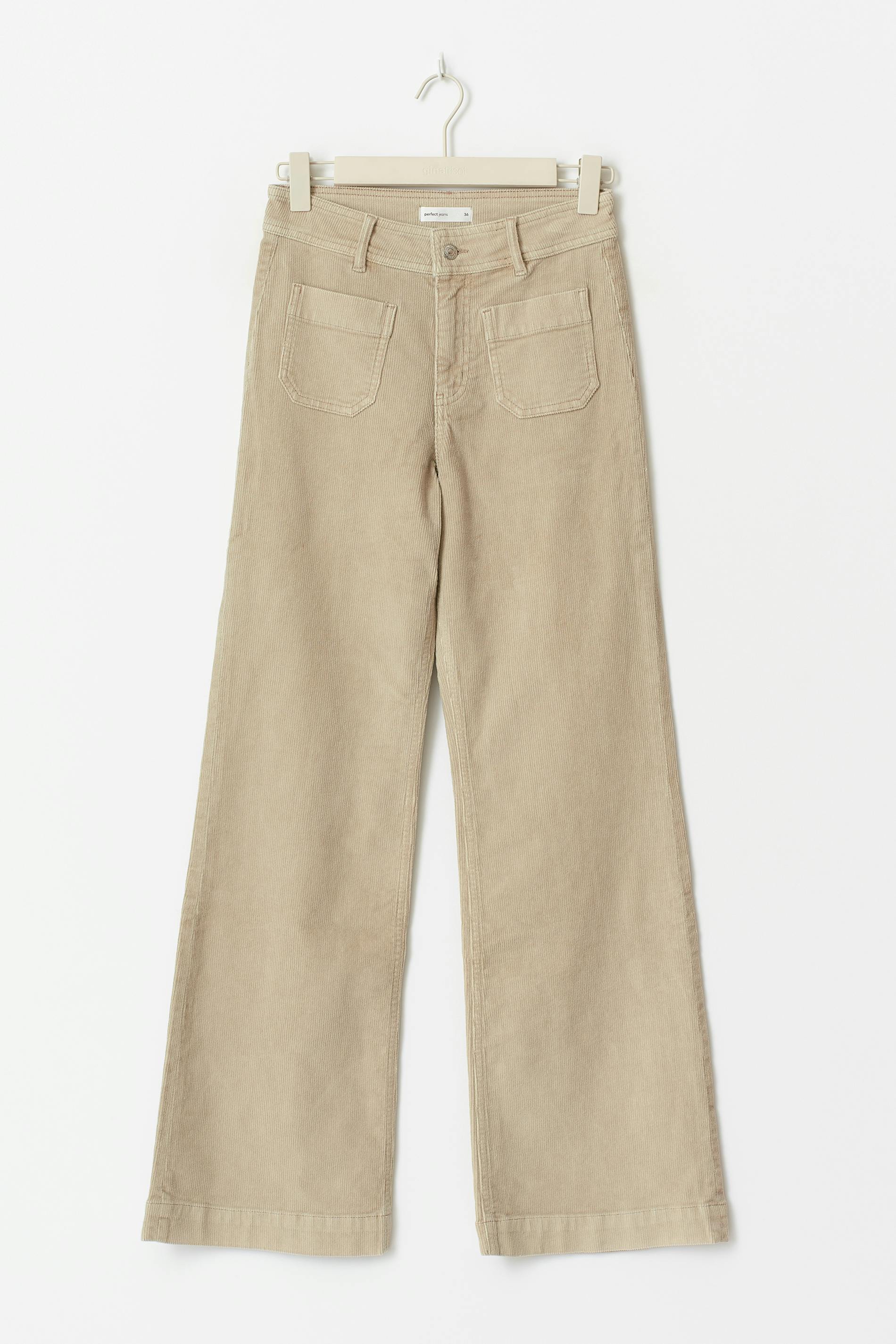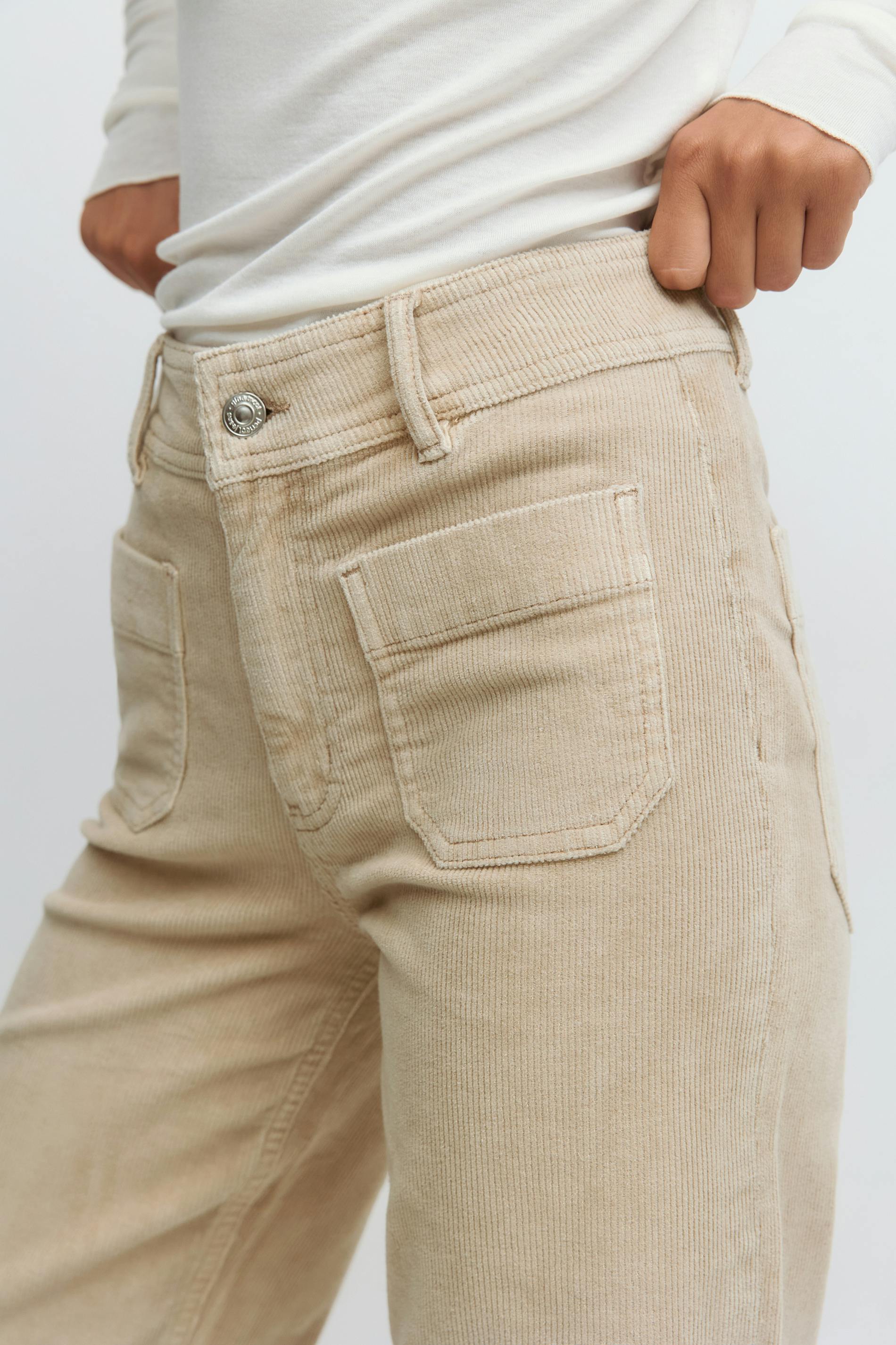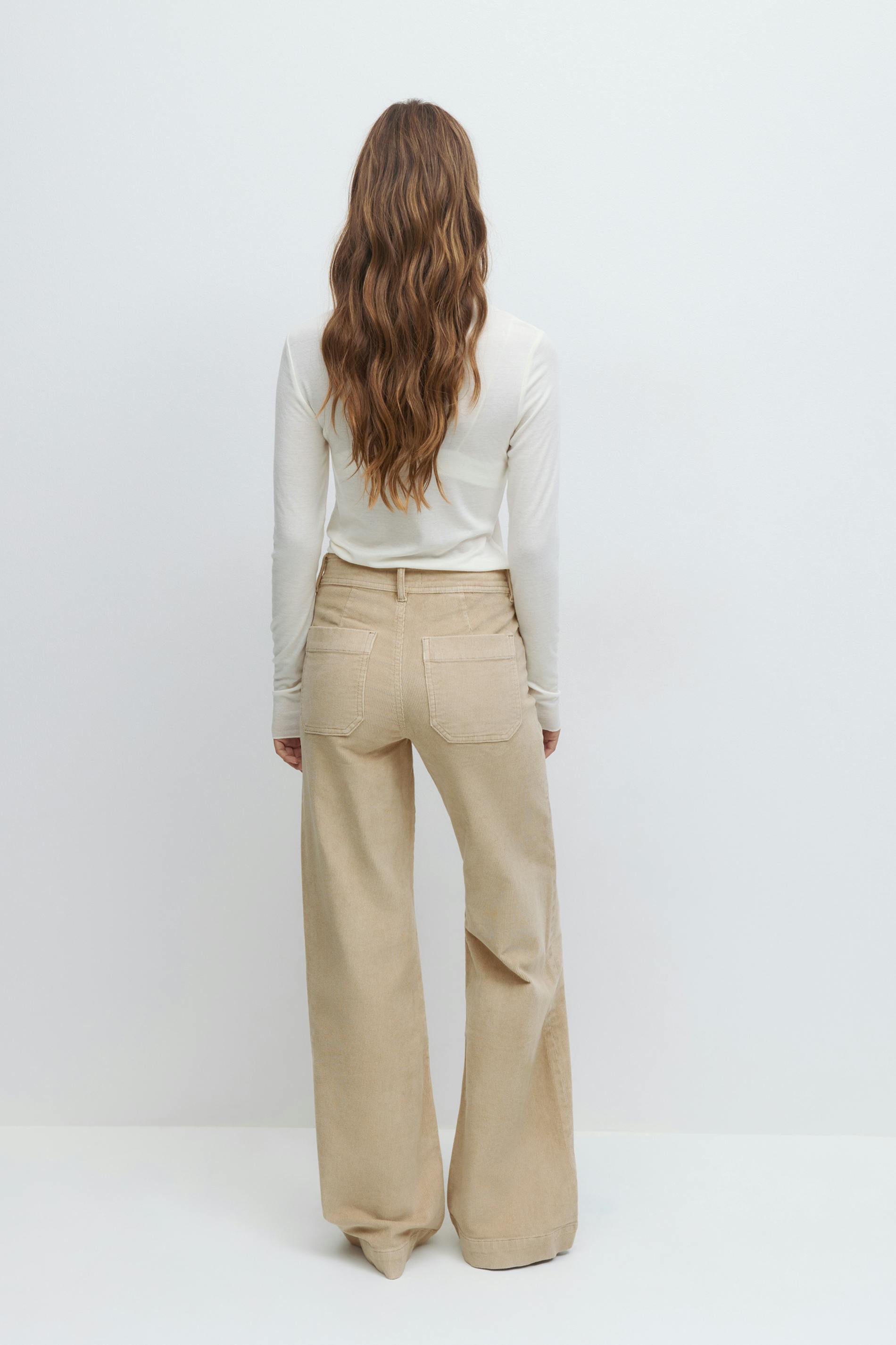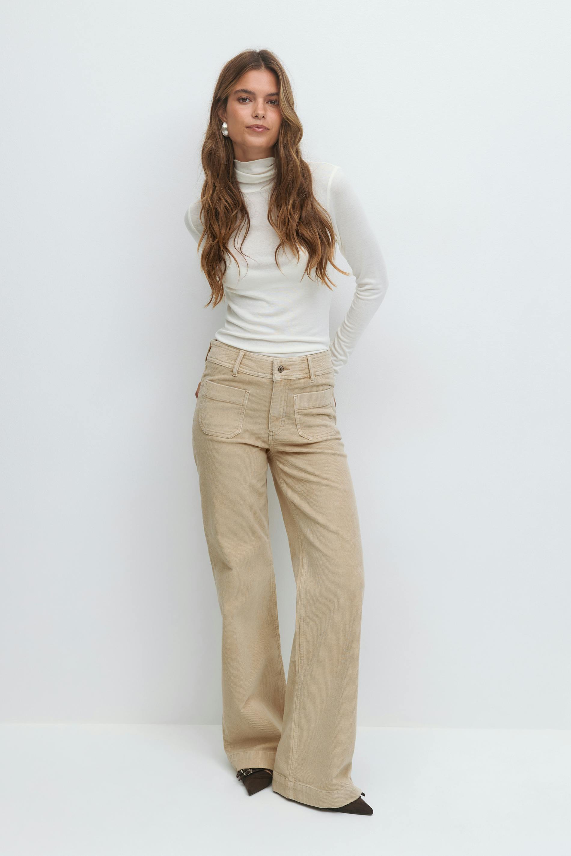Manchesterbyxor med påsydda framfickor. Byxorna är gula och har hög midja. De har utsvängda ben, figurnära passform, stretchig kvalitet, bakfickor och bälteshällor.