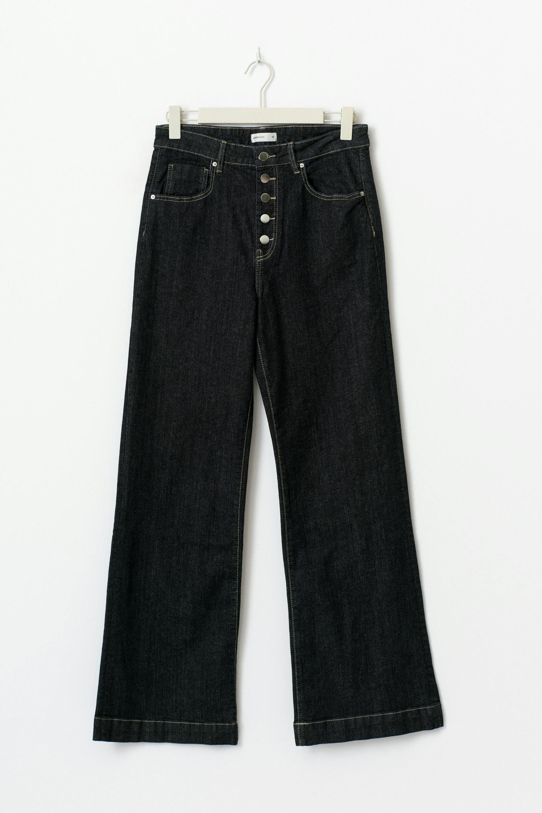 Petite flare jeans with button fly closure. The jeans are dark sapphire and have high waist. They have flared legs with regular length, stretchy material, figure-hugging fit and pockets at the front and back. Perfect for those who are 160 cm (5 ft 3 in.)