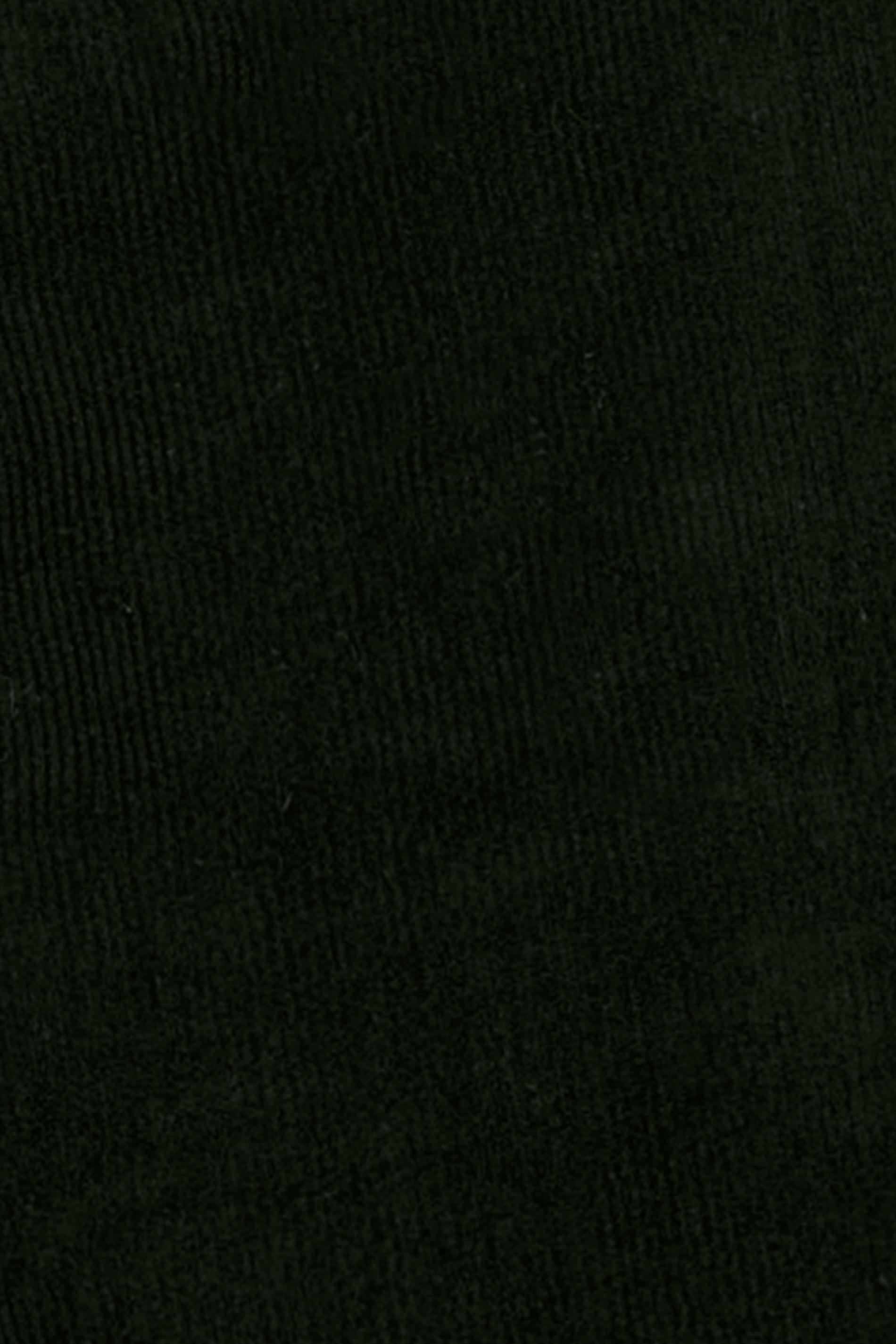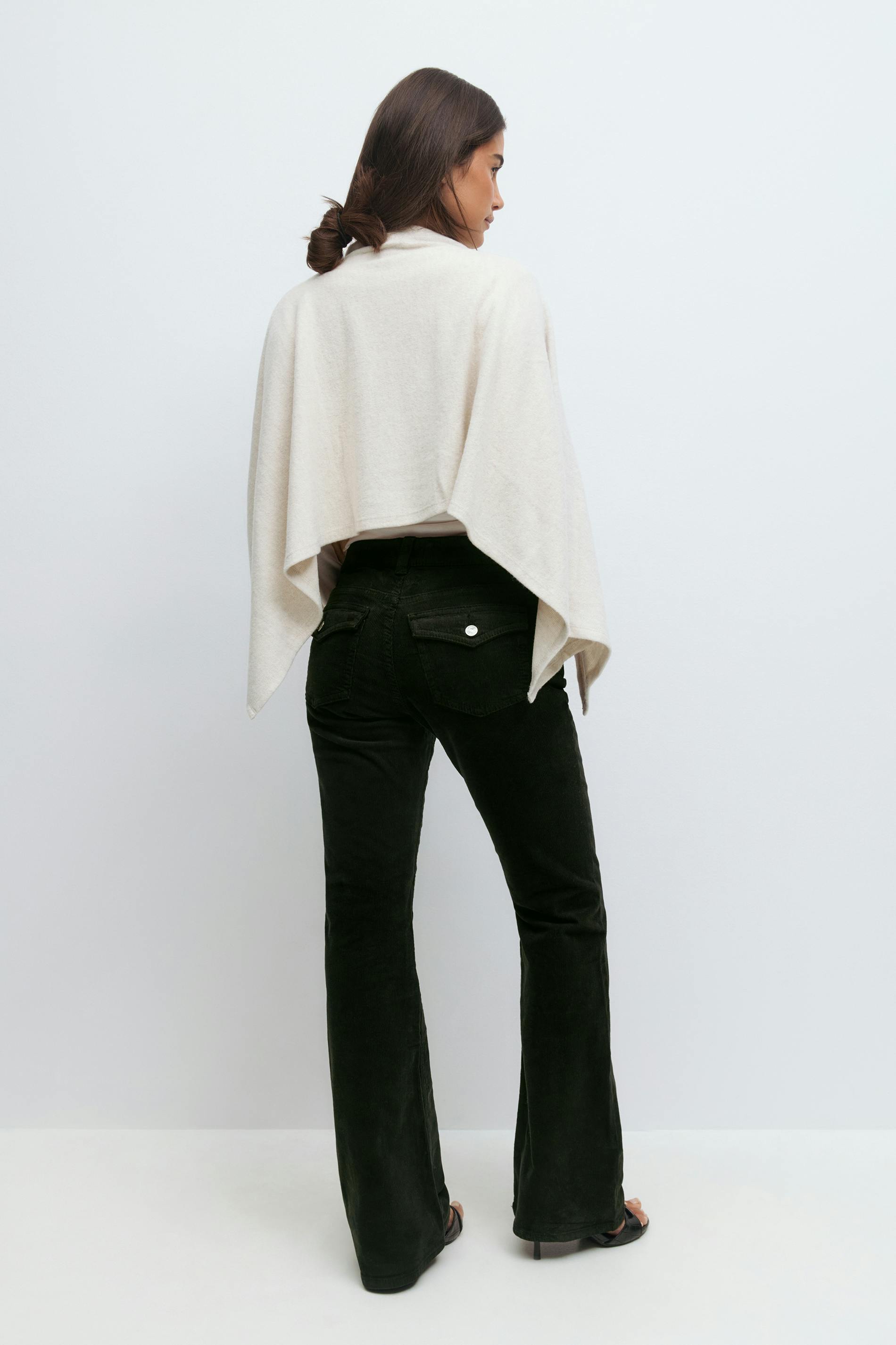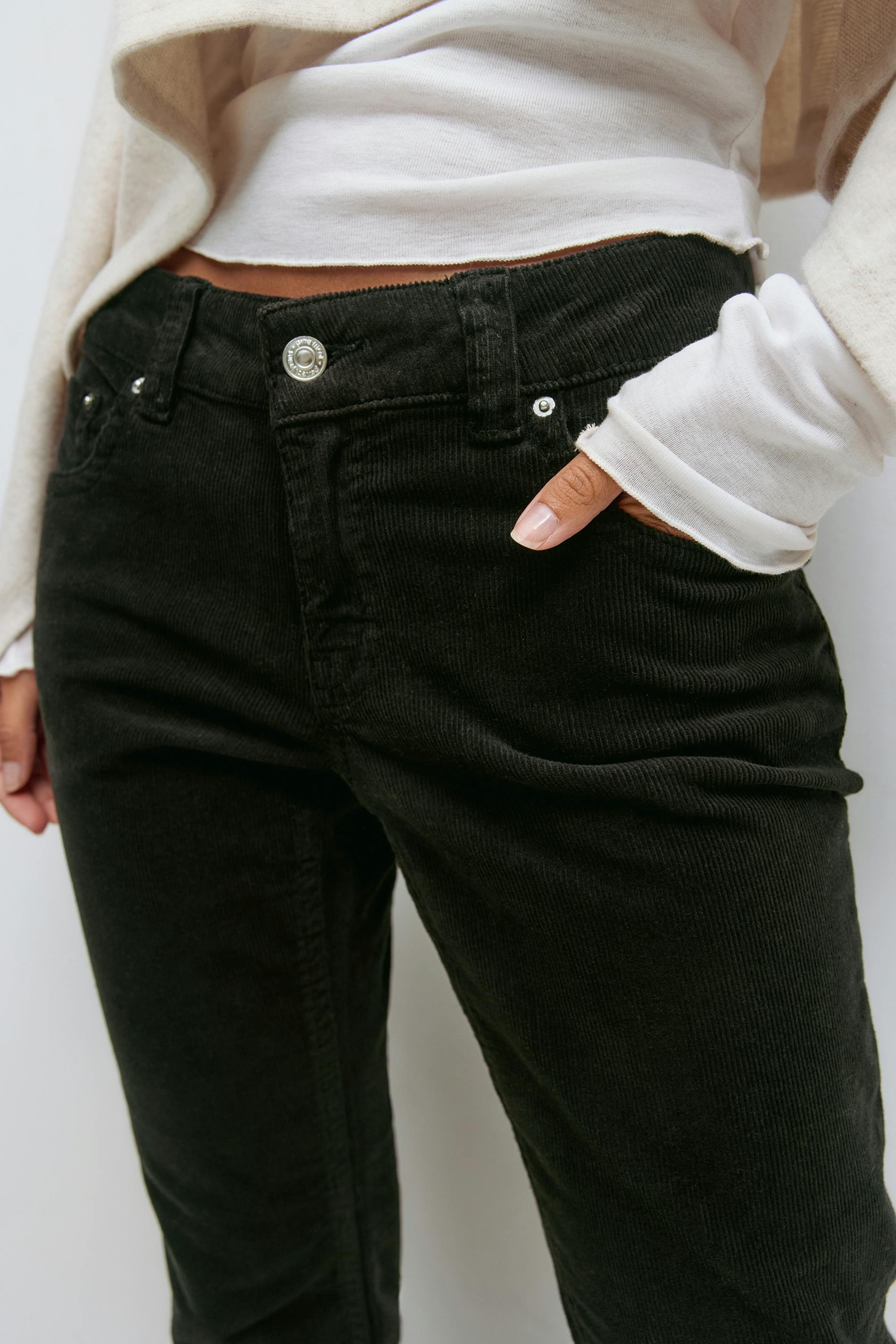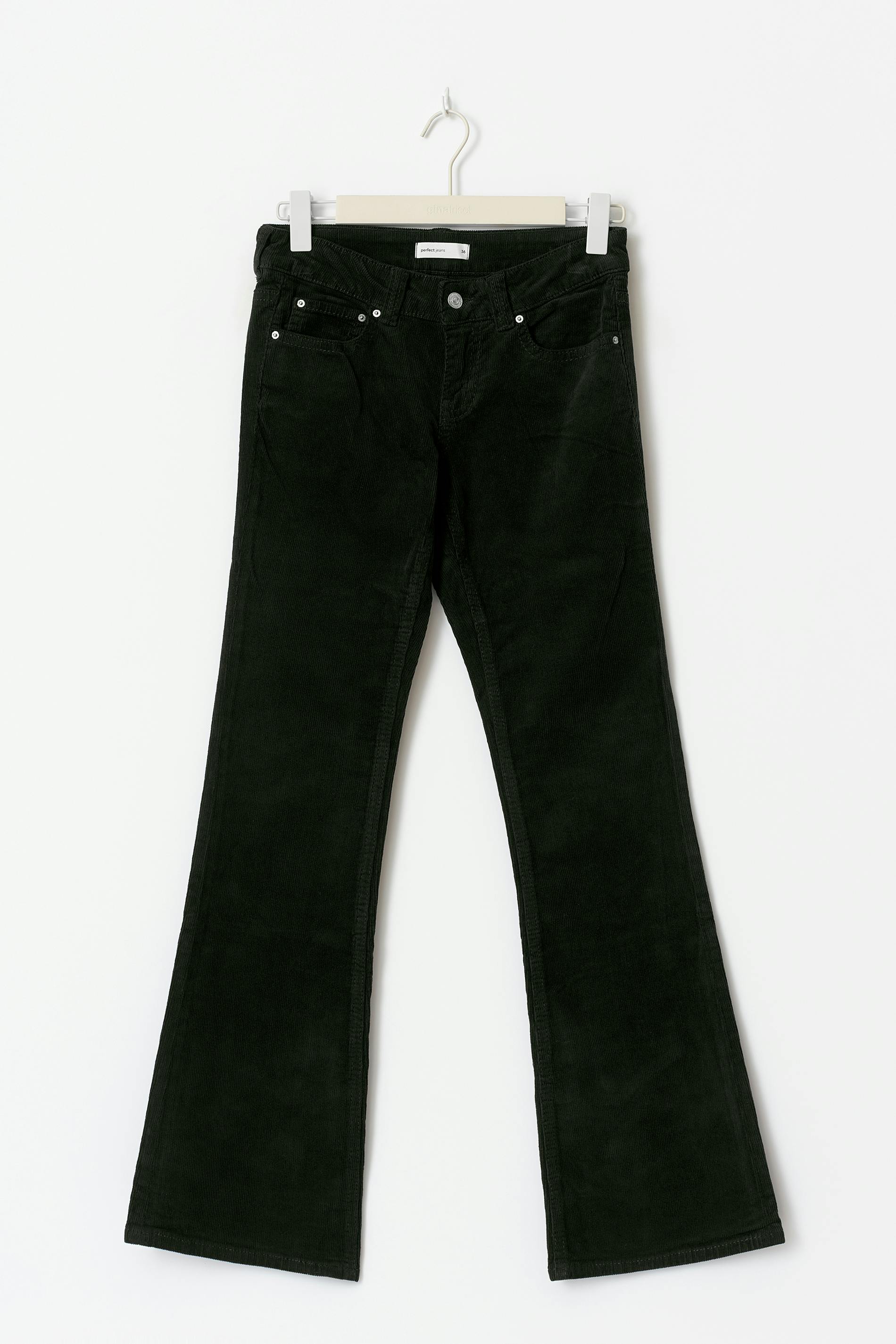Utsvängda manchesterbyxor med låg midja. Byxorna är svarta och har bakfickor med knapp och lock. De har figurnära passform, framfickor, bälteshällor och dragkedjegylf.