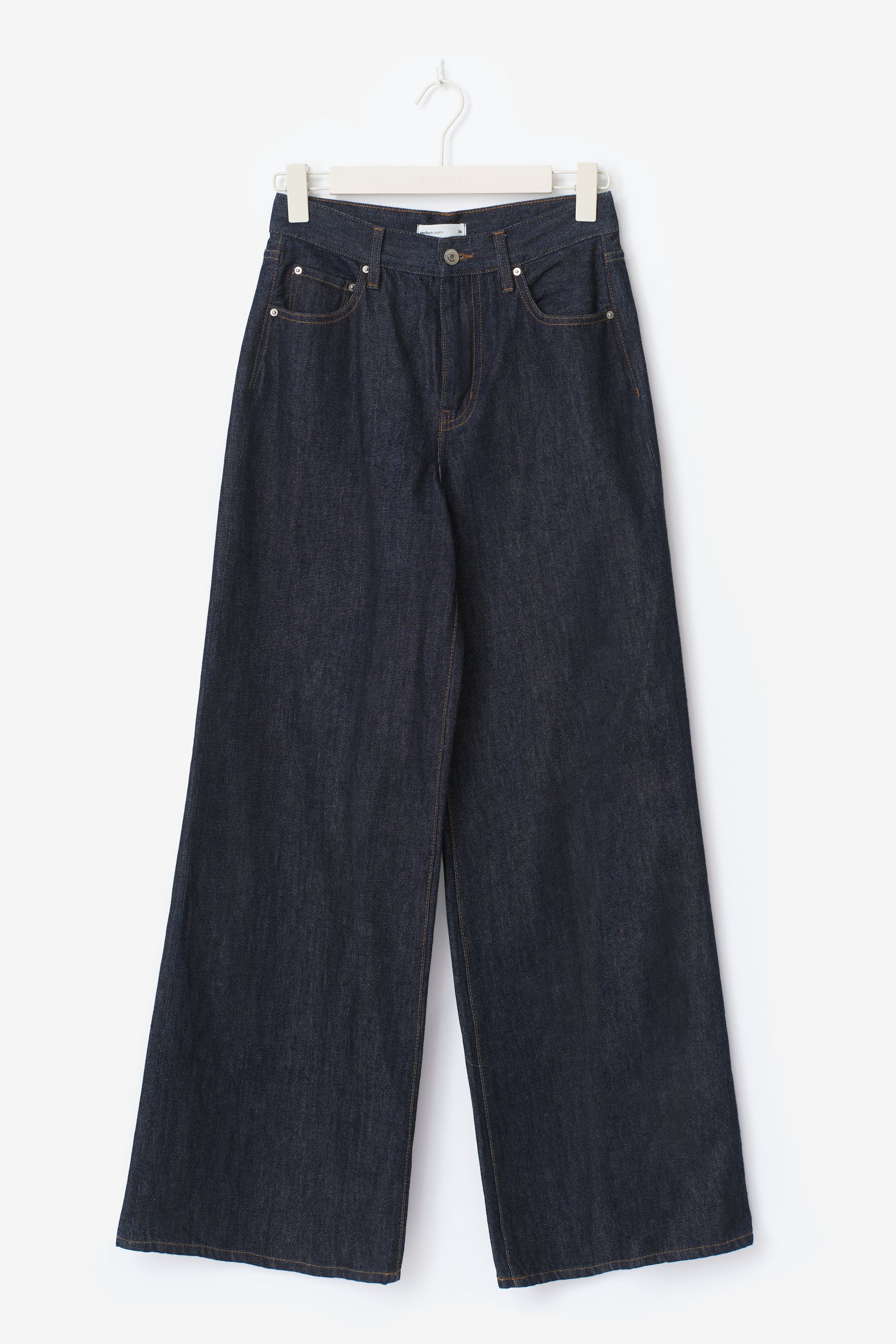 Tall jeans med extra långa ben. Jeansen är mörkblåa och har superhög midja. De har vida ben med fullängd, dragkedjegylf och fickor fram och bak. Utan stretch. Passar för dig som är 175 cm eller längre. Se gärna vår storleksguide för att hitta din storlek.