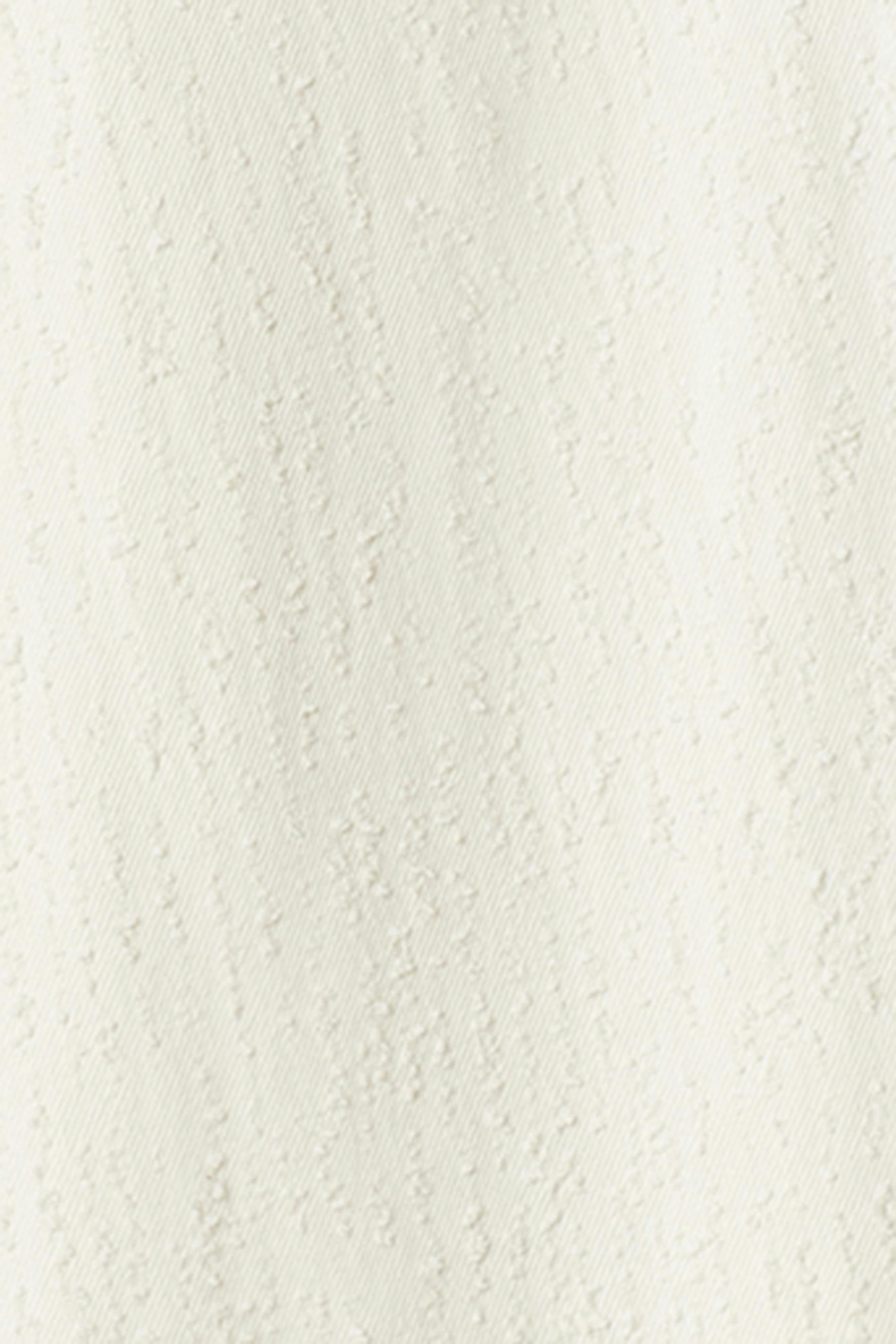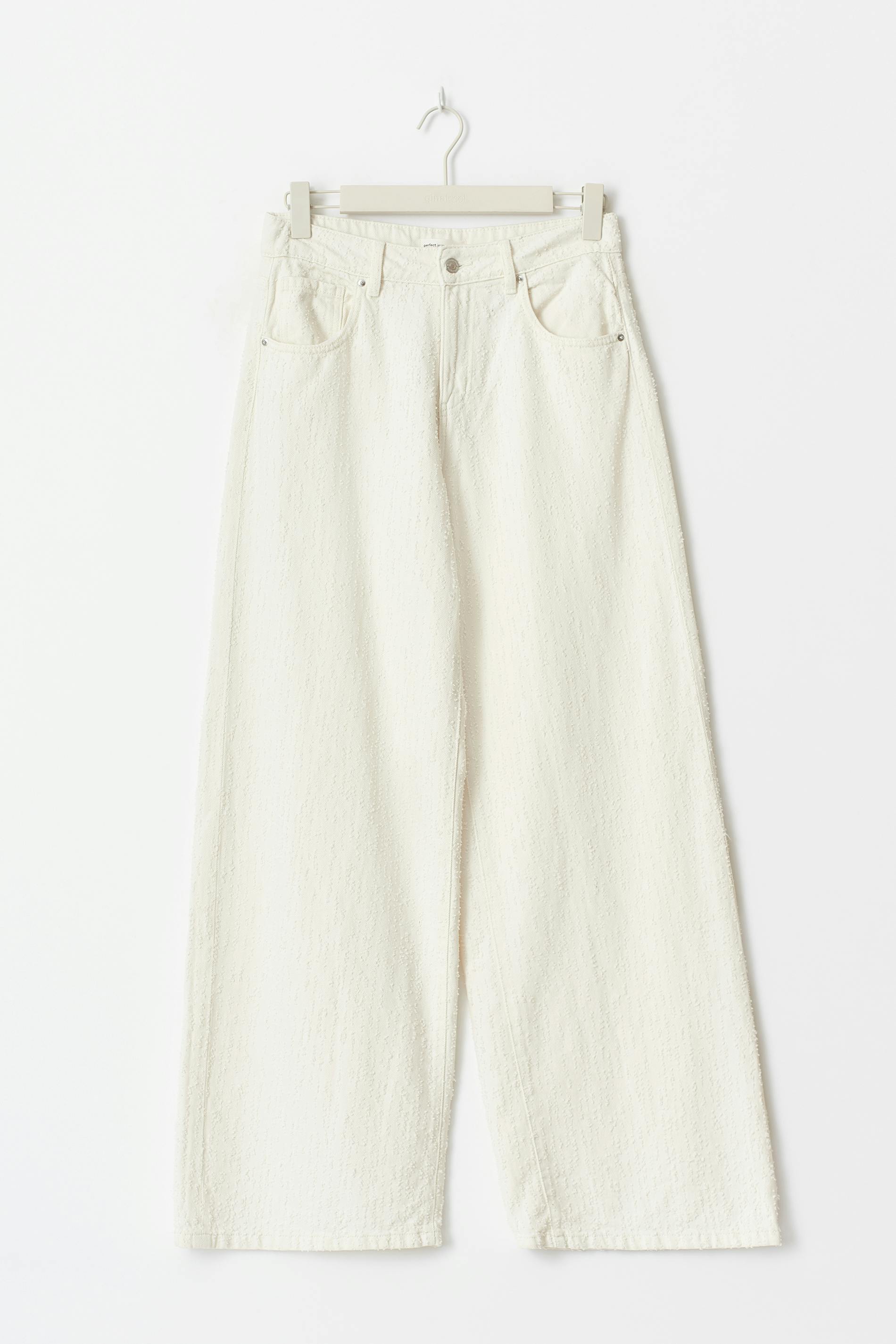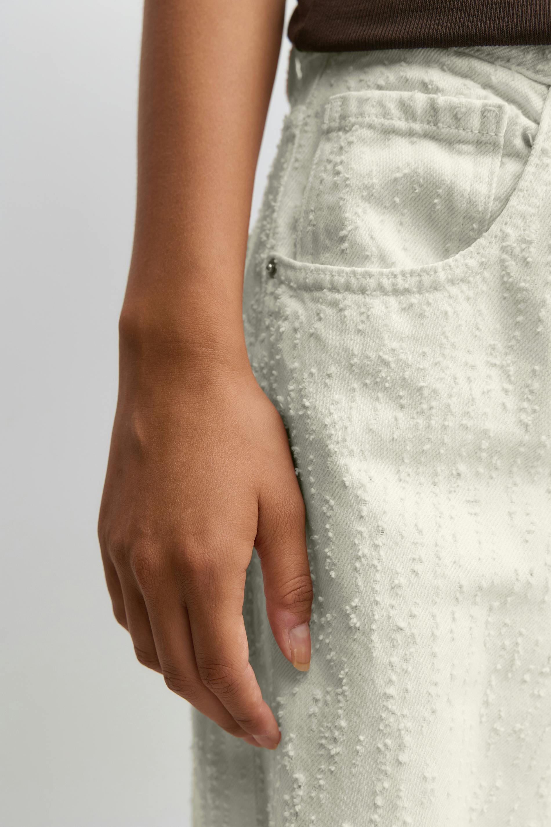 Jeans i bouclé med hög midja. Jeansen är vita och har vida ben med fullängd. De har dragkedjegylf, bälteshällor och fickor fram och bak. Utan stretch. Se gärna vår storleksguide för att hitta din storlek.