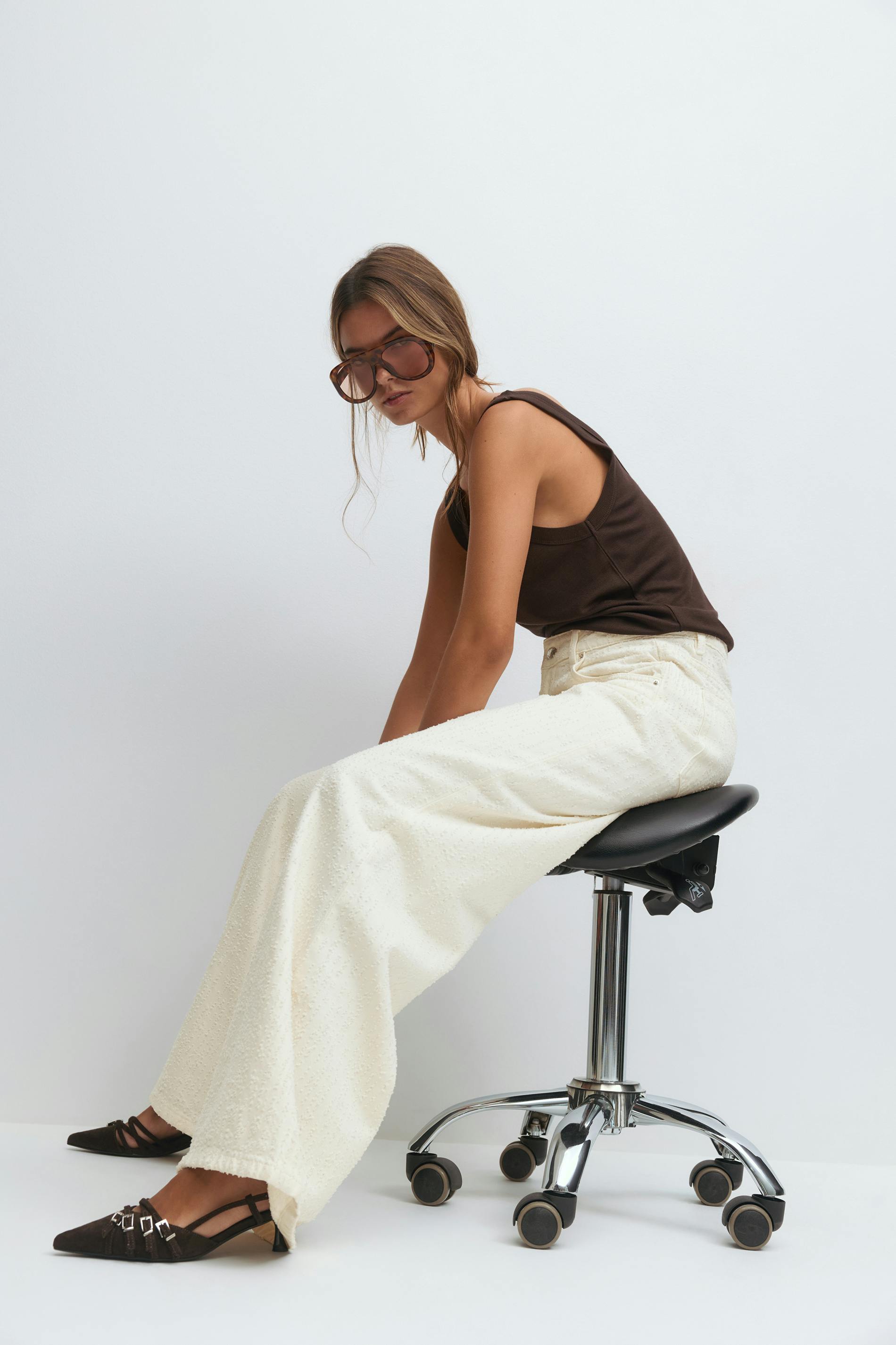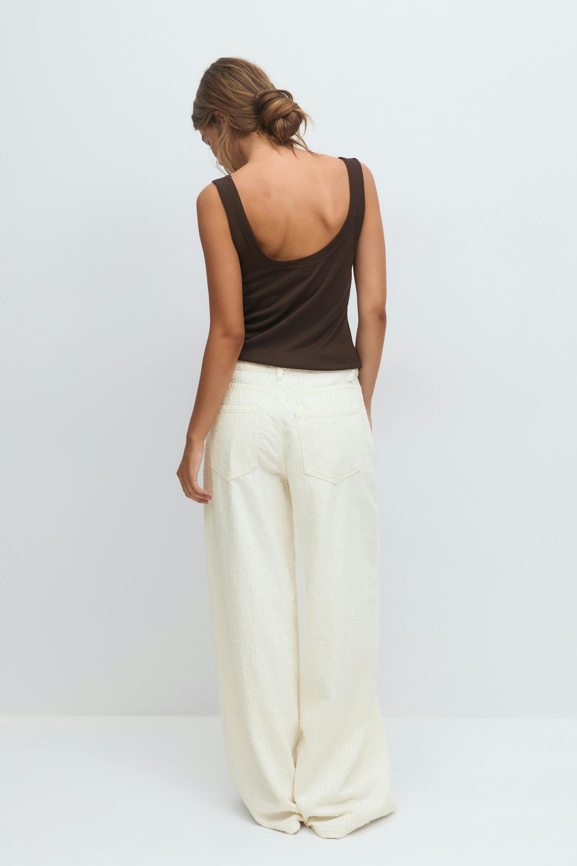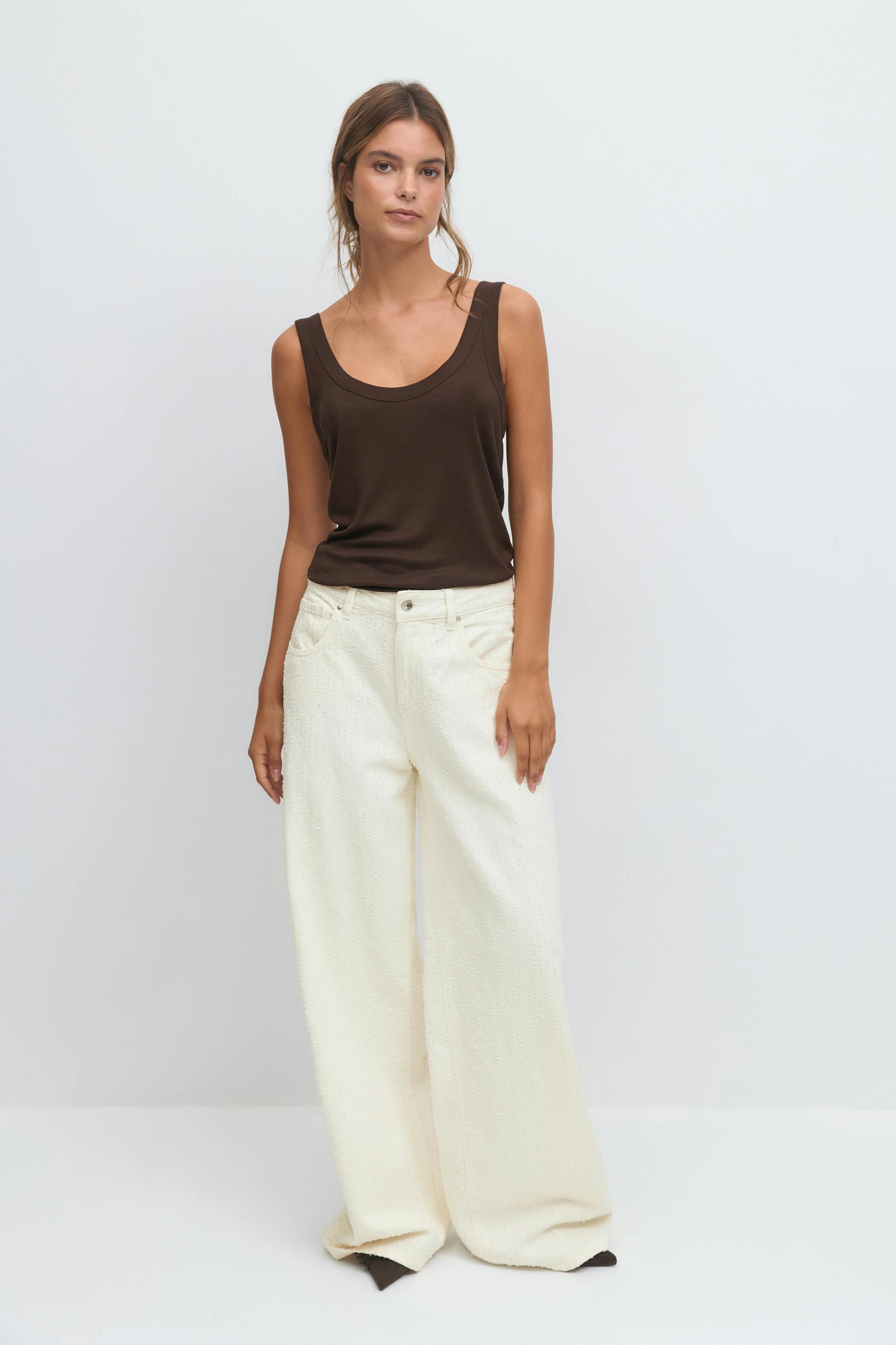 Jeans i bouclé med hög midja. Jeansen är vita och har vida ben med fullängd. De har dragkedjegylf, bälteshällor och fickor fram och bak. Utan stretch. Se gärna vår storleksguide för att hitta din storlek.