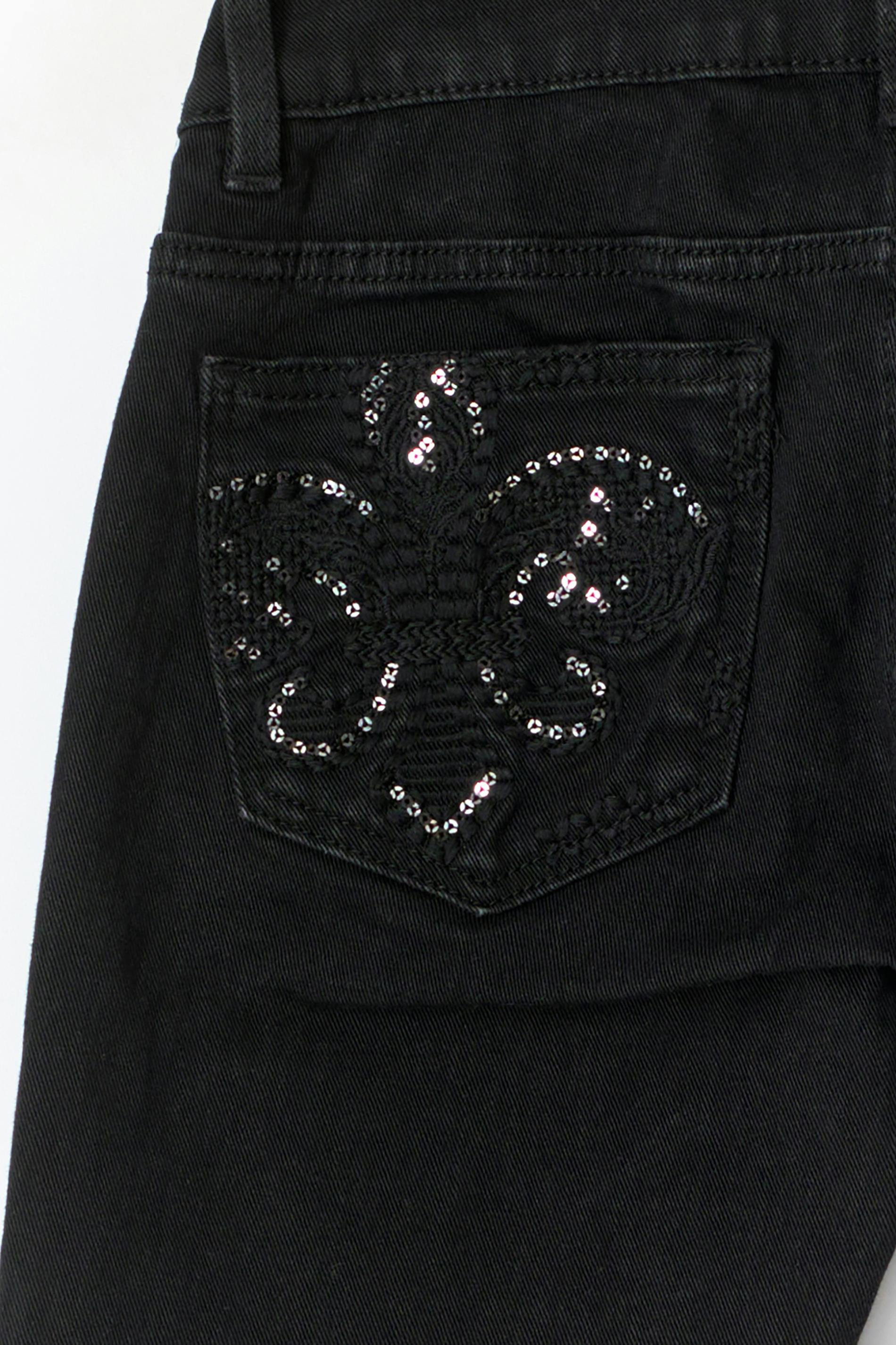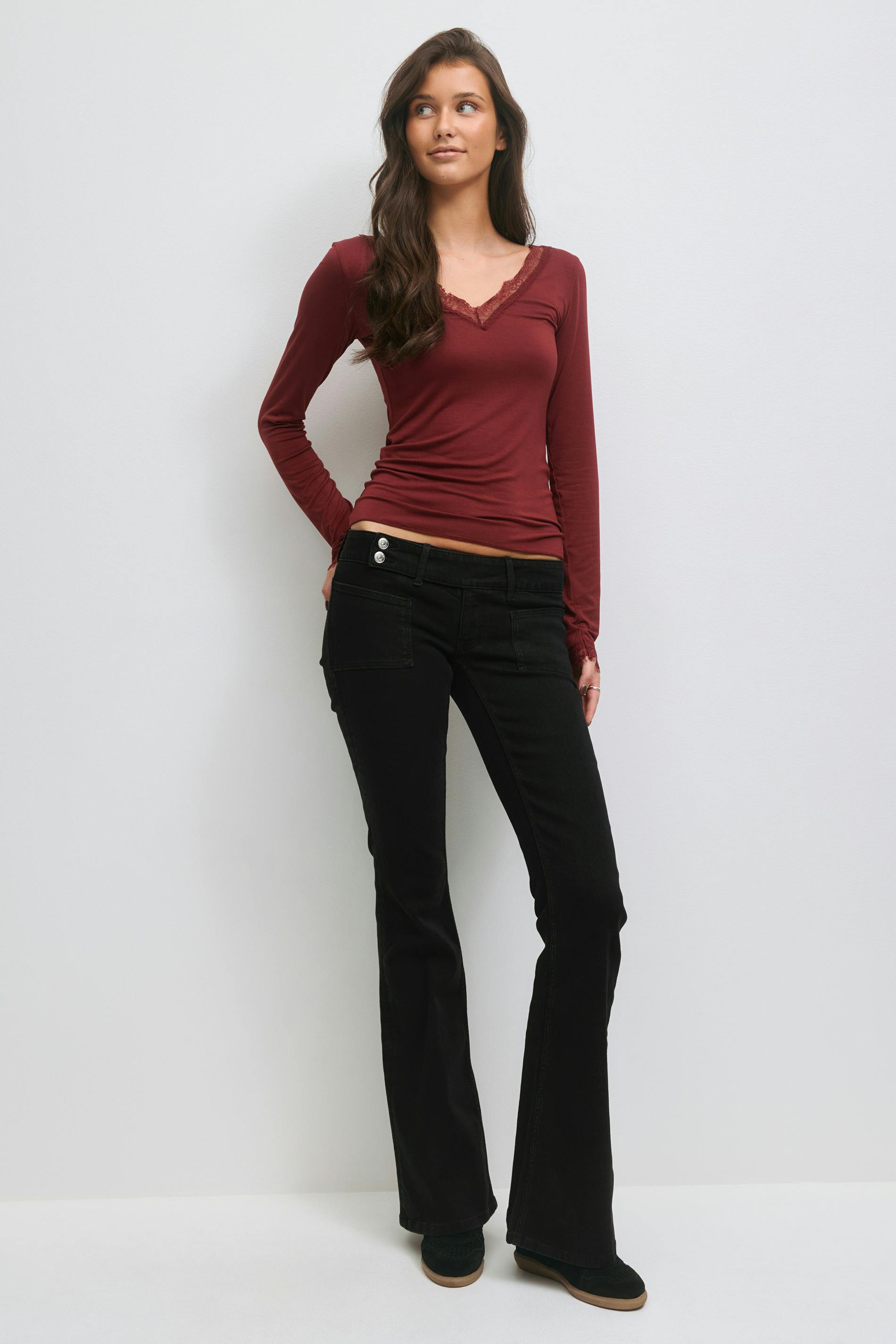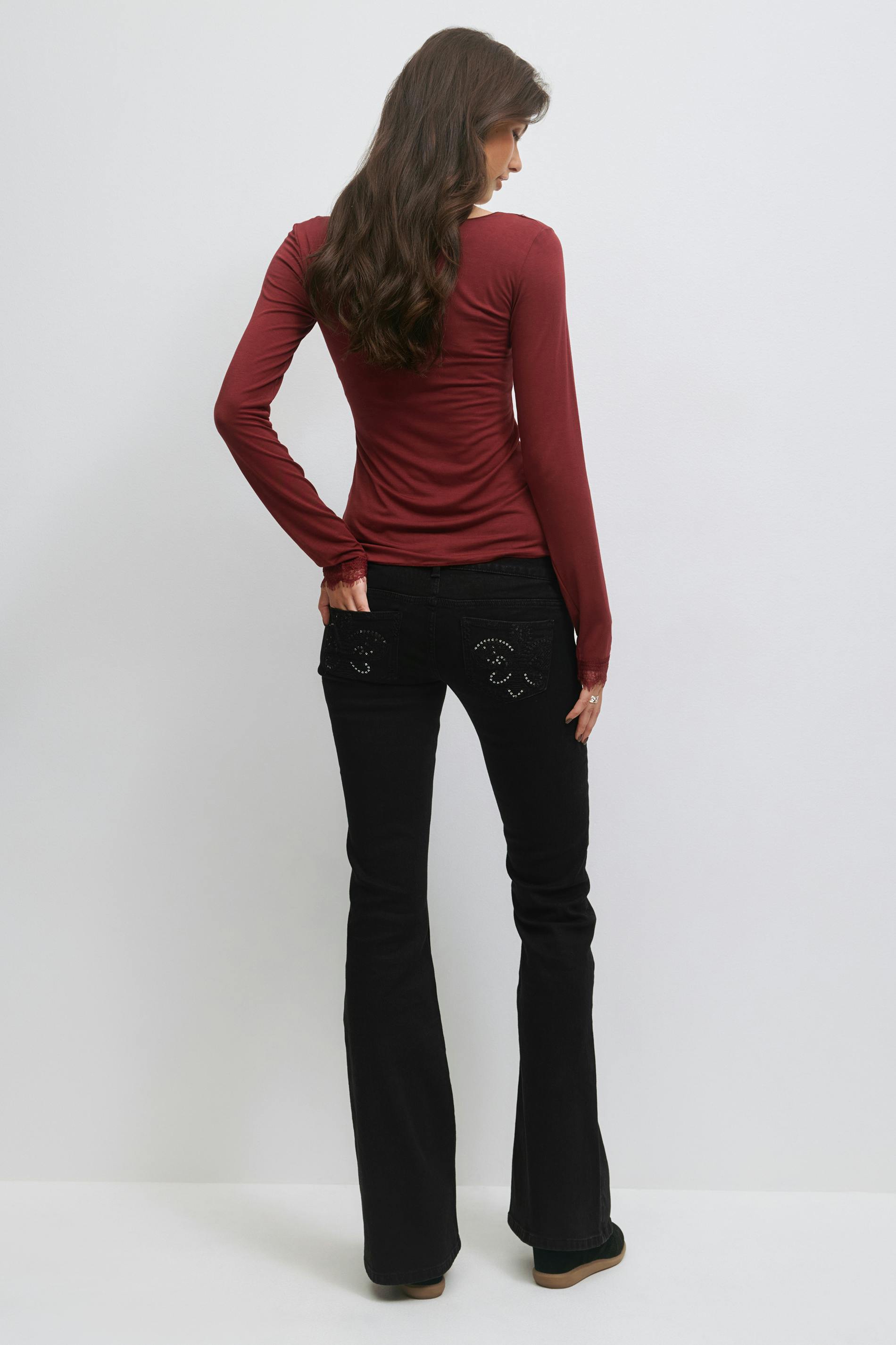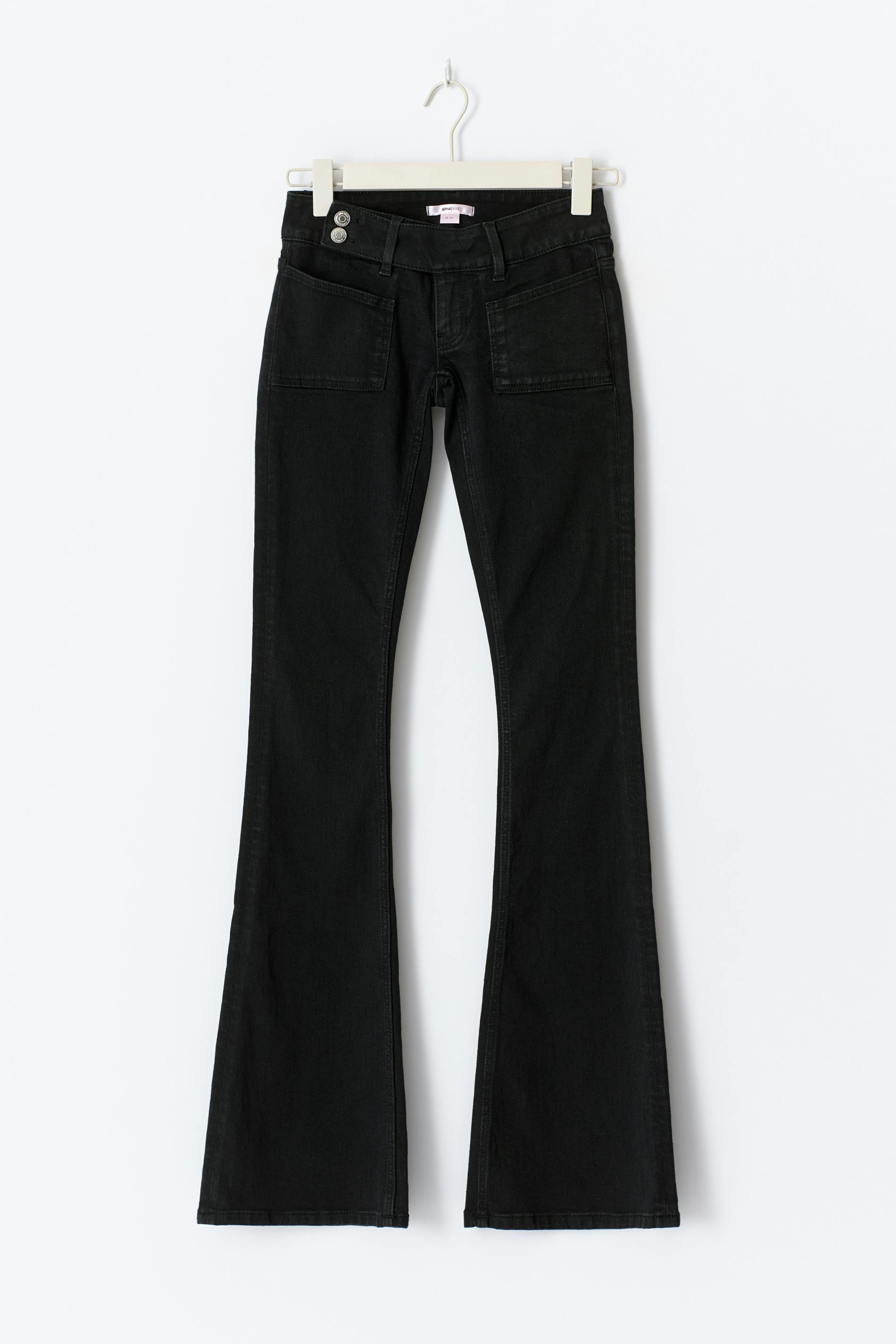 Flare jeans med låg midja. Jeansen är svarta och har broderade bakfickor med paljetter. De har utsvängda ben med normallängd, låg stretch, bälteshällor, två knappar i sidan och framfickor.