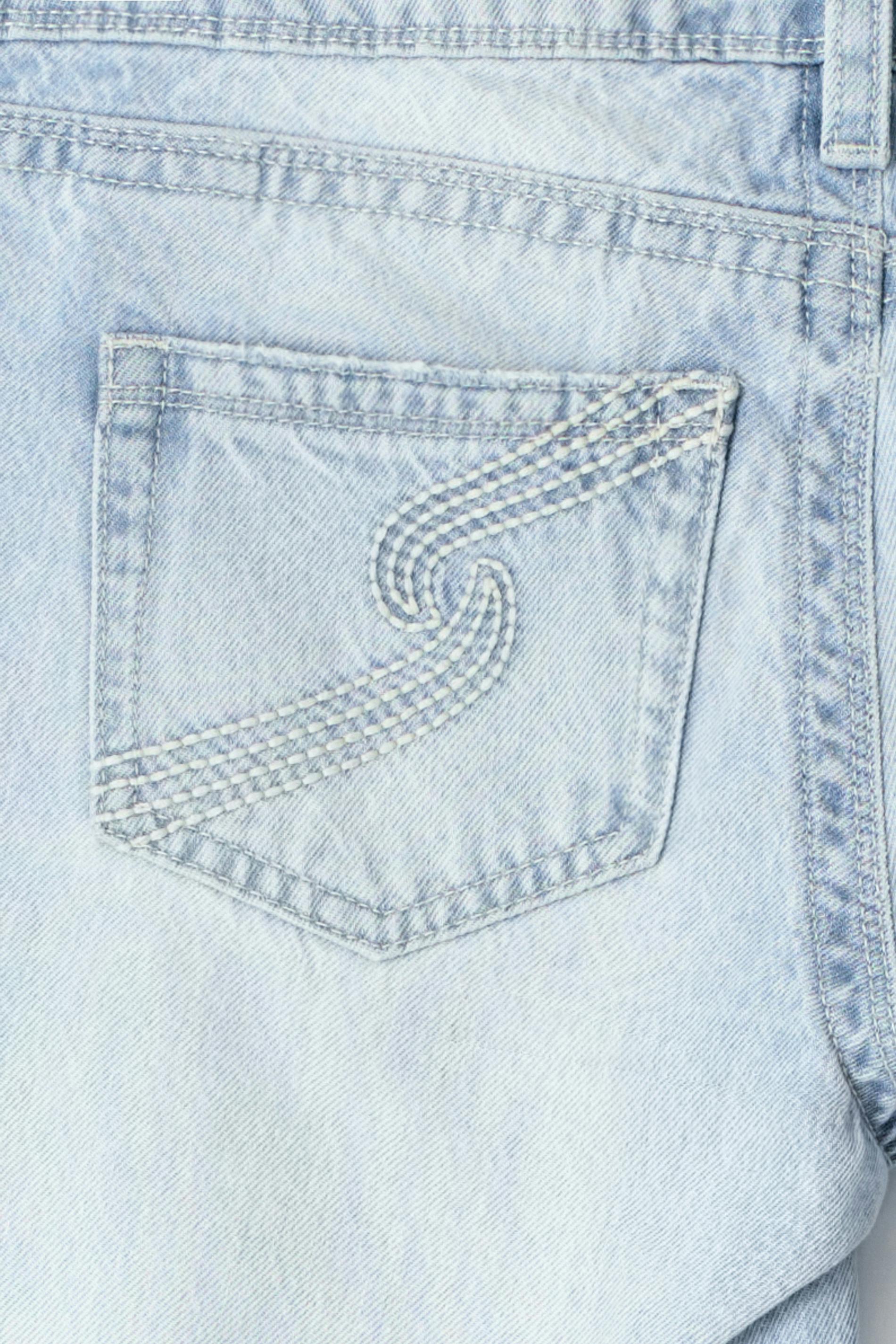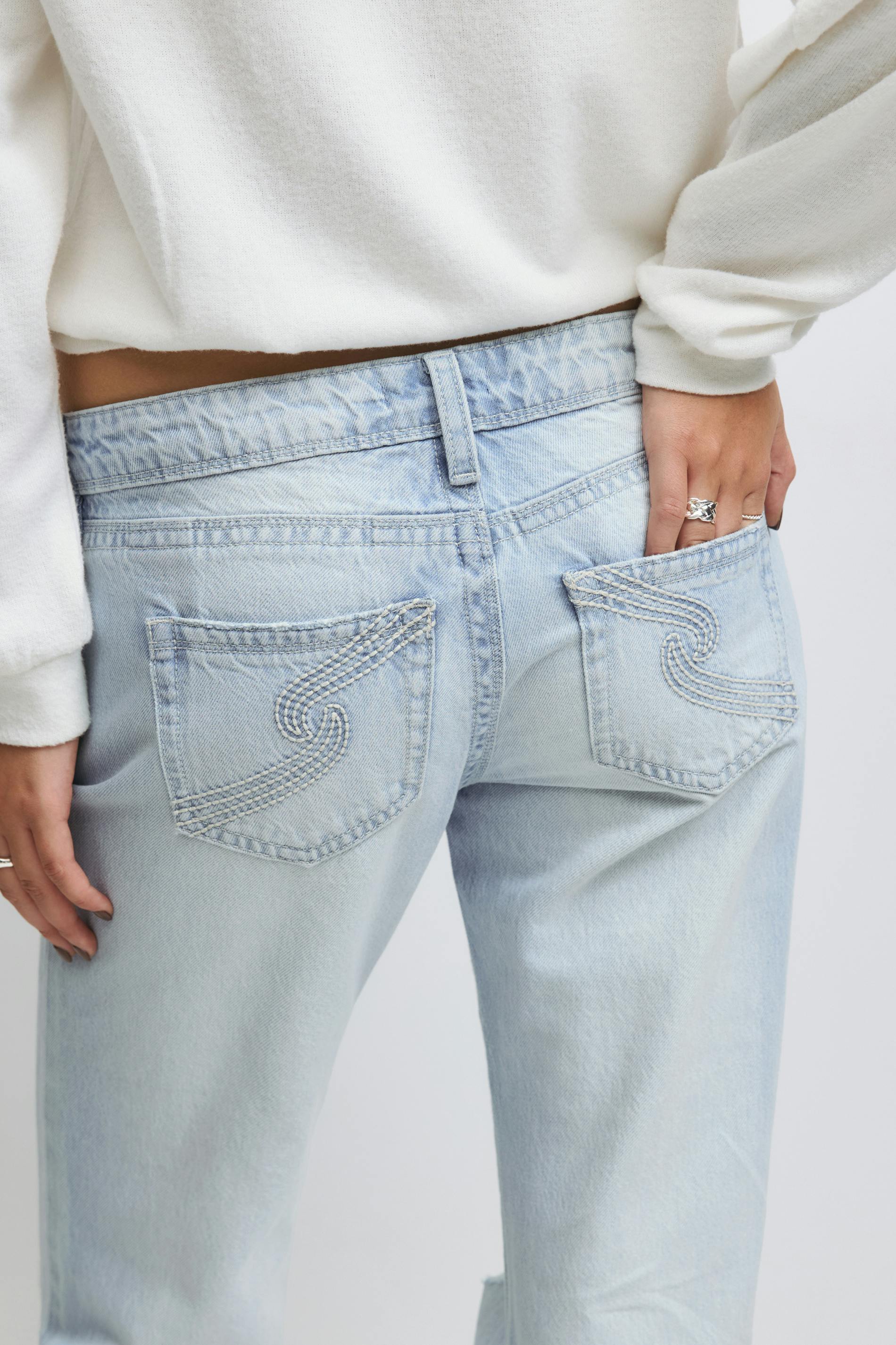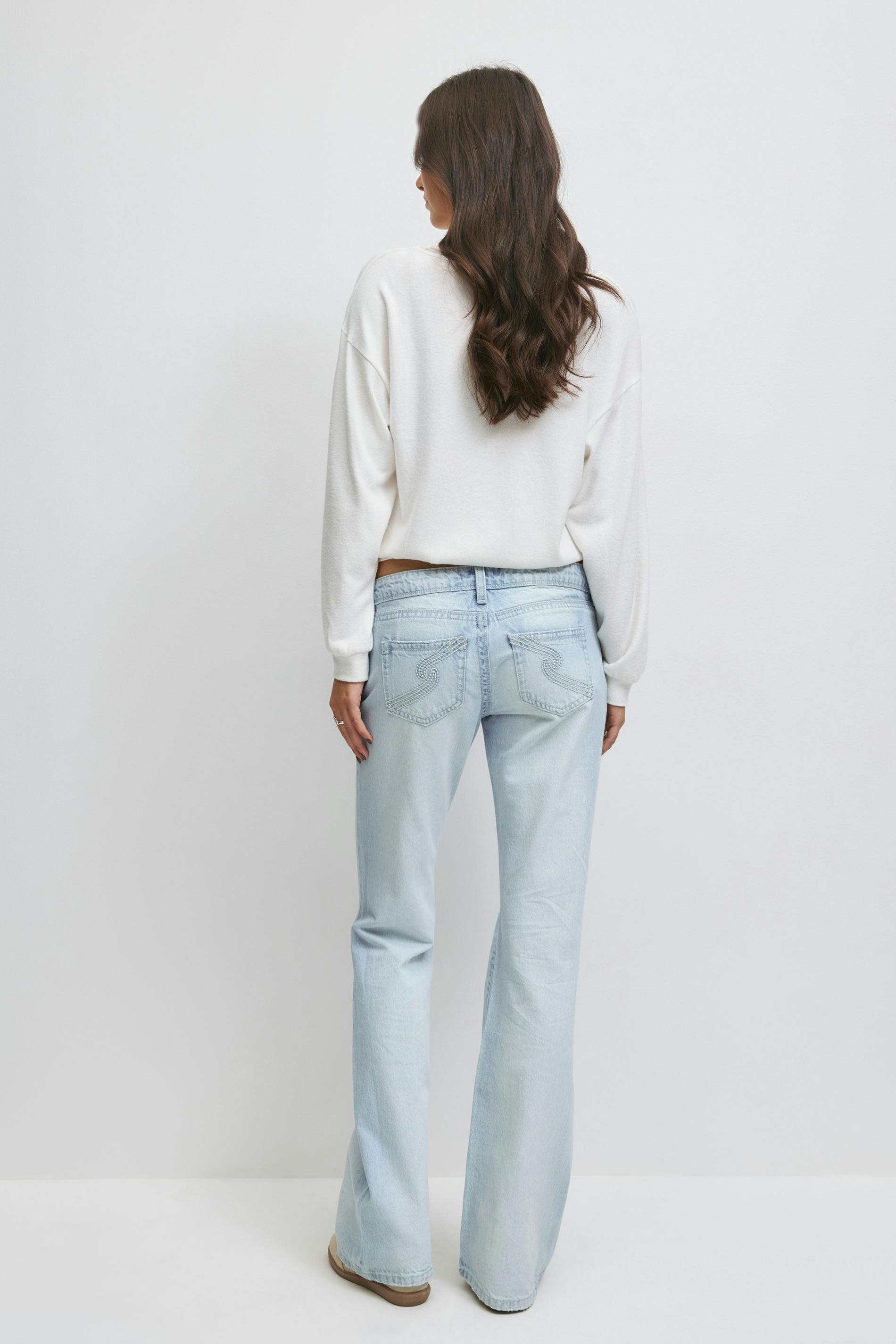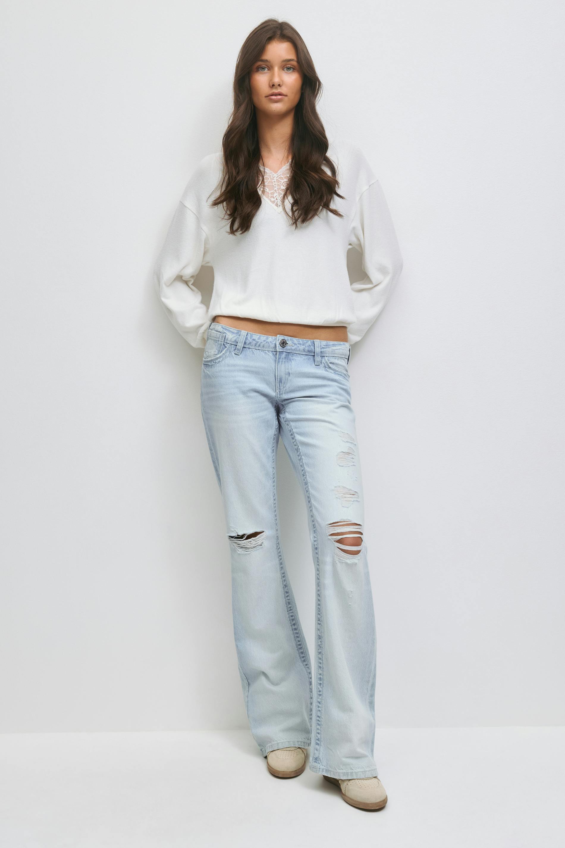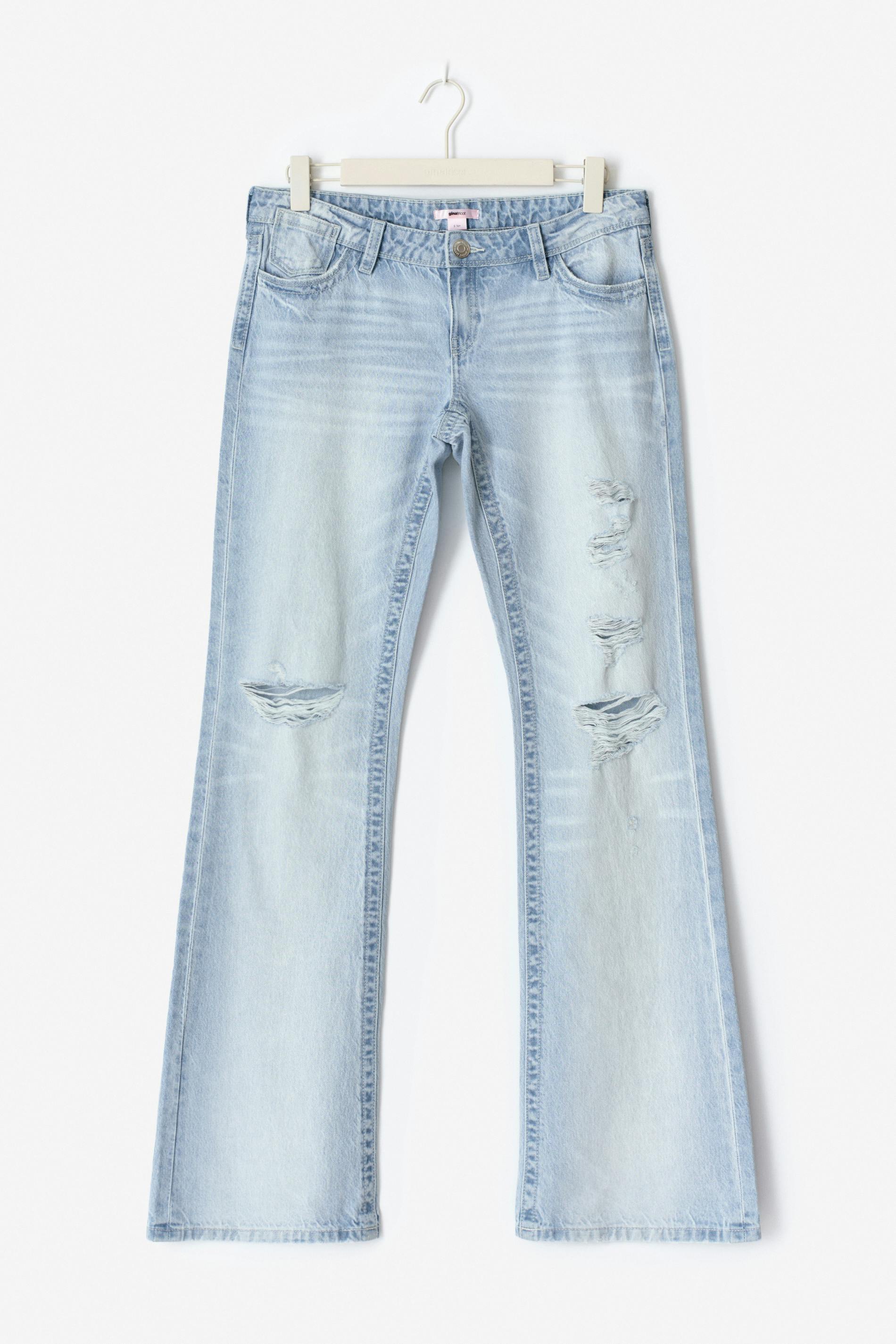 Flare jeans med slitna detaljer framtill. Jeansen är ljusblåa och har en låg midja. De har en dragkedjegylf och en ficka fram och bak.
