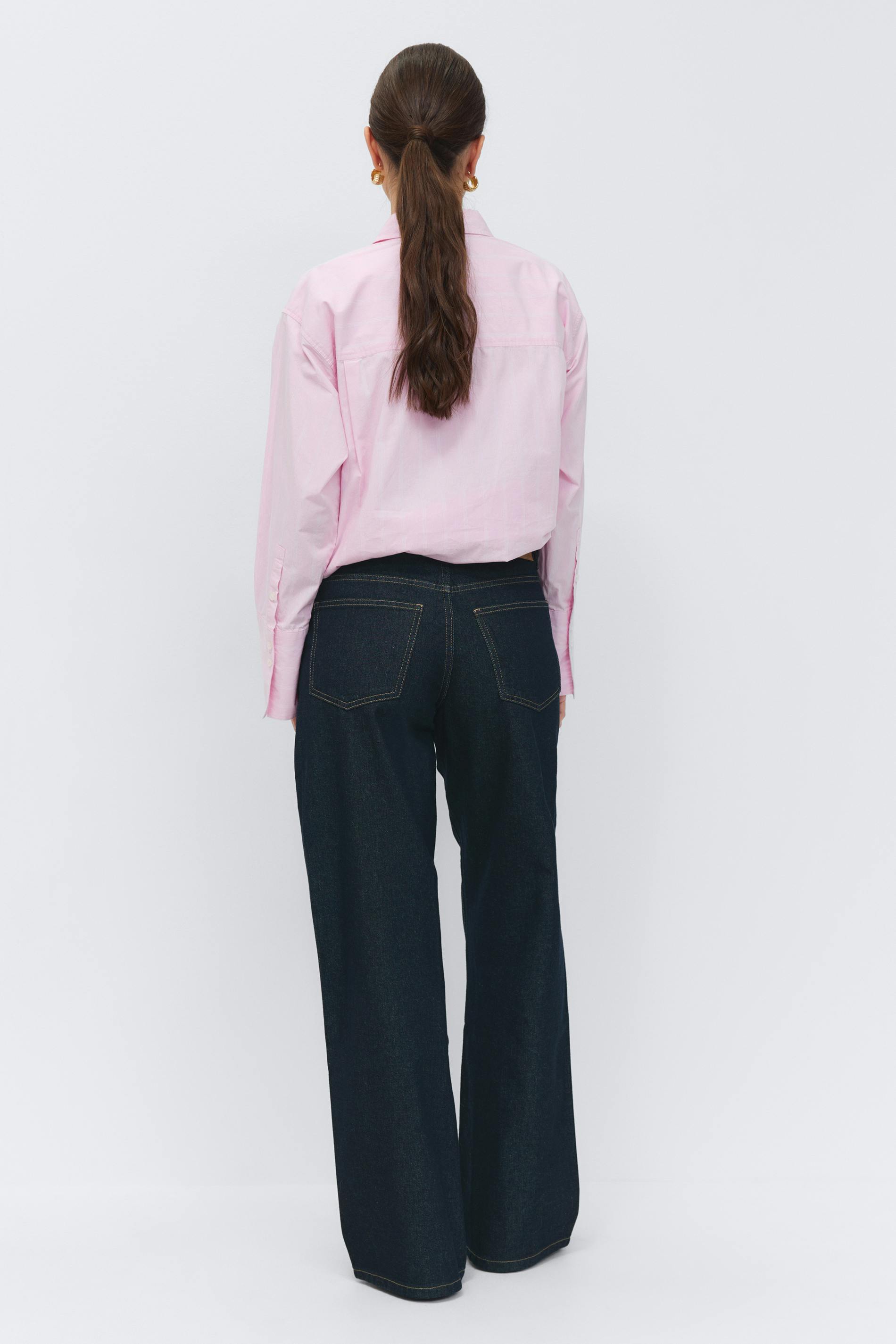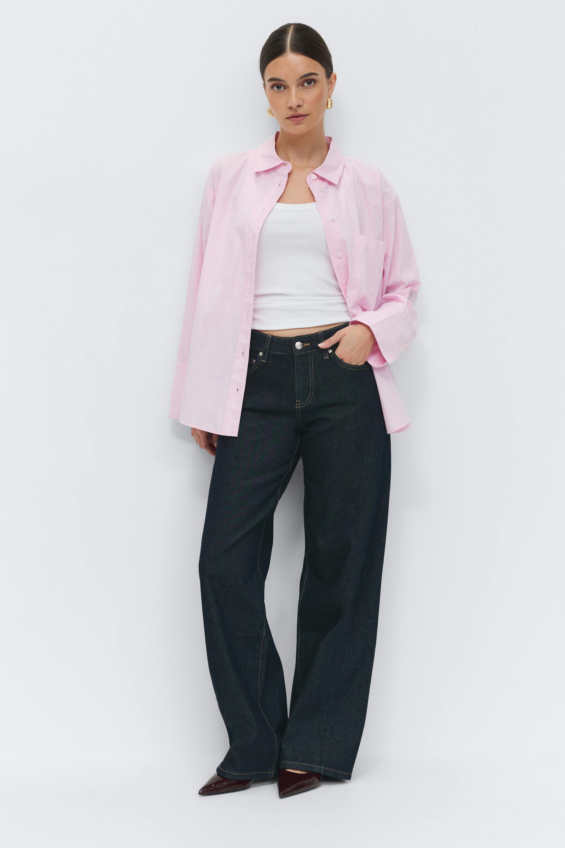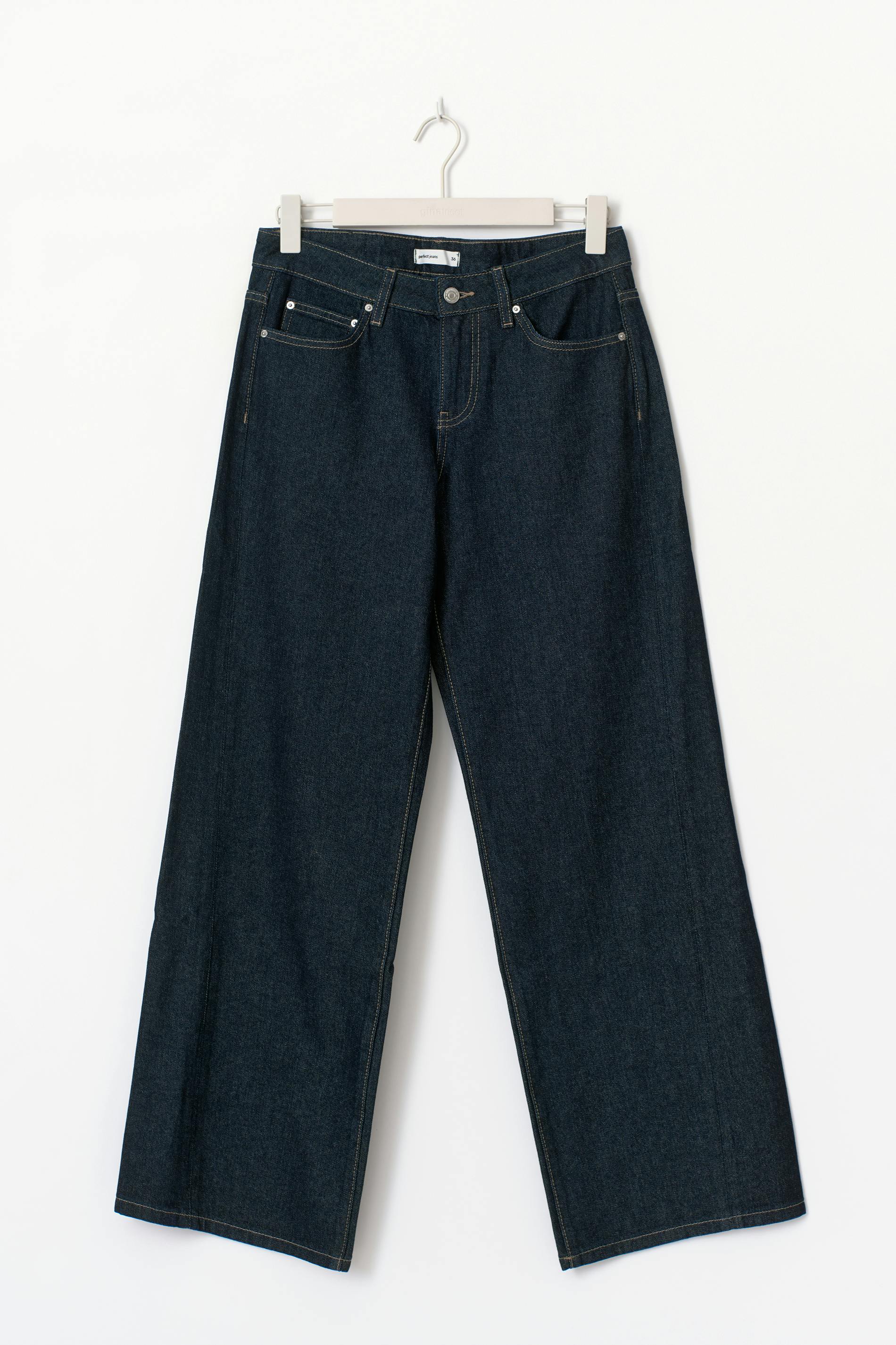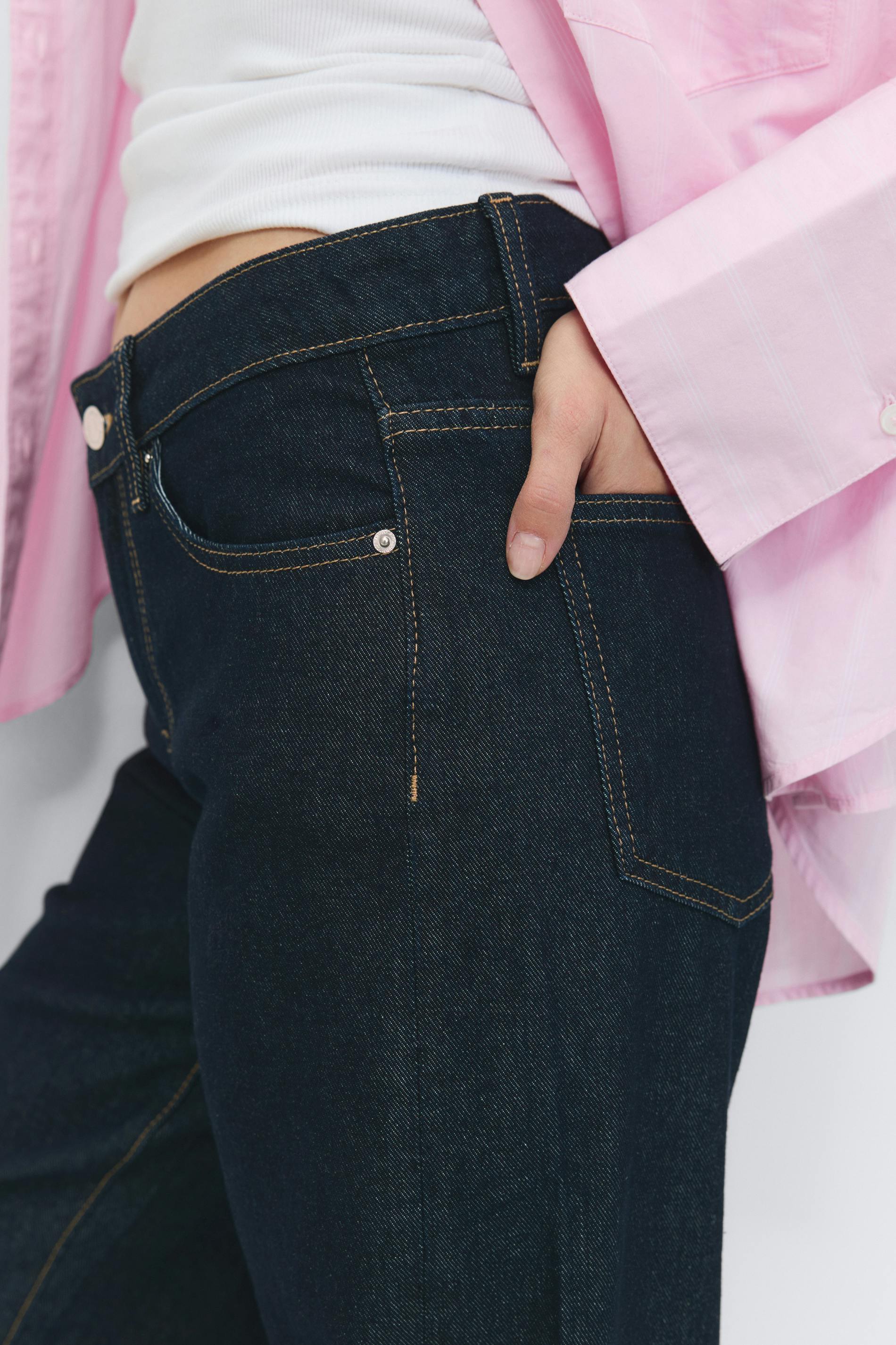 Vida jeans med låg midja. Jeansen är blåa och har vridna sömmar. De har vida ben med fullängd, normal passform, dragkedjegylf, bälteshällor och fickor fram och bak. Utan stretch.