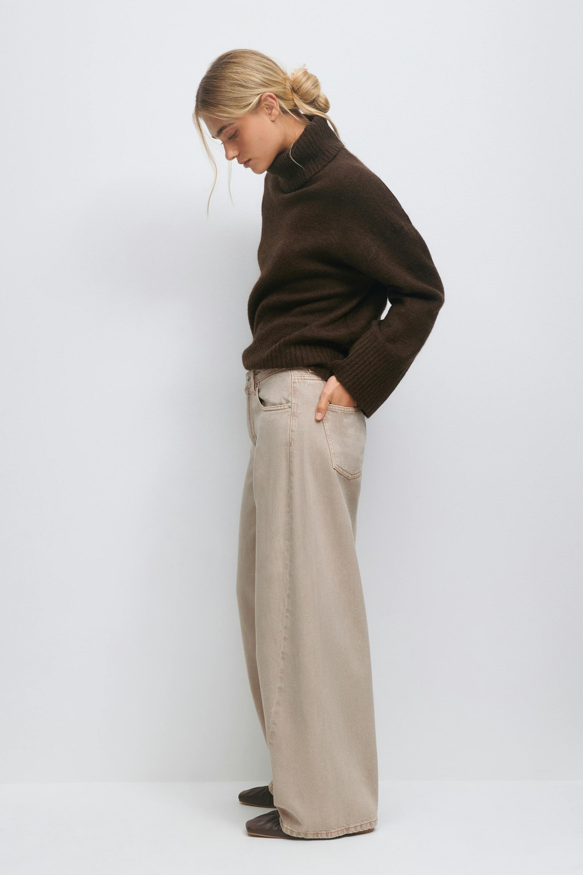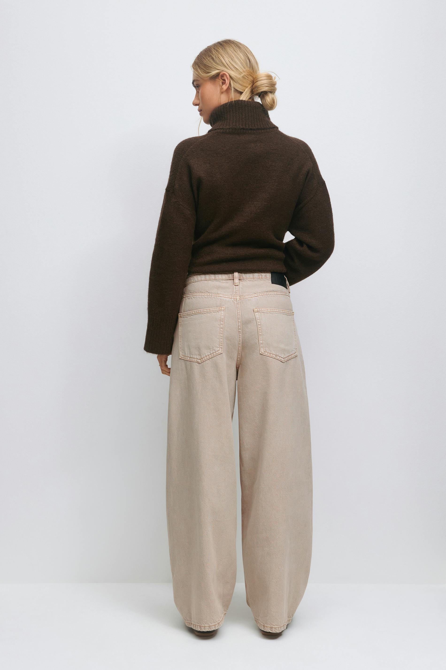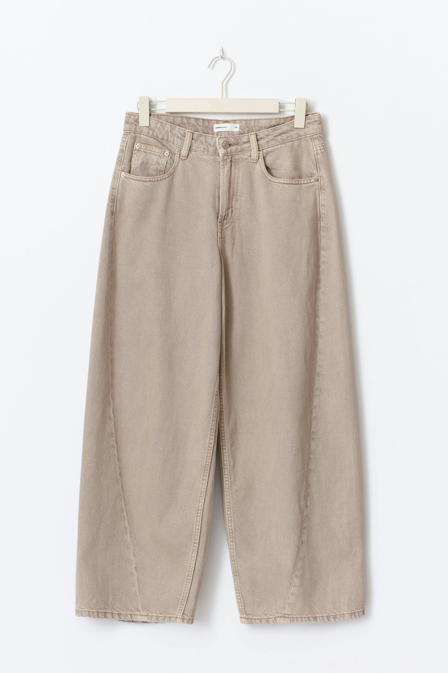 Ballongjeans med en vriden söm framtill. Jeansen är beigea och har en hög midja. De har oversize fit, en dragkedjegylf, bälteshällor och fickor fram och bak. Se gärna vår storleksguide för att hitta din storlek.