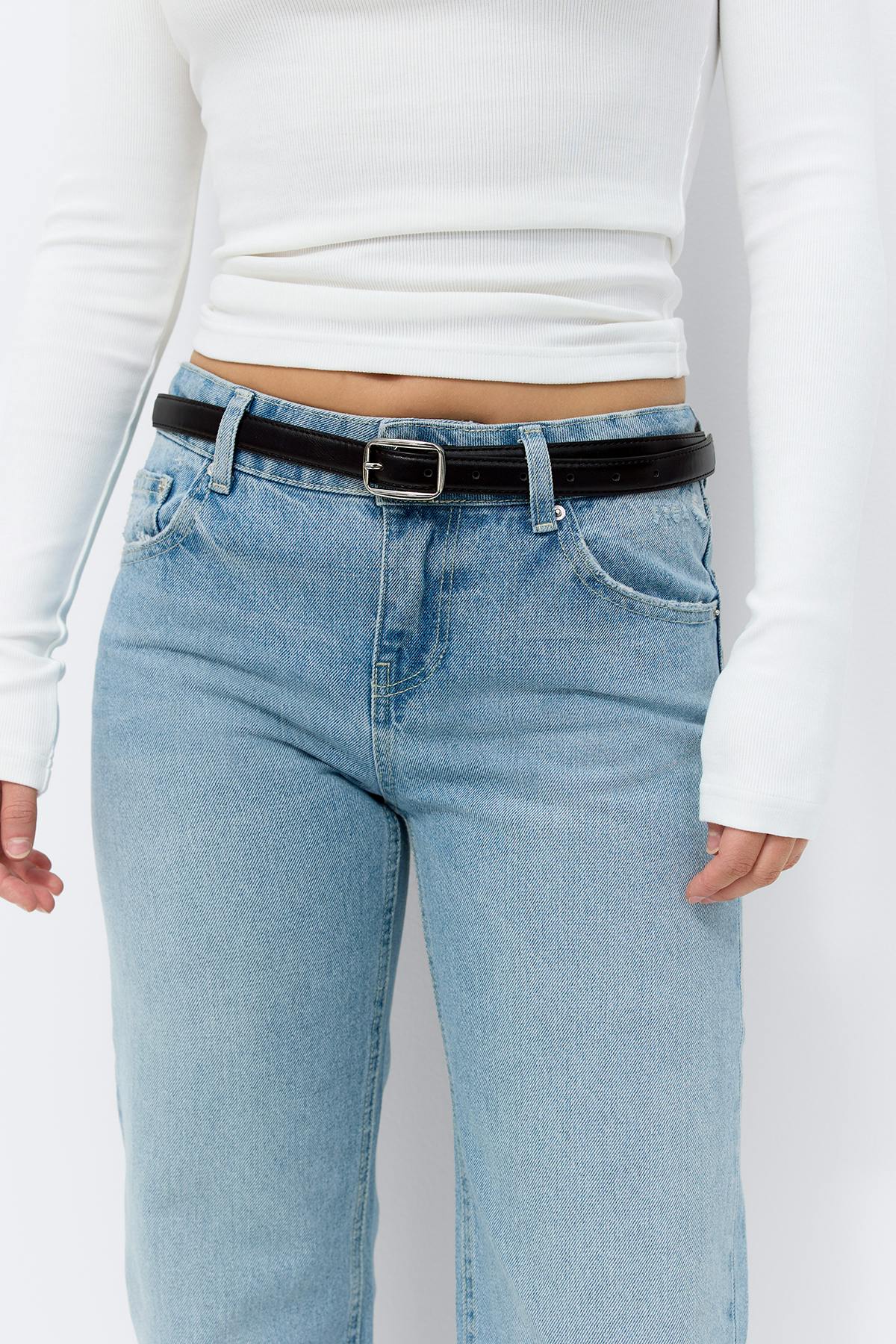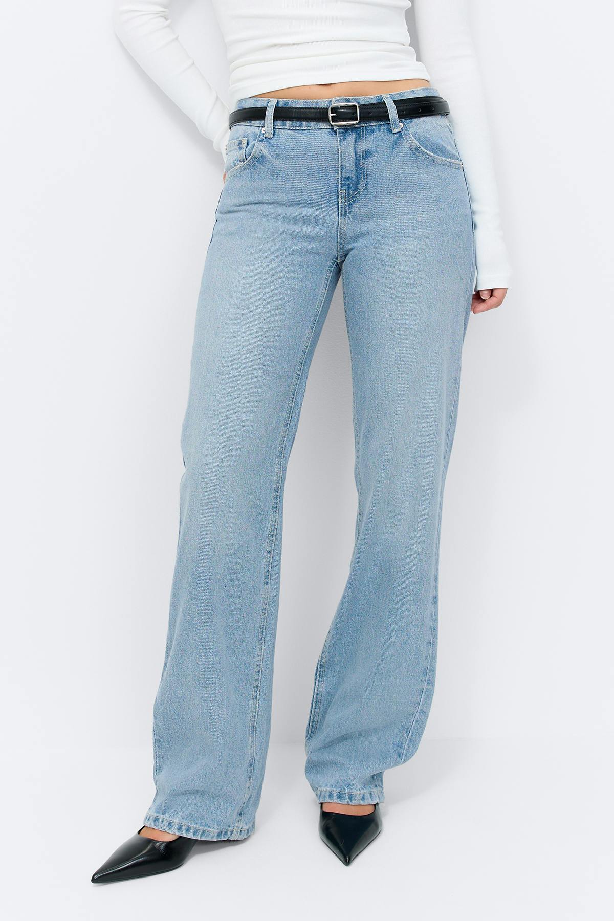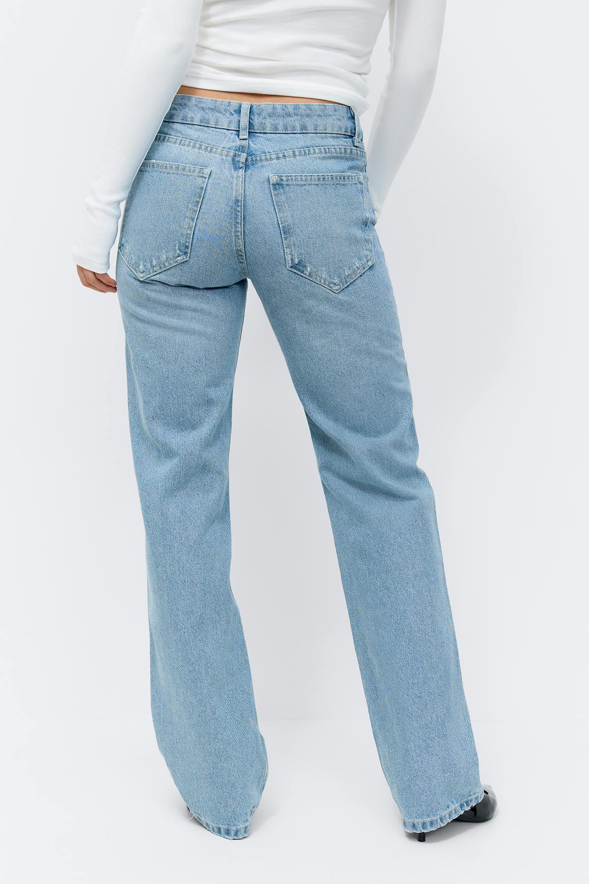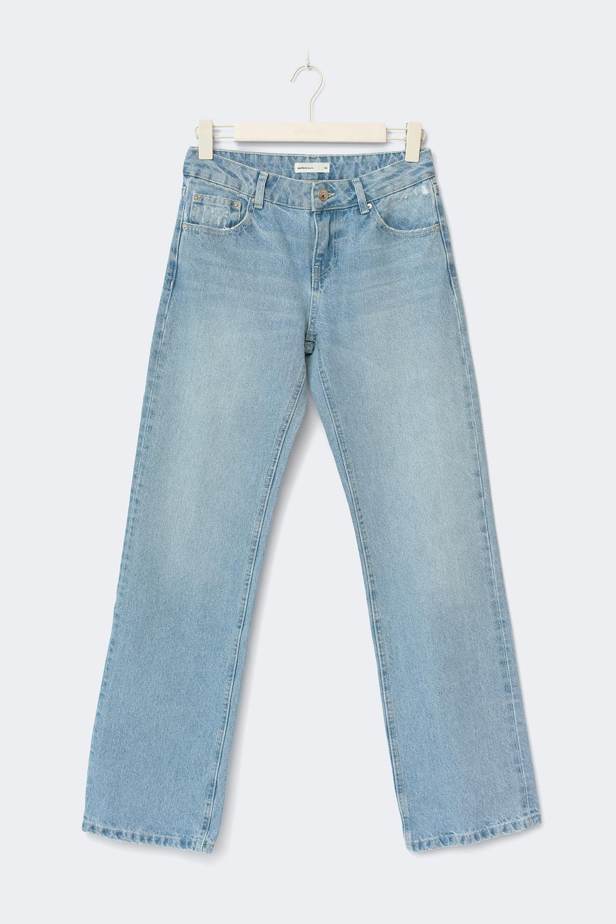 Straight jeans i denim utan stretch med medelhög midja. Jeansen är blåa och har raka ben med normallängd. De har dragkedjegylf, fickor fram och bak och bälteshällor. Se gärna vår storleksguide för att hitta din storlek.