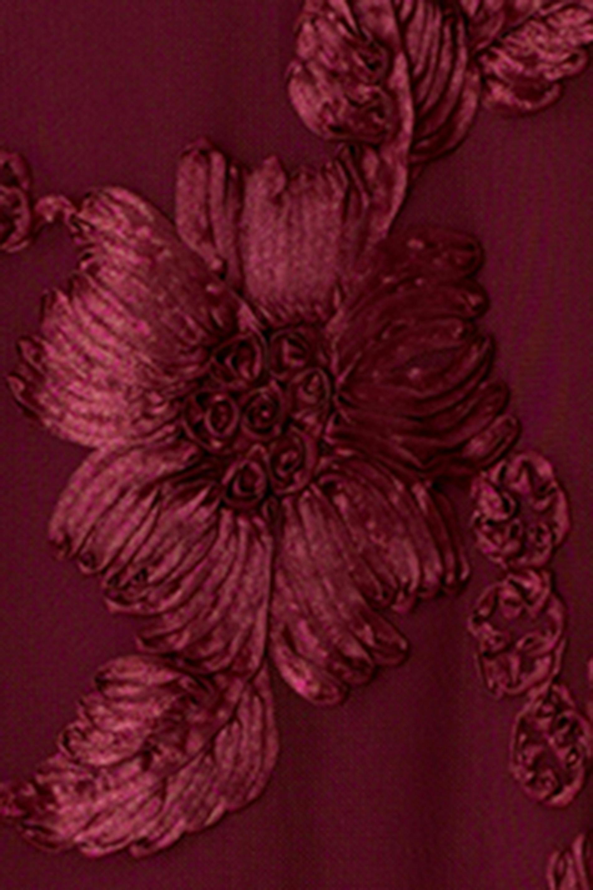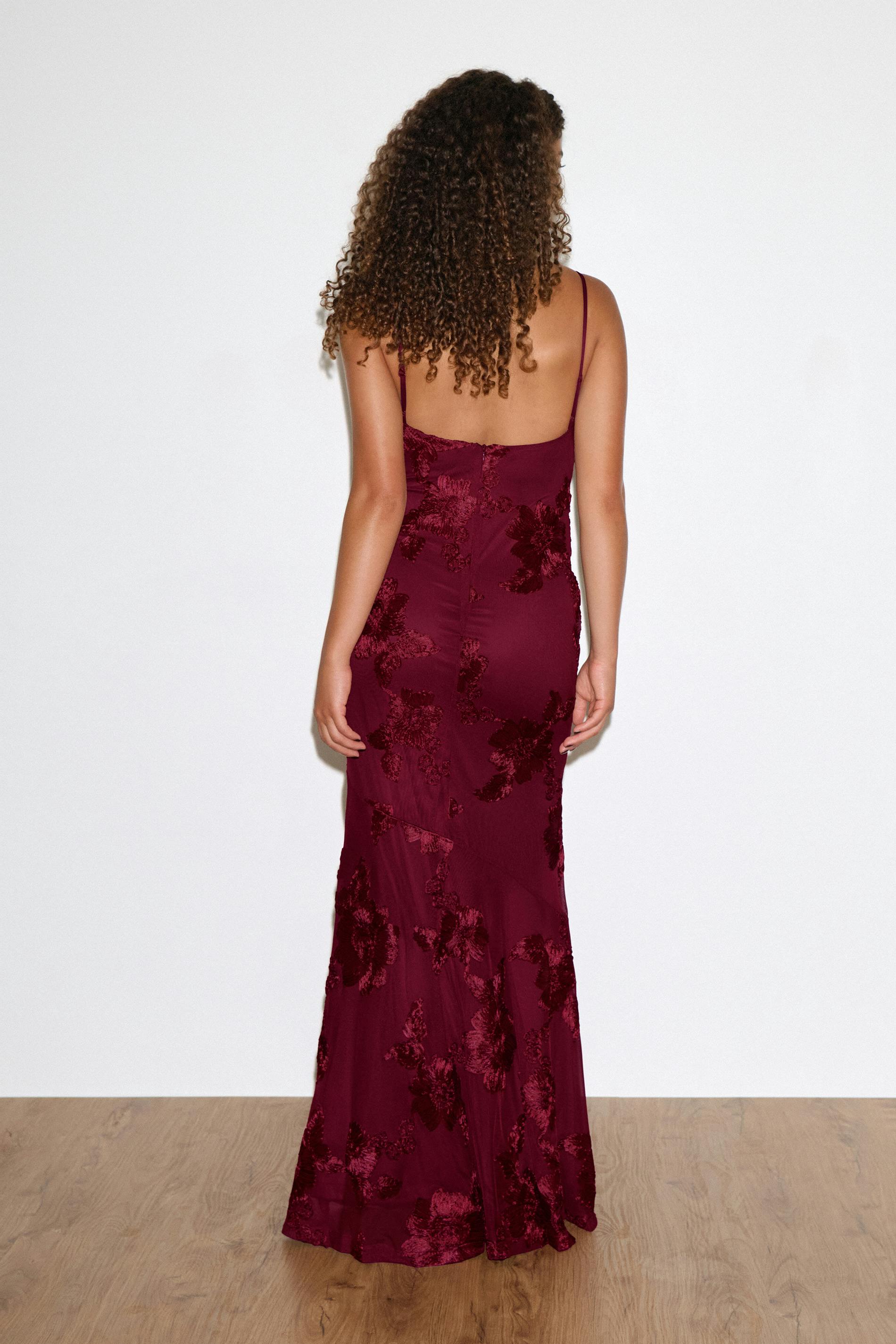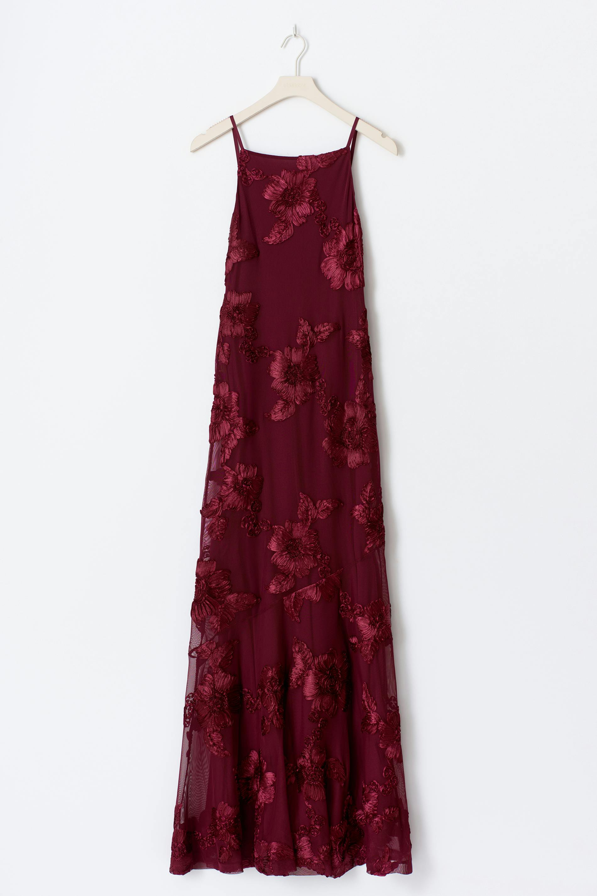 Ärmlös långklänning med broderade detaljer. Klänningen är vinröd och helfodrad och har en fyrkantig halsringning. Den har justerbara axelband och en dragkedja på ryggen.
