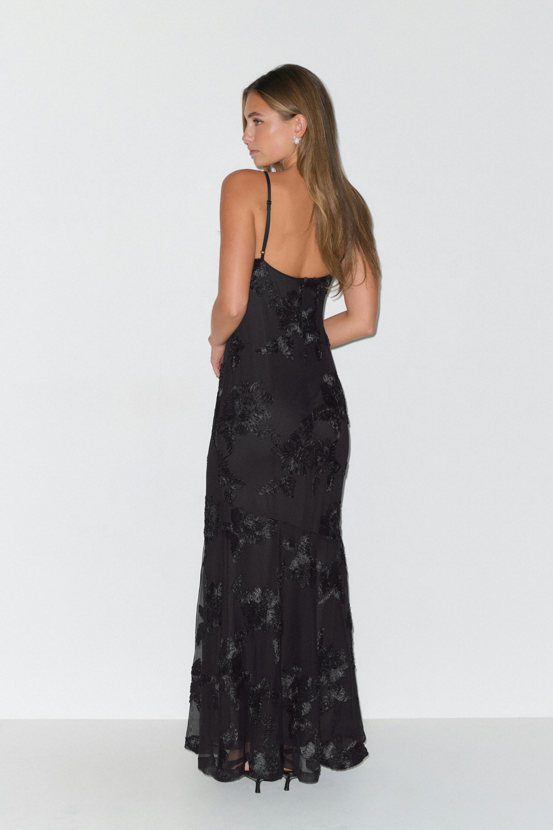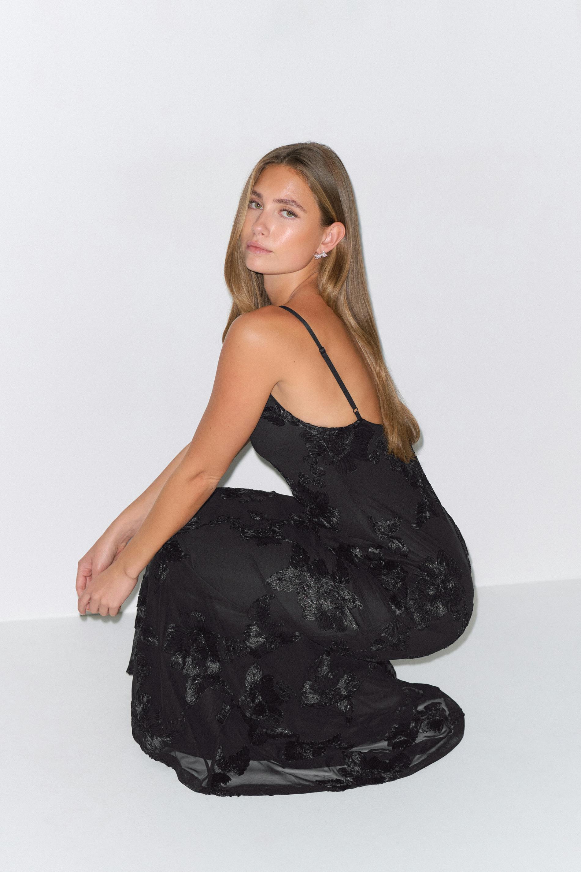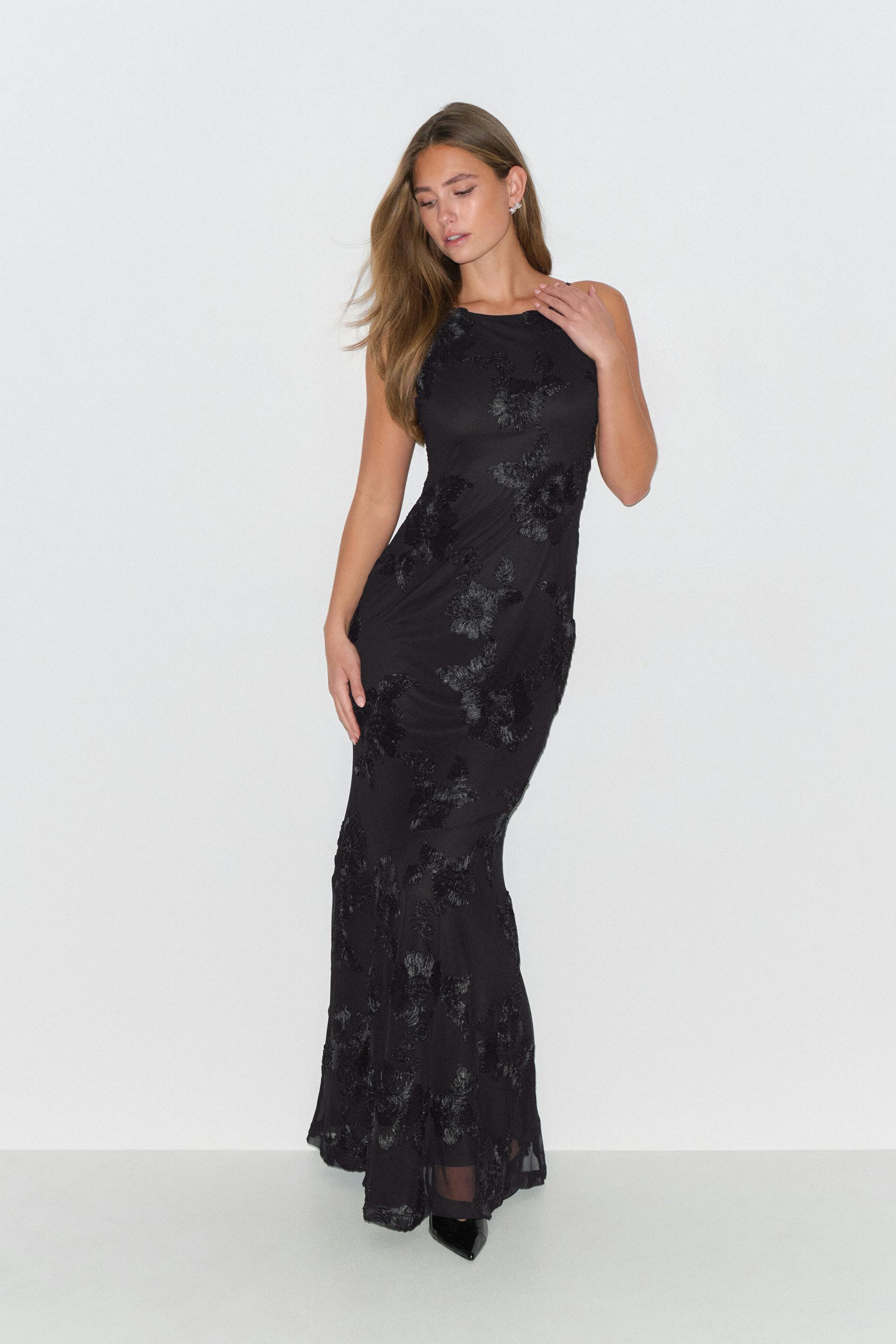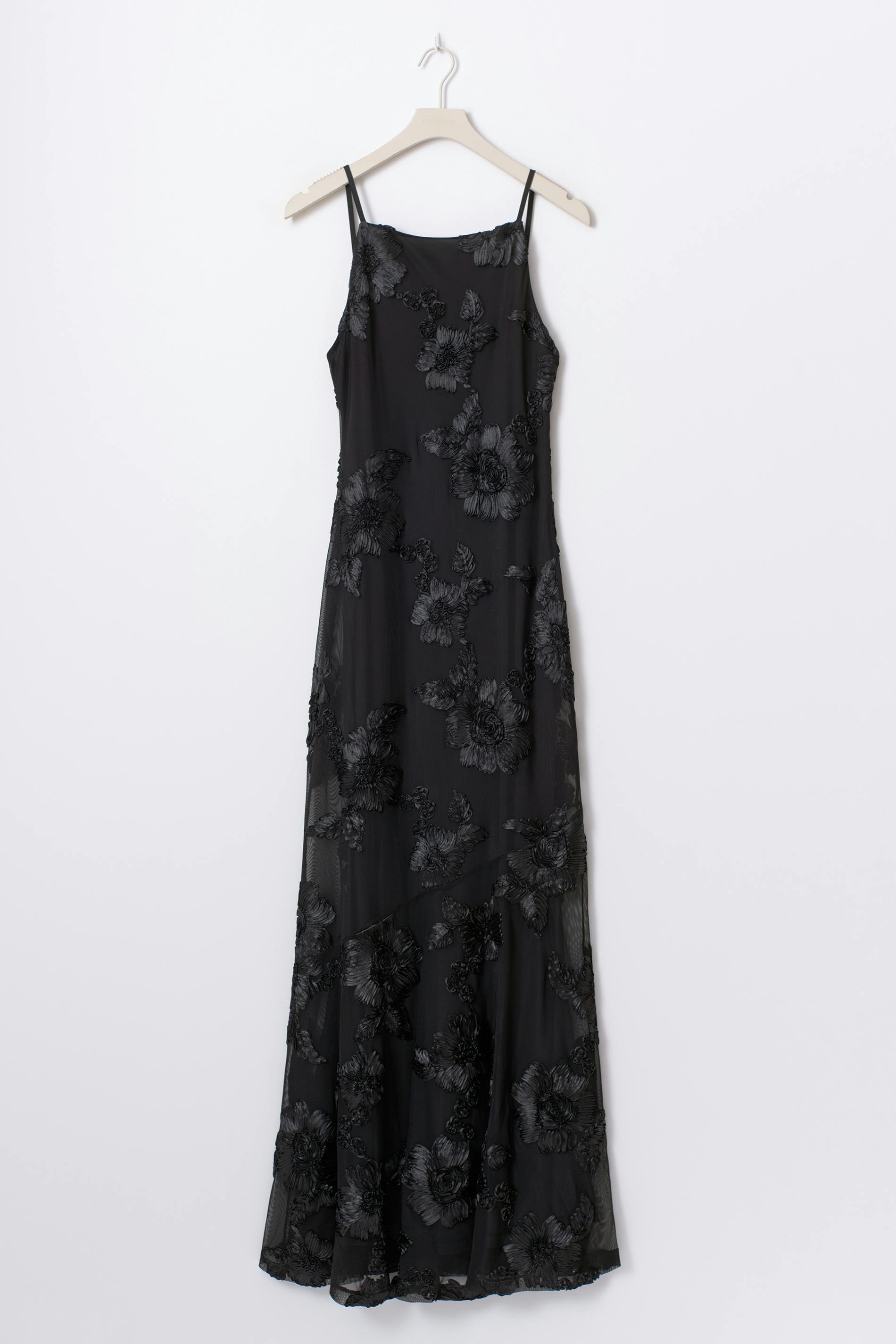 Ärmlös långklänning med broderade detaljer. Klänningen är svart och helfodrad och har en fyrkantig halsringning. Den har justerbara axelband och en dragkedja på ryggen.