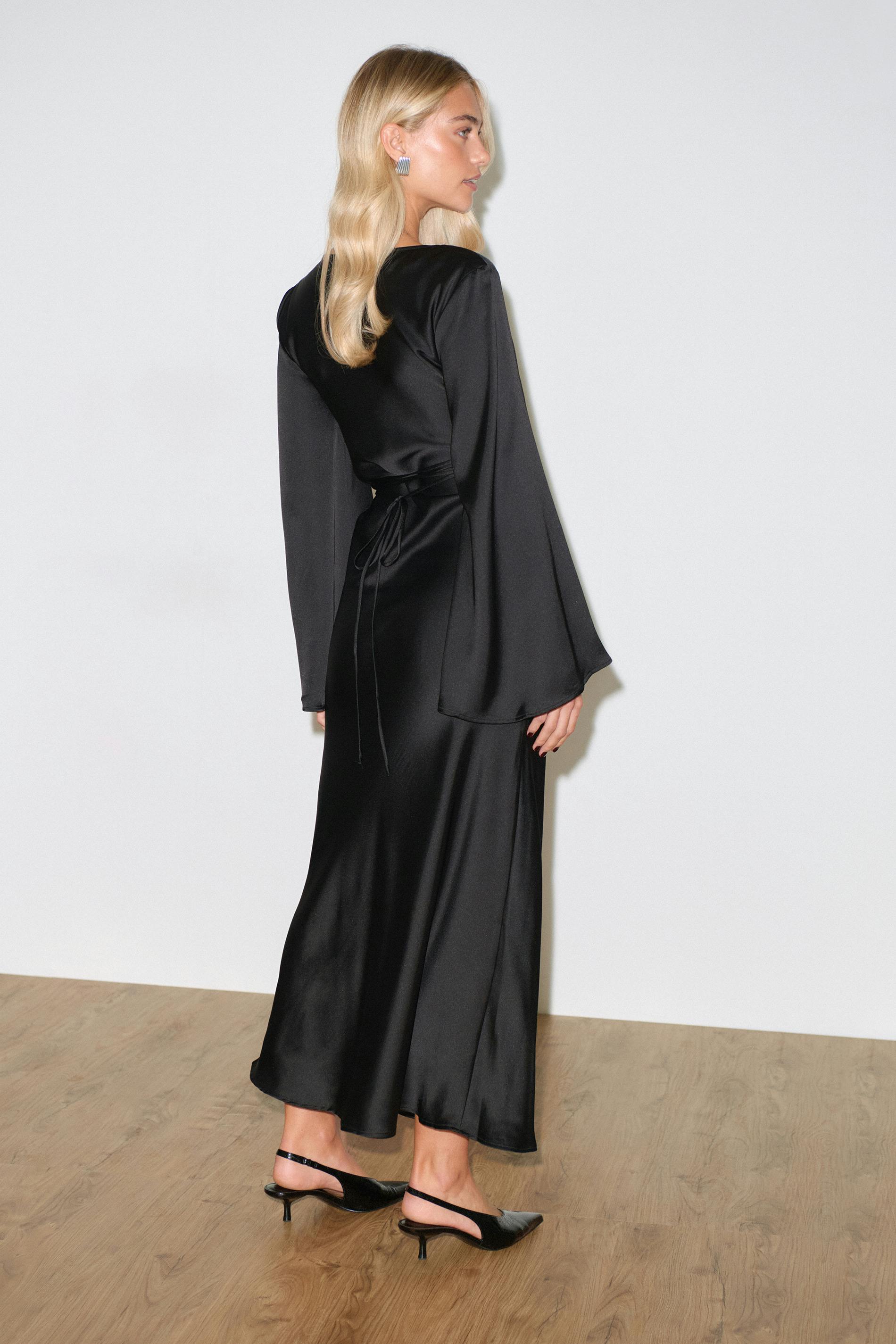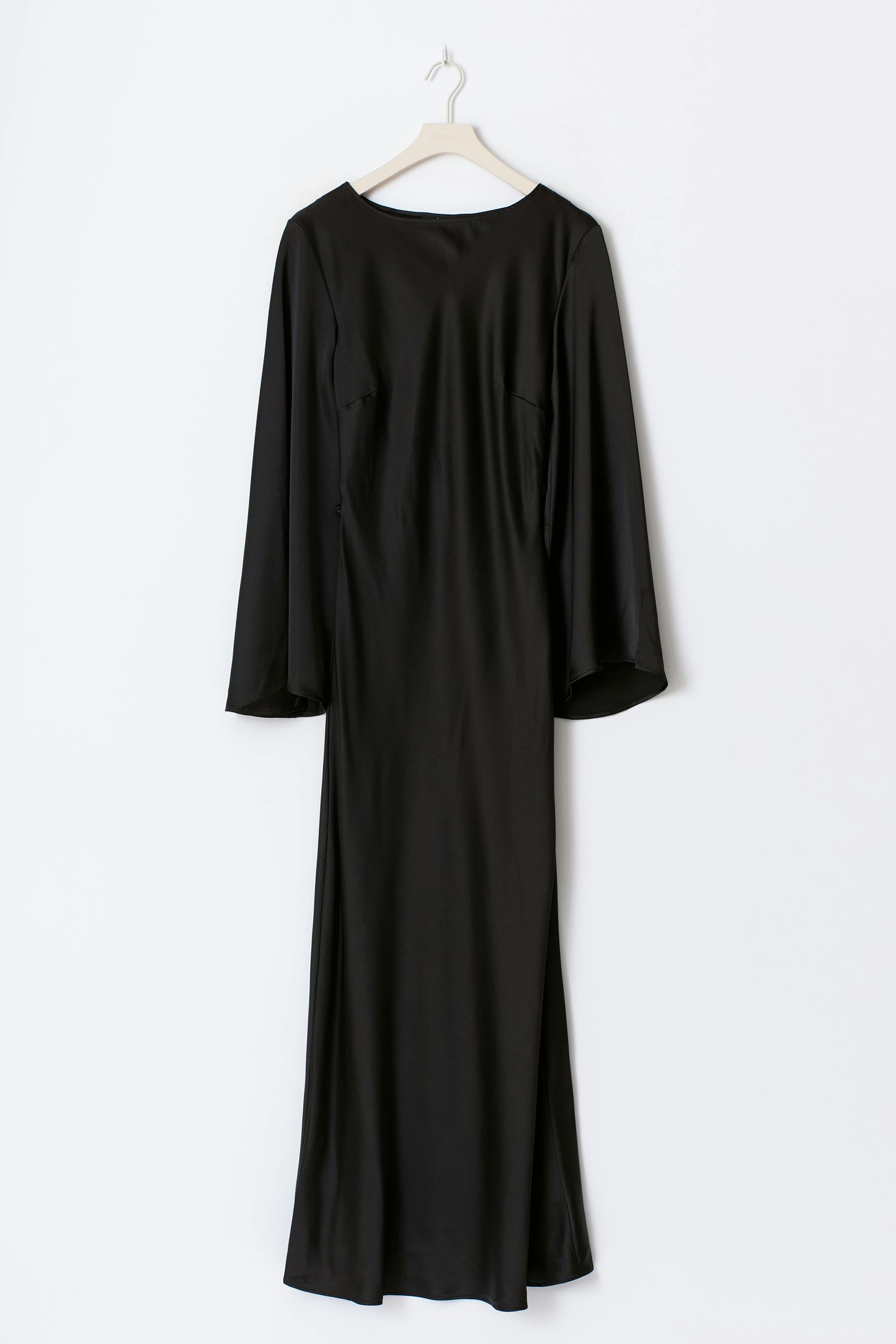 Maxiklänning i satin med en vid, lång ärm. Klänningen är svart och har en båtringning. Den har knytning baktill och normal passform.