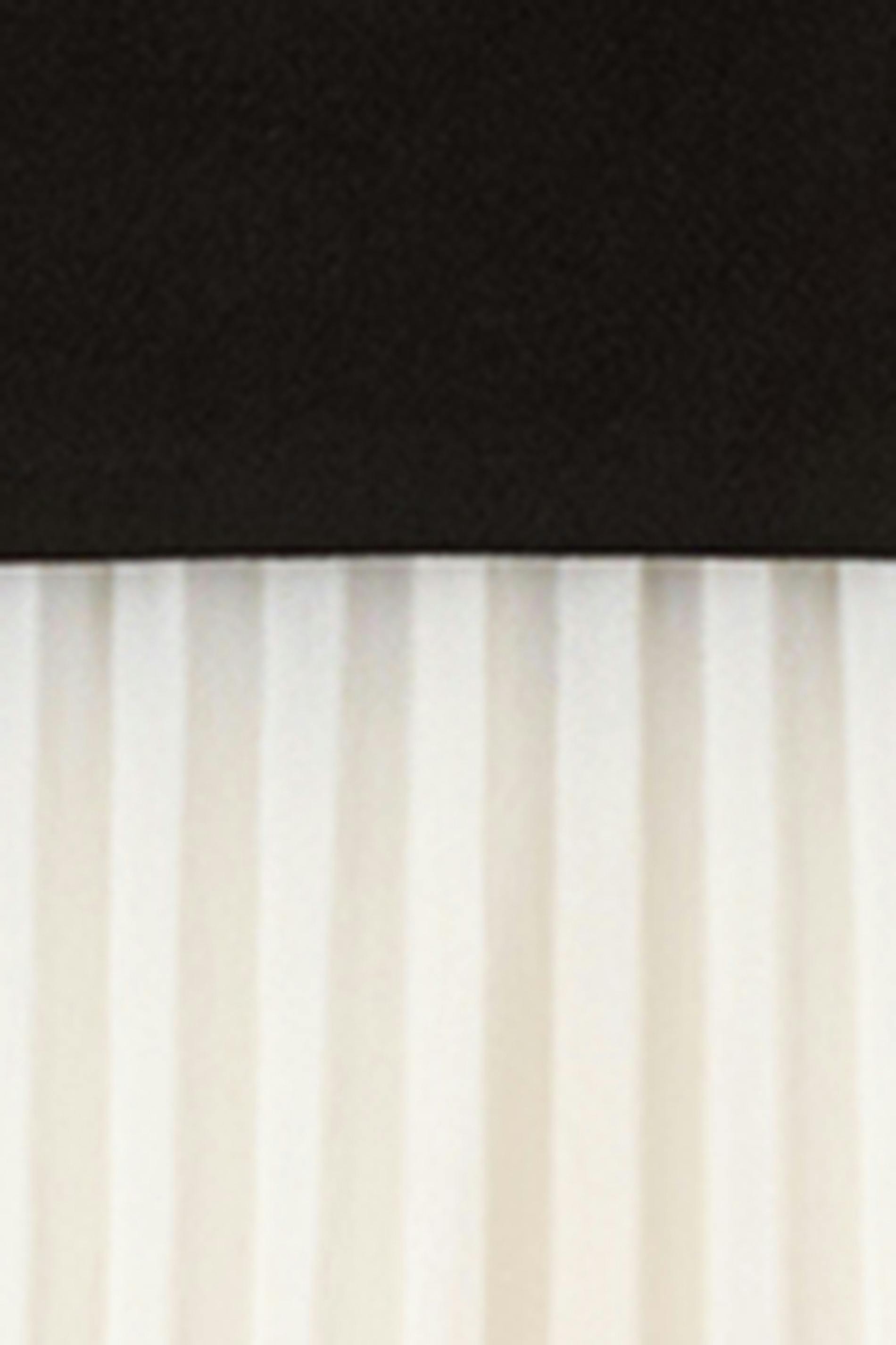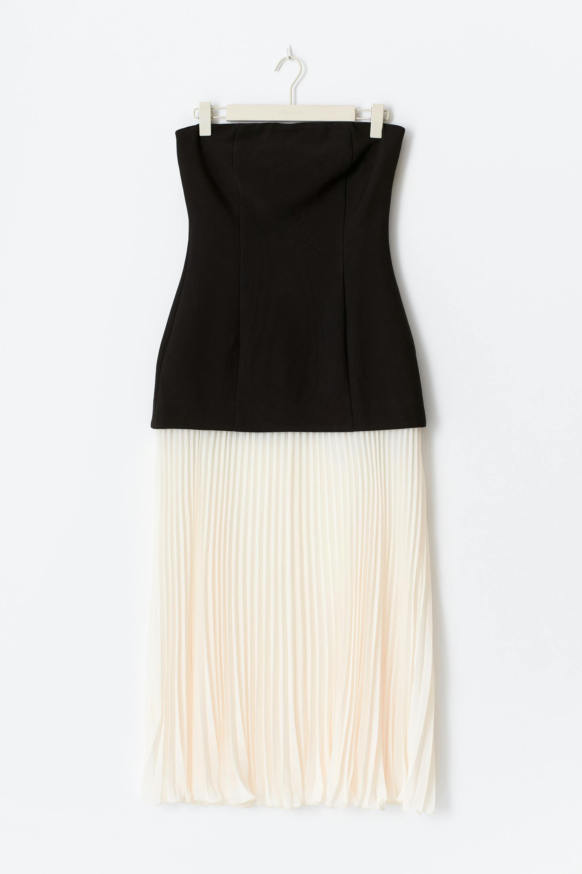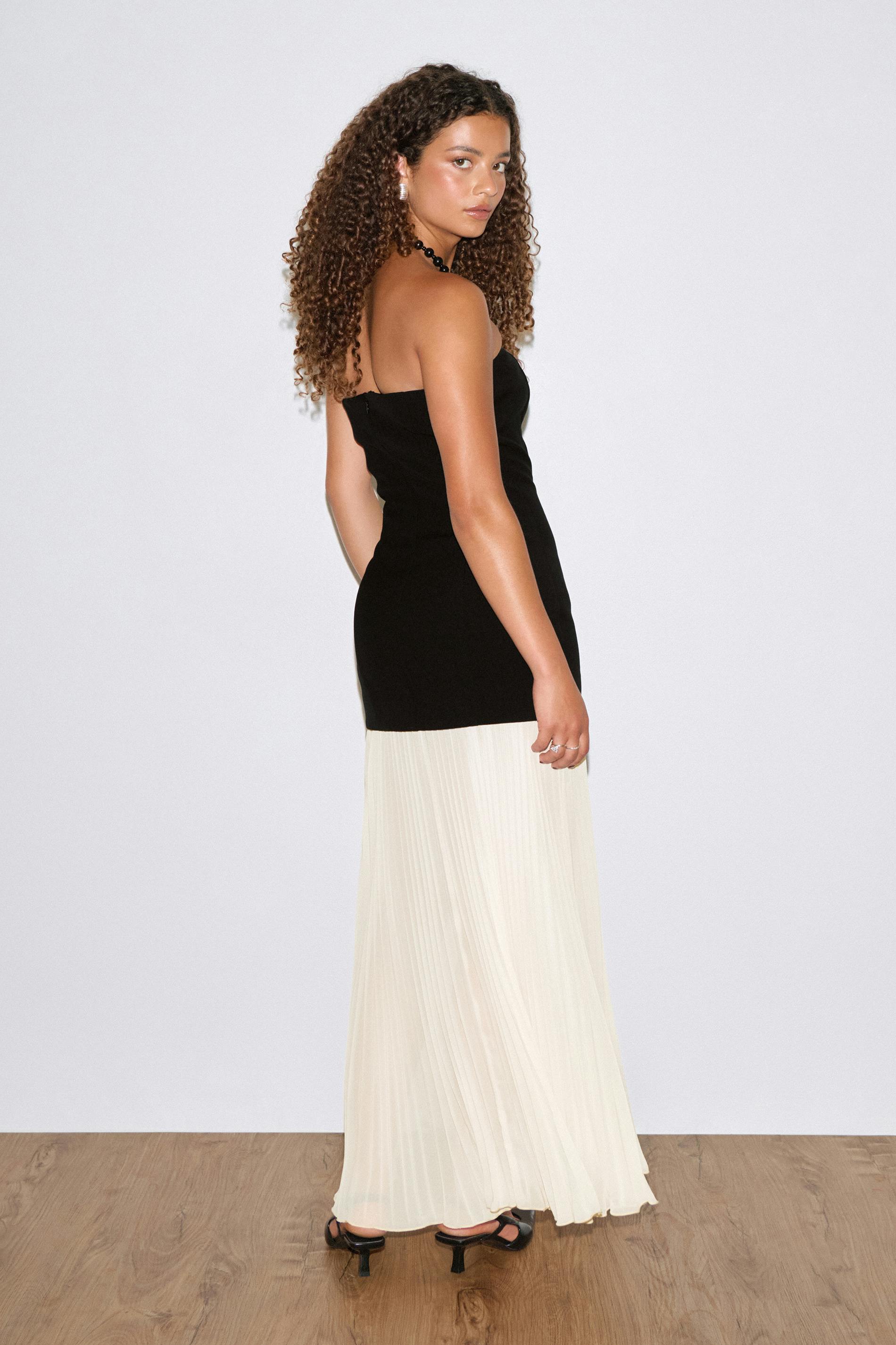 Lång tubklänning med nerhasad midja. Klänningen är svart och har vit, plisserad kjol. Den har maxi-längd, ärmlös design och dragkedja i ryggen.