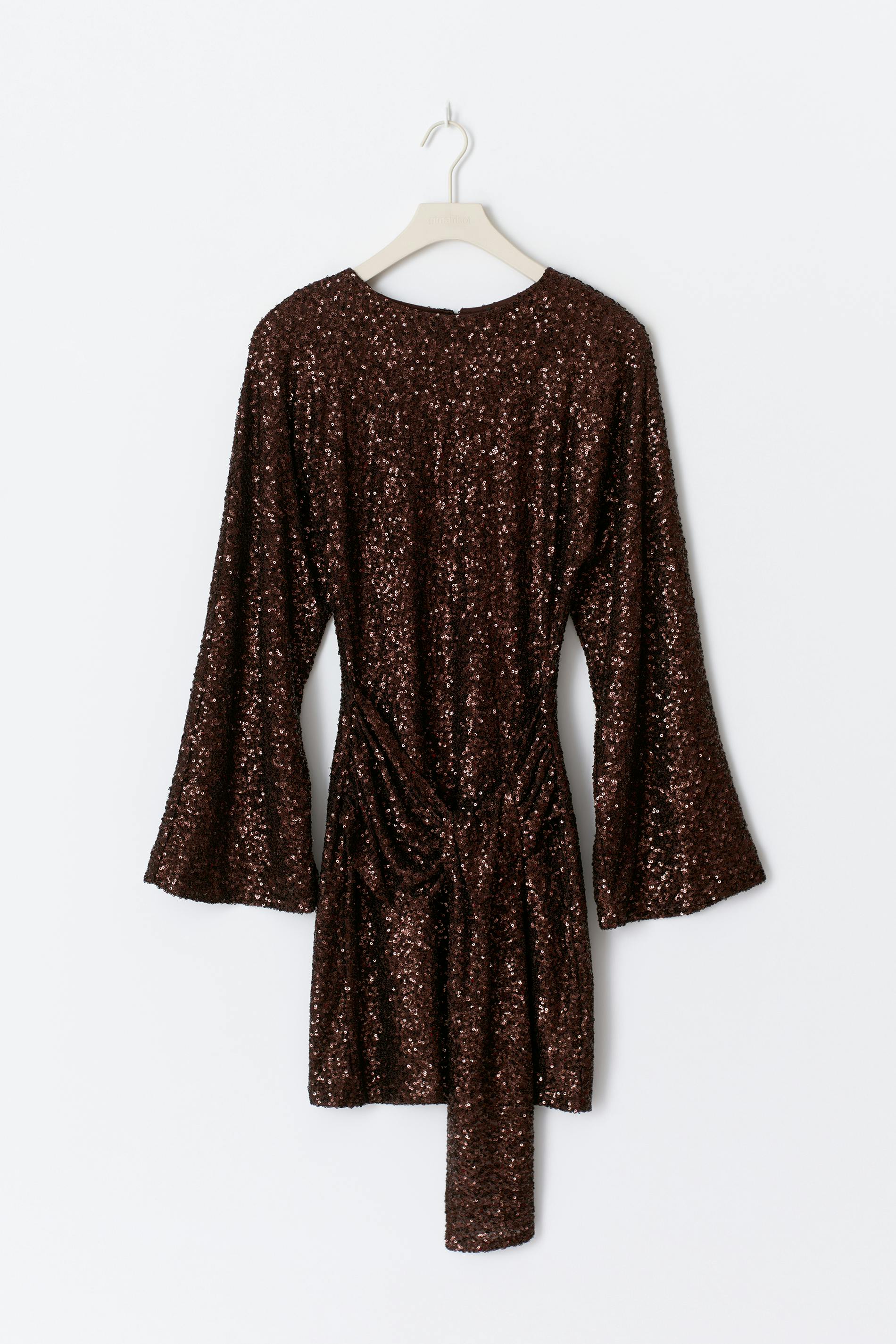 Kort paljettklänning med långa, vida ärmar. Klänningen är brun och har knytdetalj i midjan. Den har rund halsringning och knäppning i ryggen. Helfodrad.