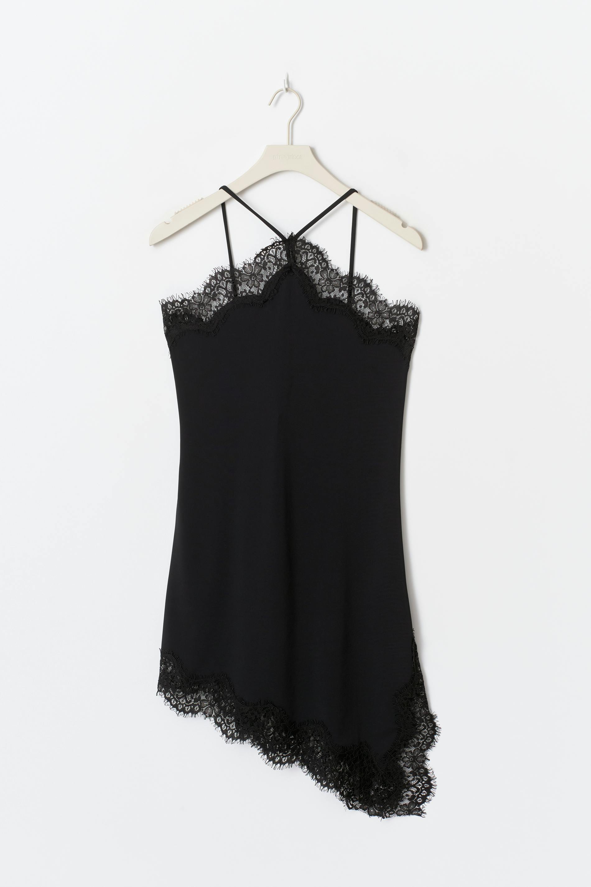 Kort spetsklänning med asymmetrisk nederkant. Klänningen är svart och har ärmlös design. Den har normal passform och en slits i sidorna.
