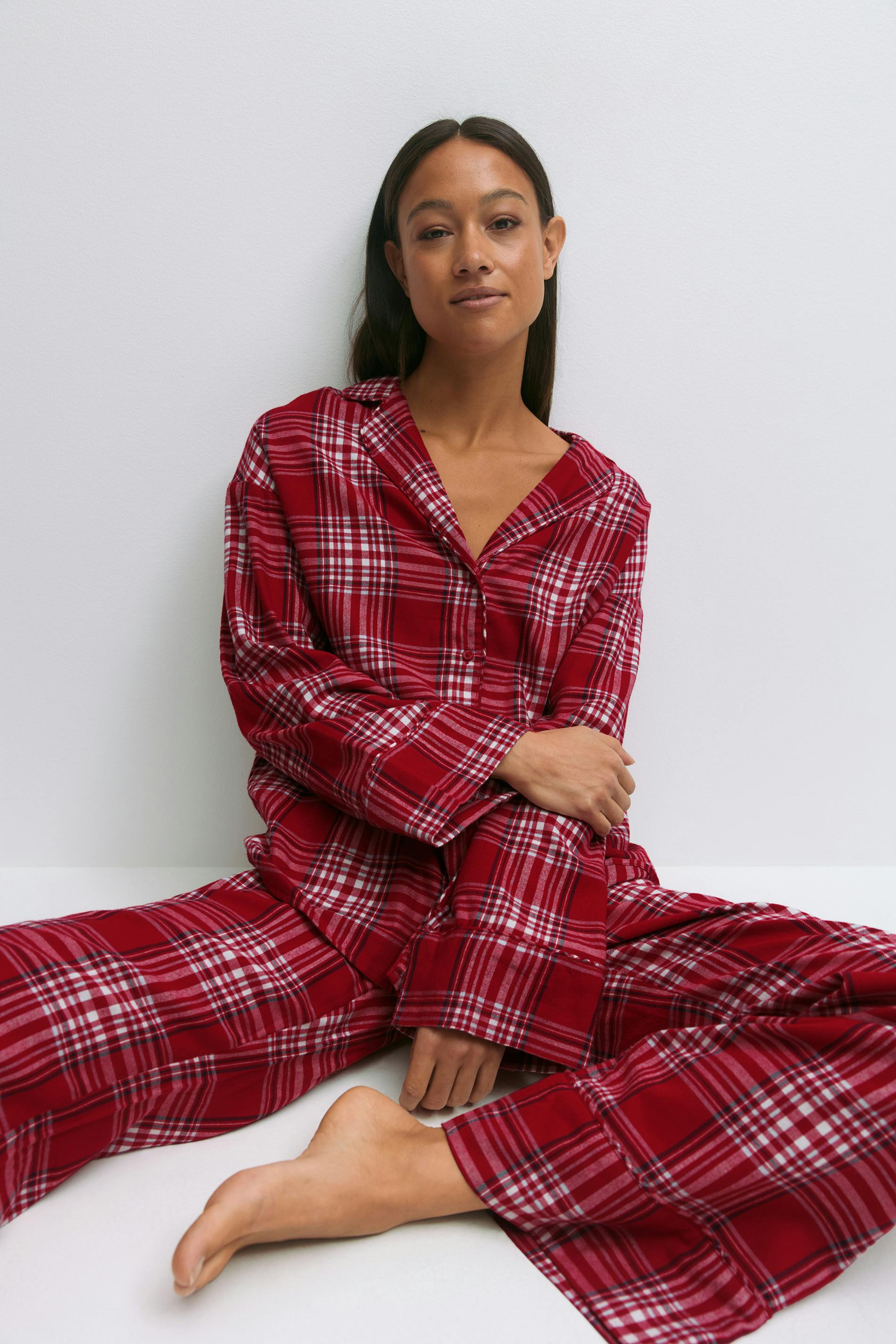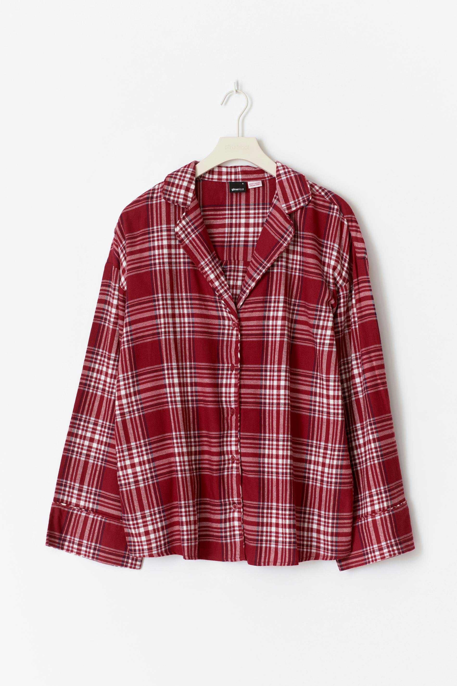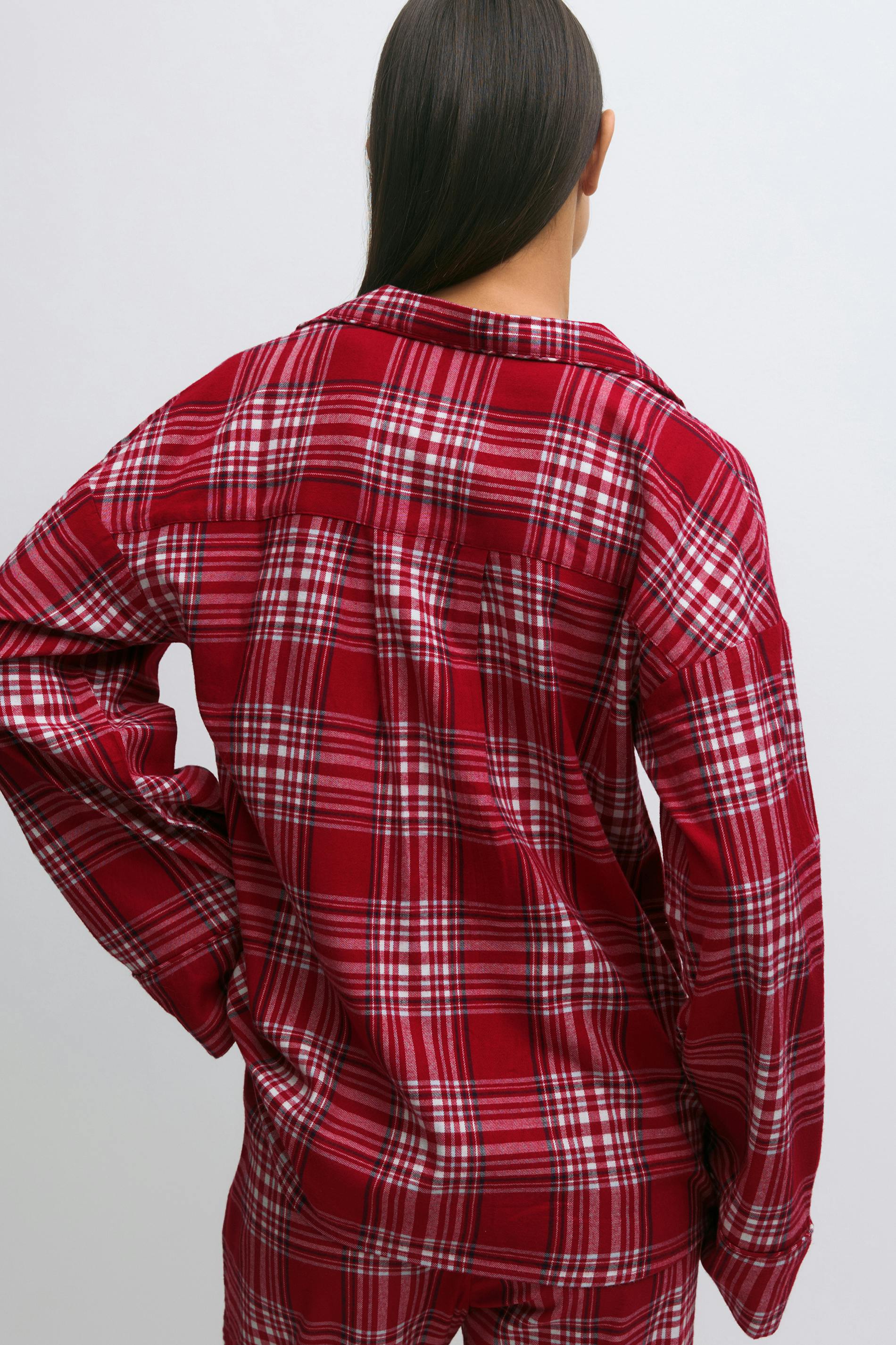 Rutig pyjamasskjorta i flanell med knäppning fram. Skjortan är röd och har oversize fit. Den har krage, okavskärning med veck bak och långa ärmar med breda manschetter.