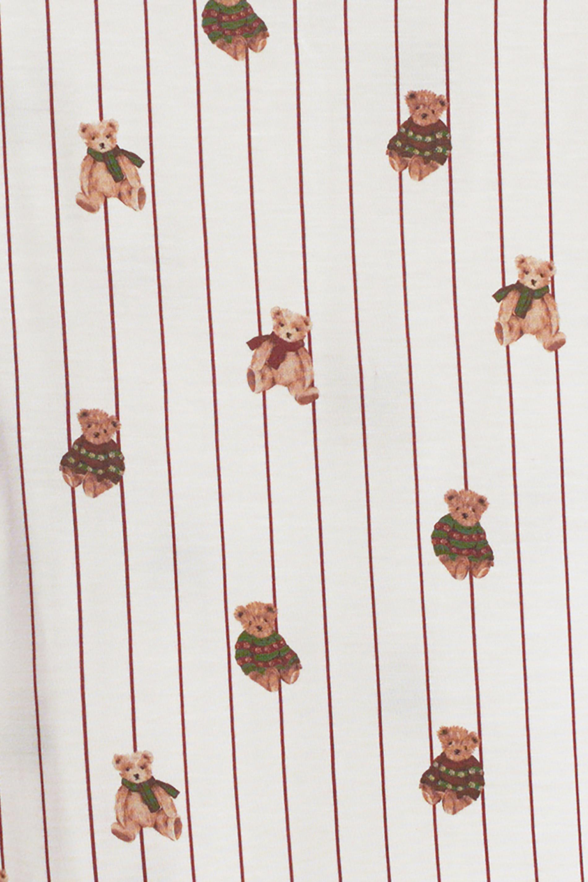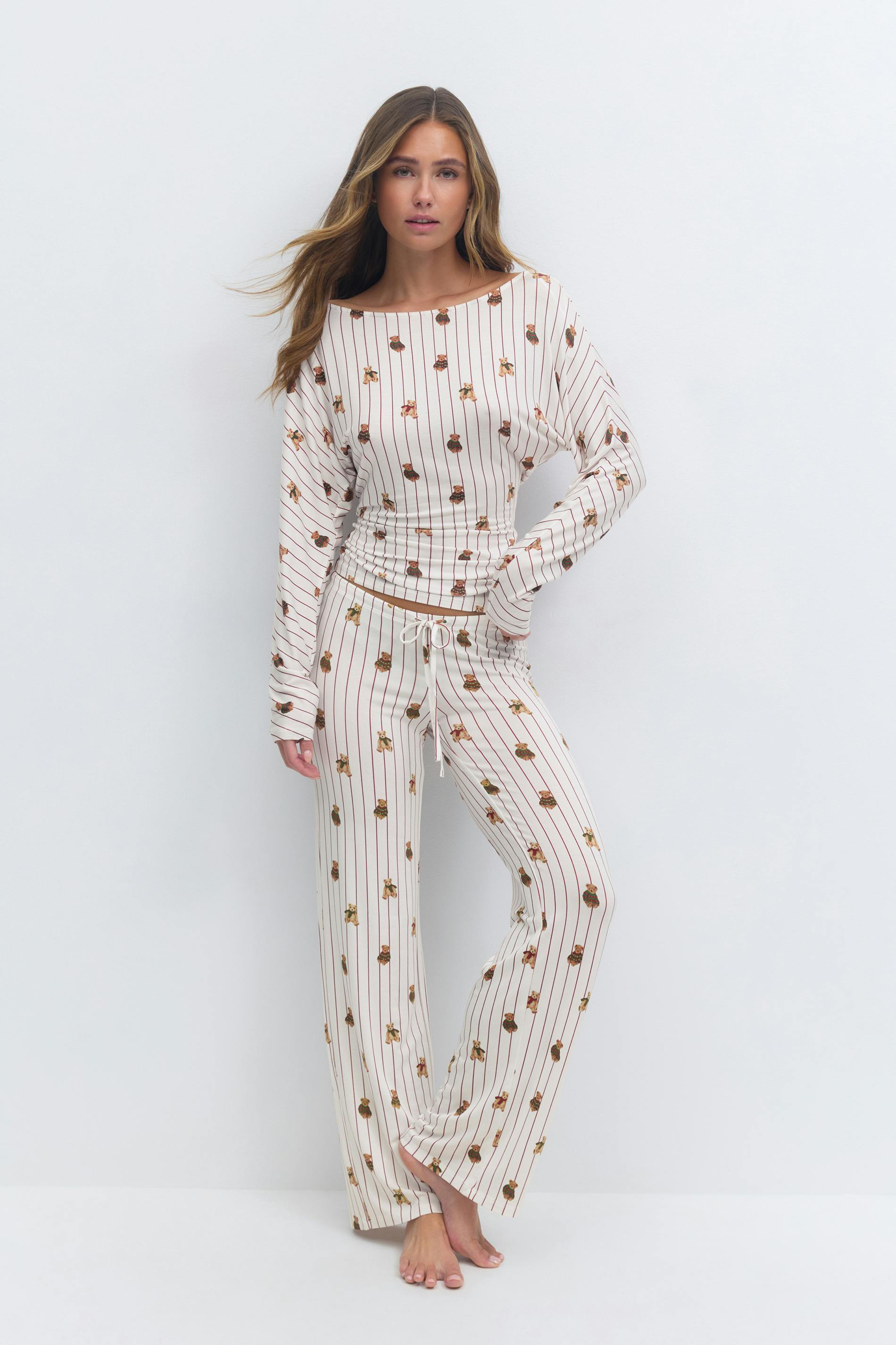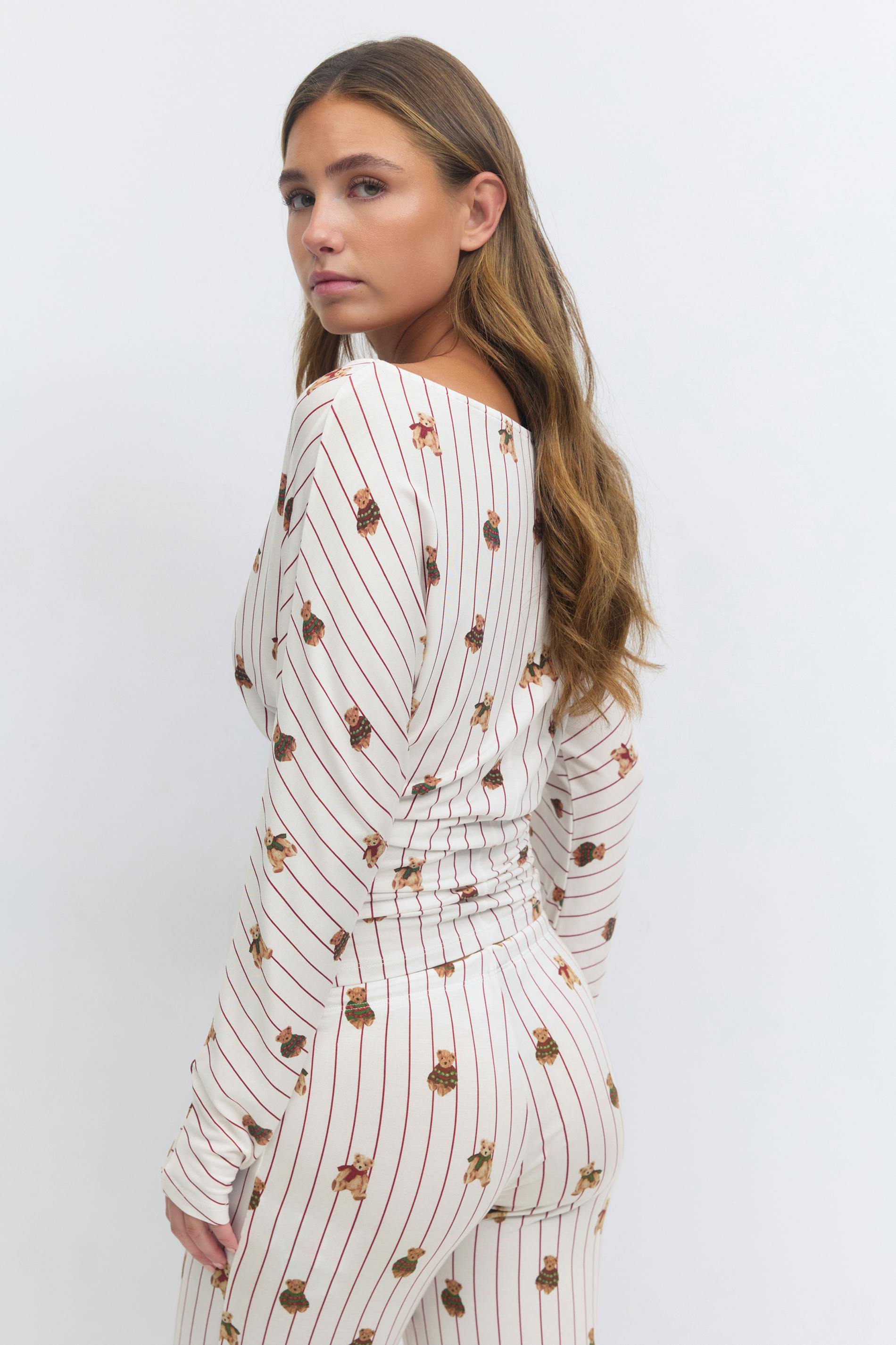 Randig pyjamastopp med små nallebjörnar. Toppen är långärmad och har båtringning. Den har mjuk kvalitet, lös passform upptill och figurnära midja.