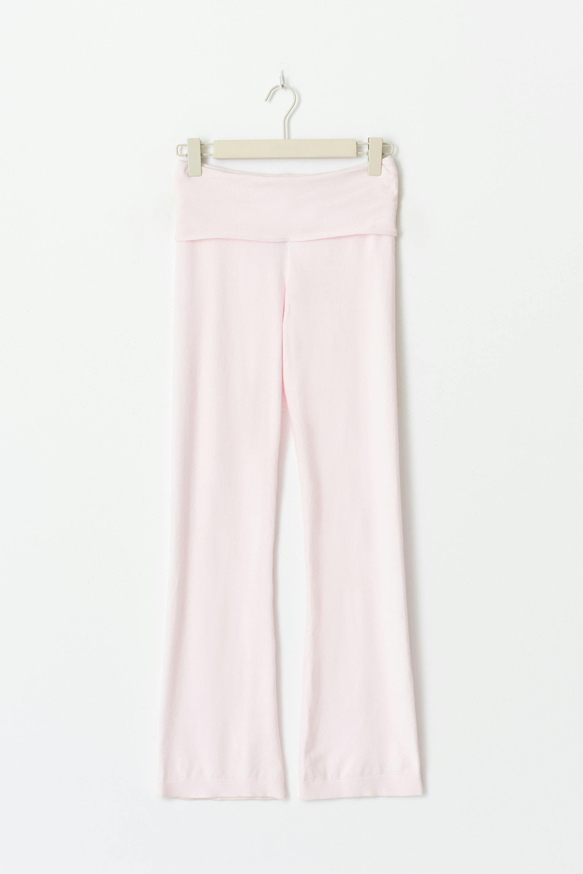 Stickade yoga pants med bakfickor. Byxorna är rosa och har nervikt midja. De har utsvängda ben, mjuk kvalitet och låg midja.