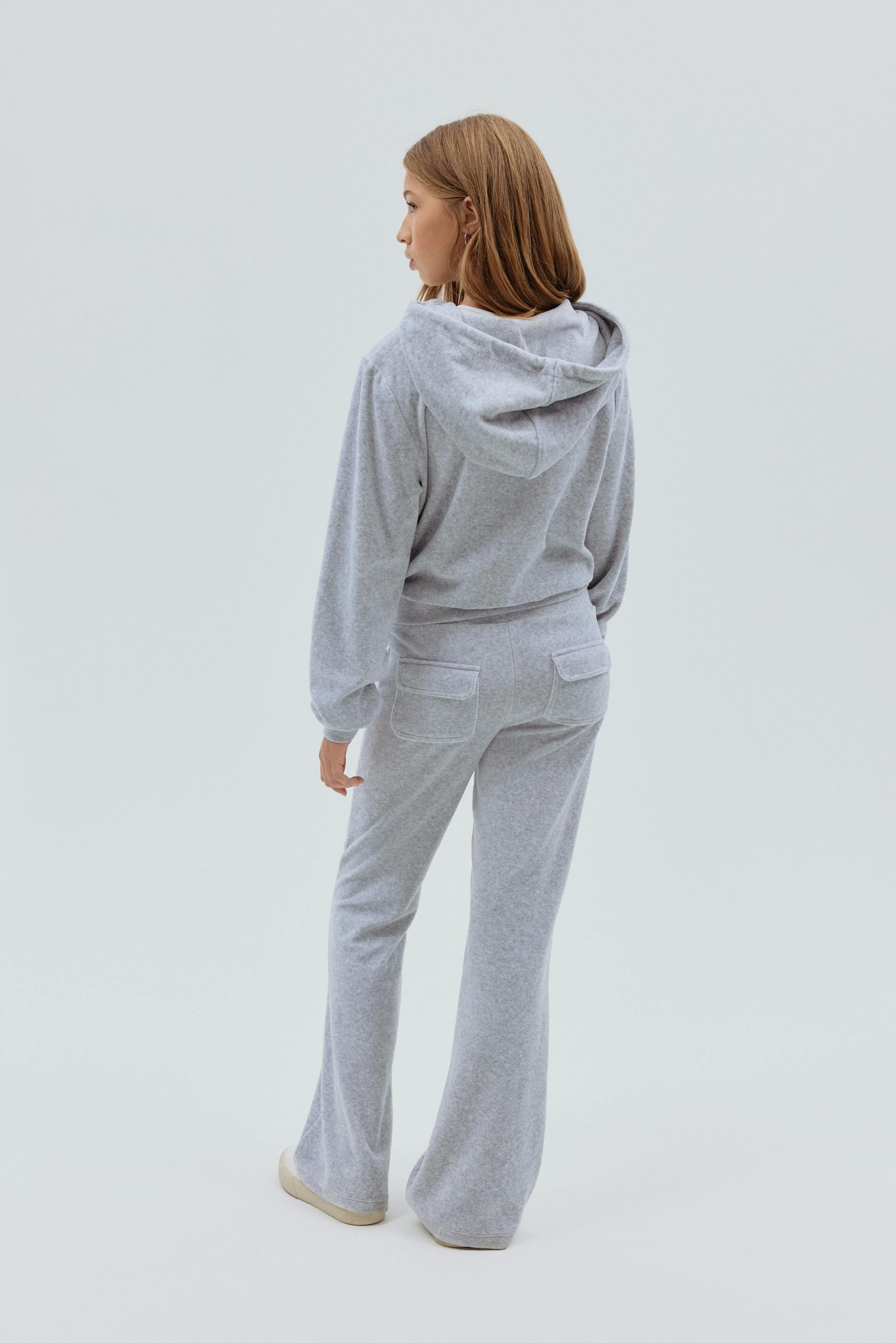 Velour trousers with a regular waist. The trousers are light grey and have a full length. They have flap pockets at the back with a button and an elasticized waistband.