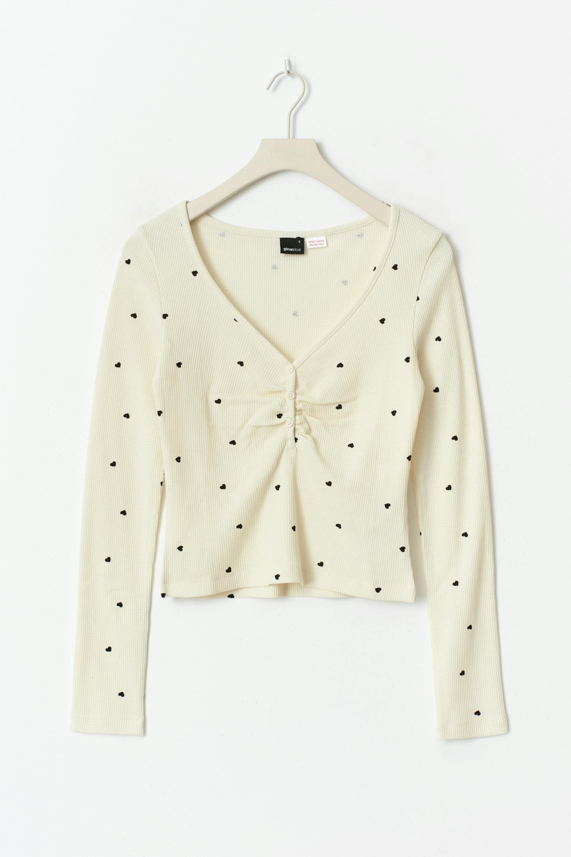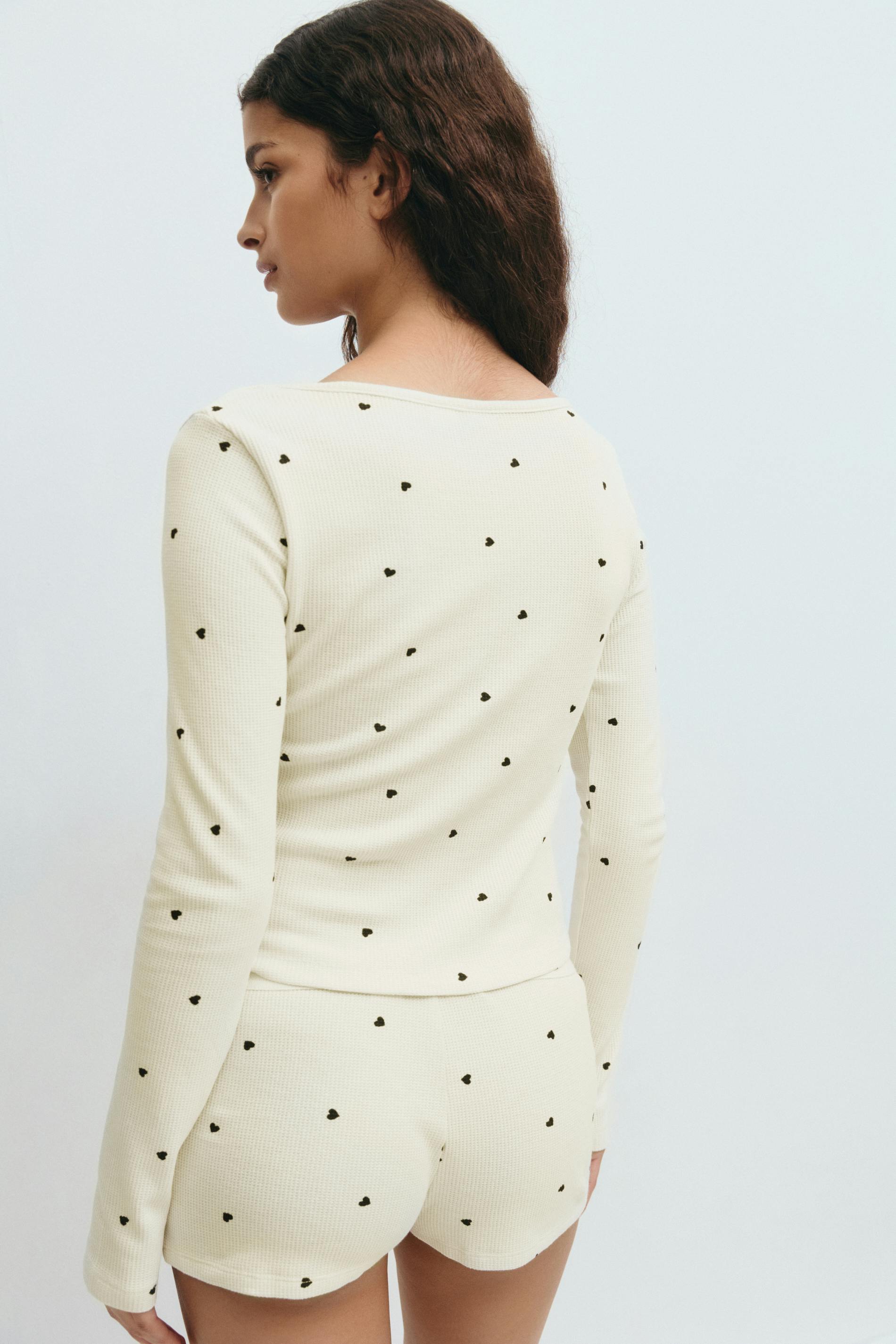 Långärmad pyjamastopp med små, svarta hjärtan. Toppen är beige och har rynkad byst. Den har strukturerat material, normal passform, v-ringning, knappar upptill och normallängd.