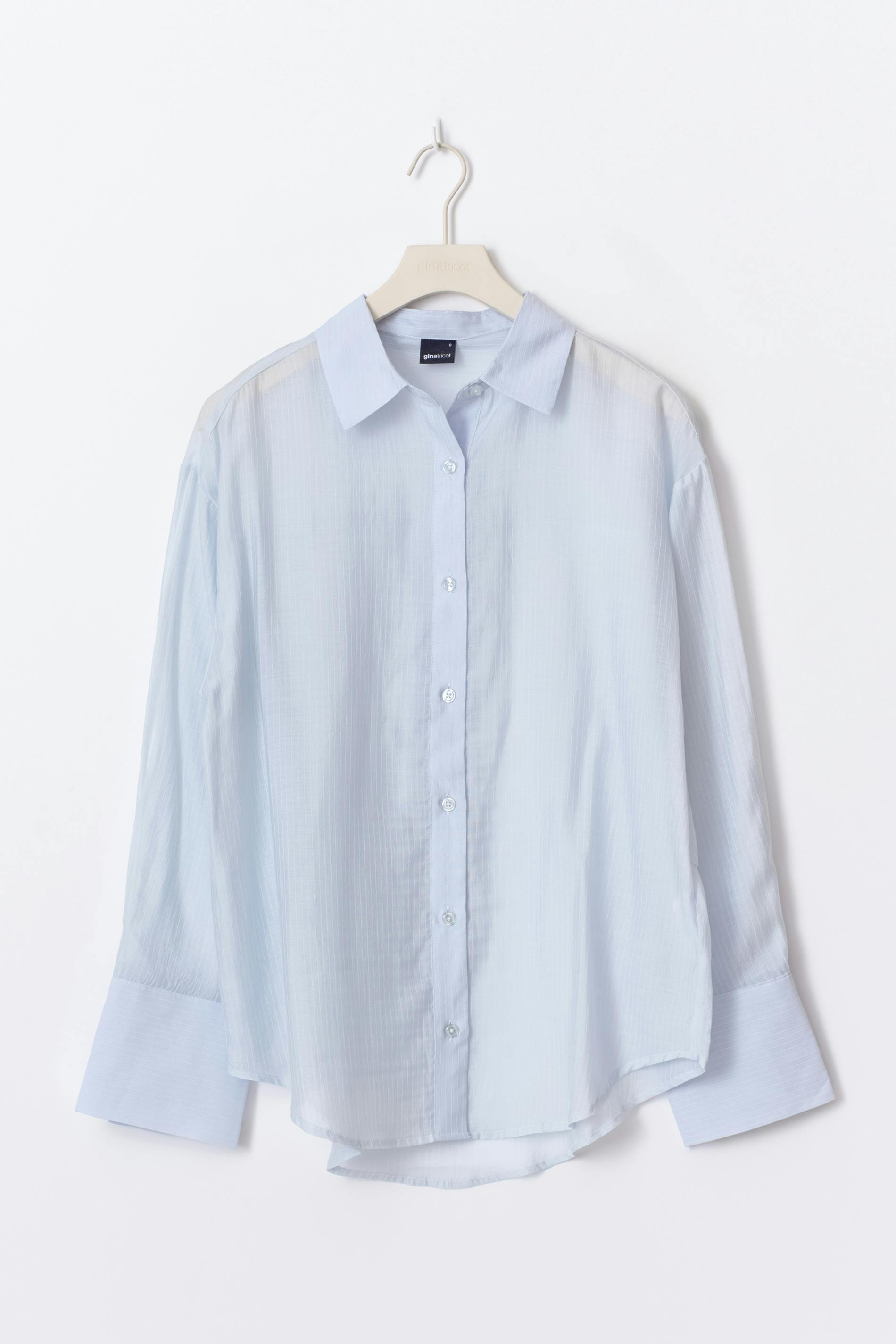 Randig skjorta med lös passform. Skjortan är blå och skir och har plisserat material. Den har krage, knäppning framtill och lång ärm med knapp och manschett.