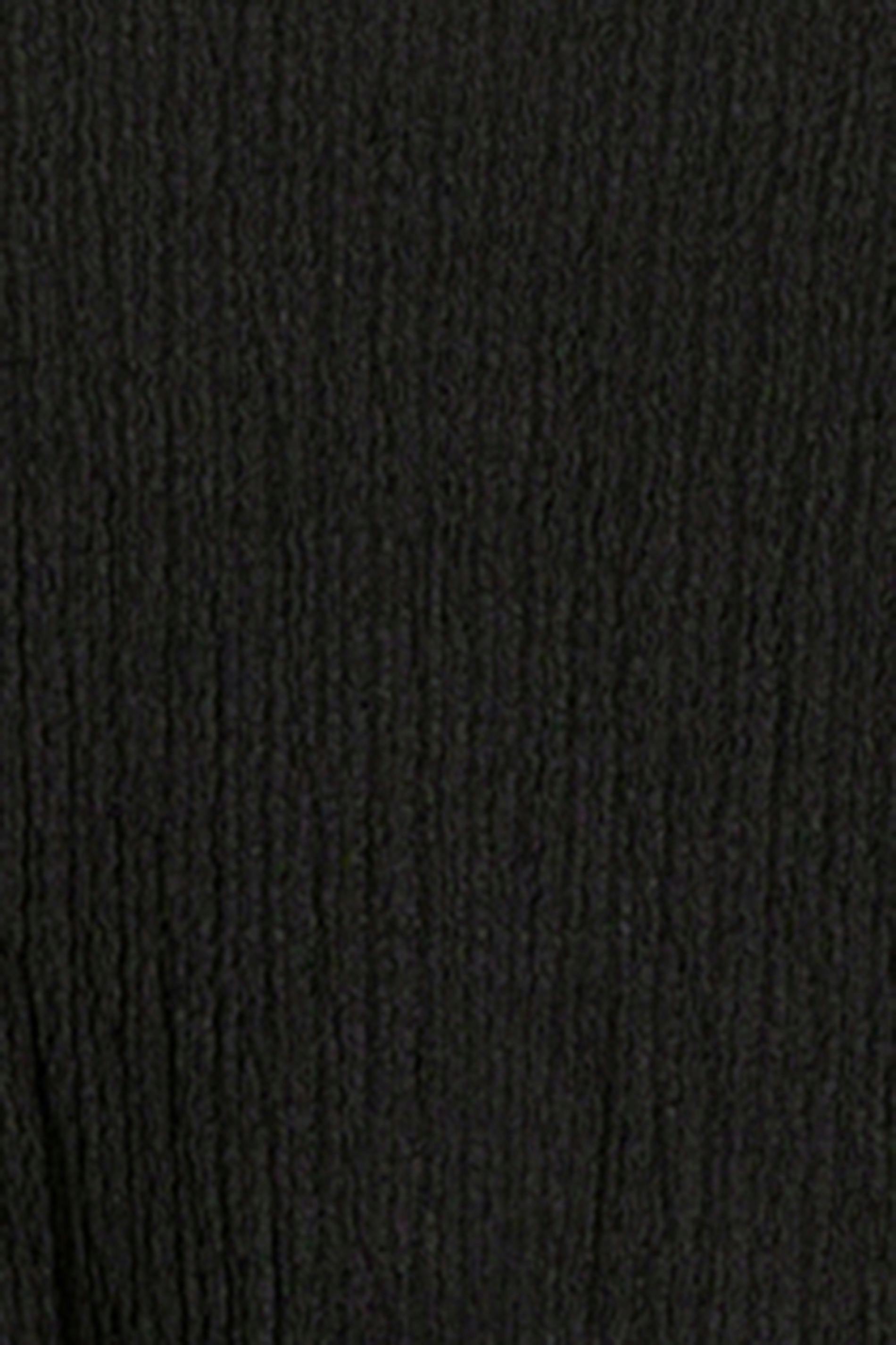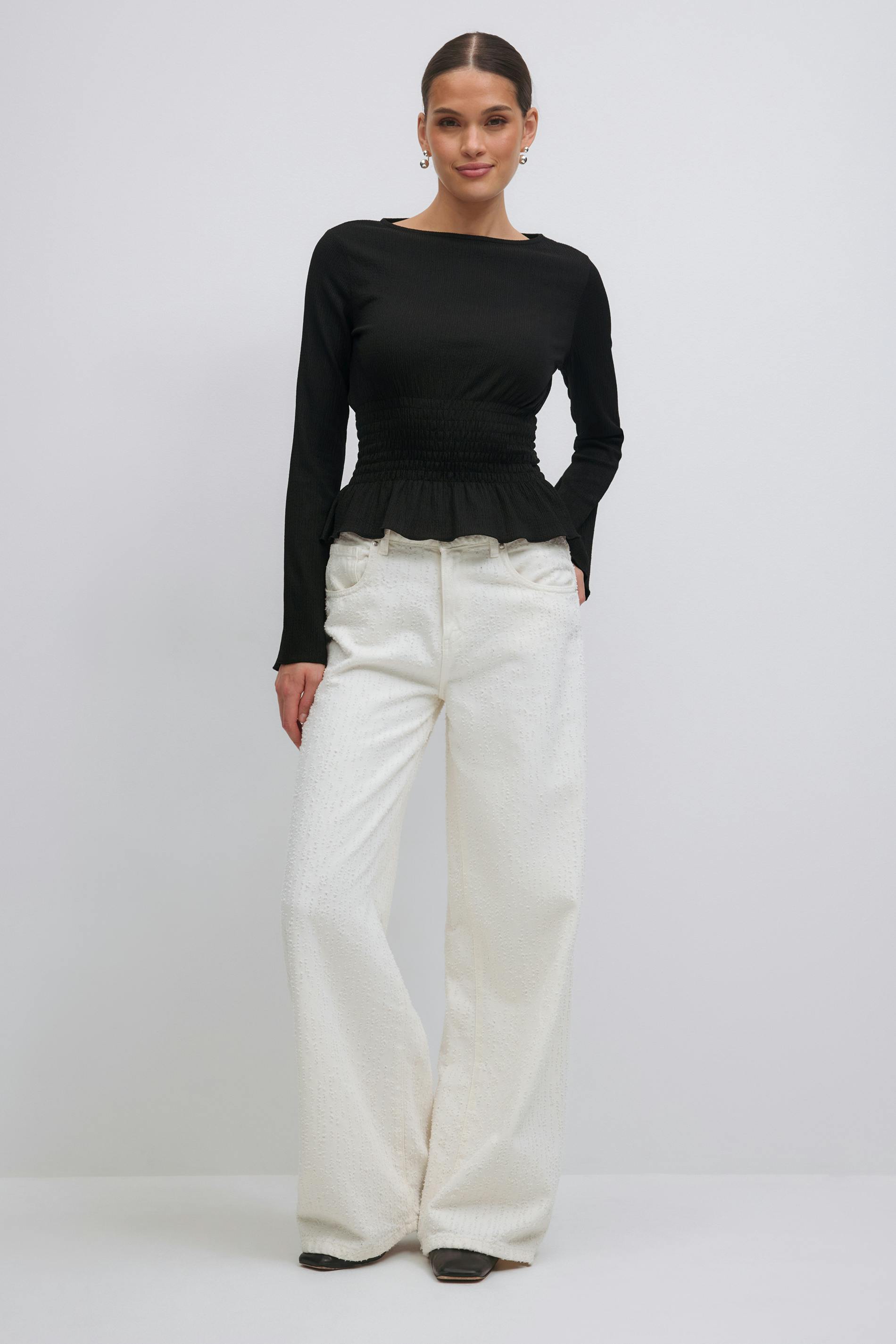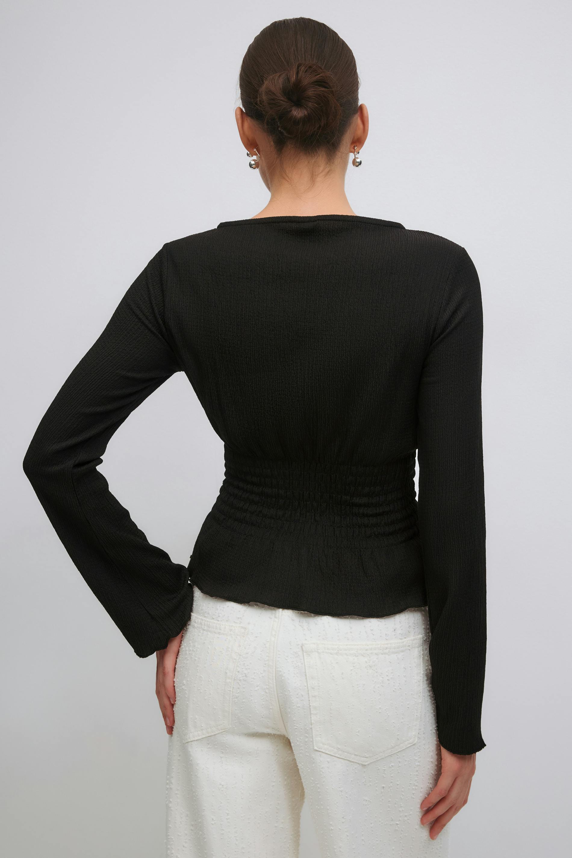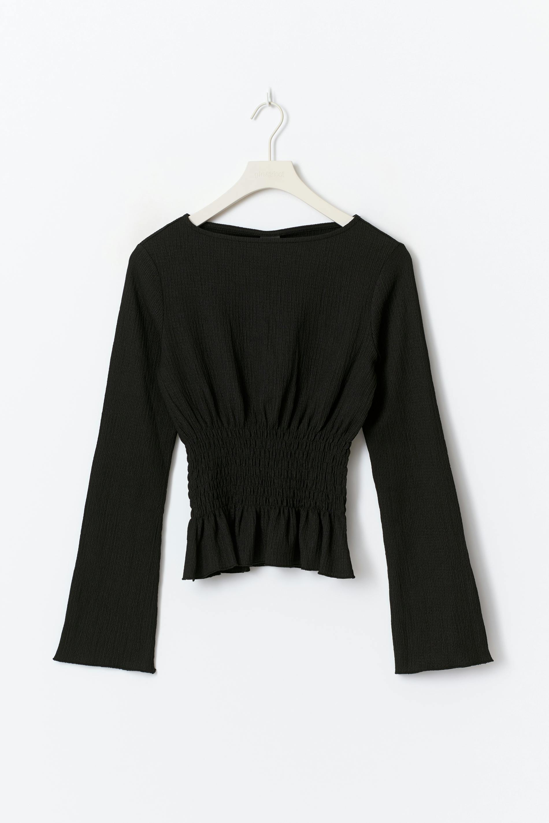 Topp med smock i midjan. Toppen är svart och har volang i nederkant. Den har båtringning, långa ärmar, texturerat material och normallängd.