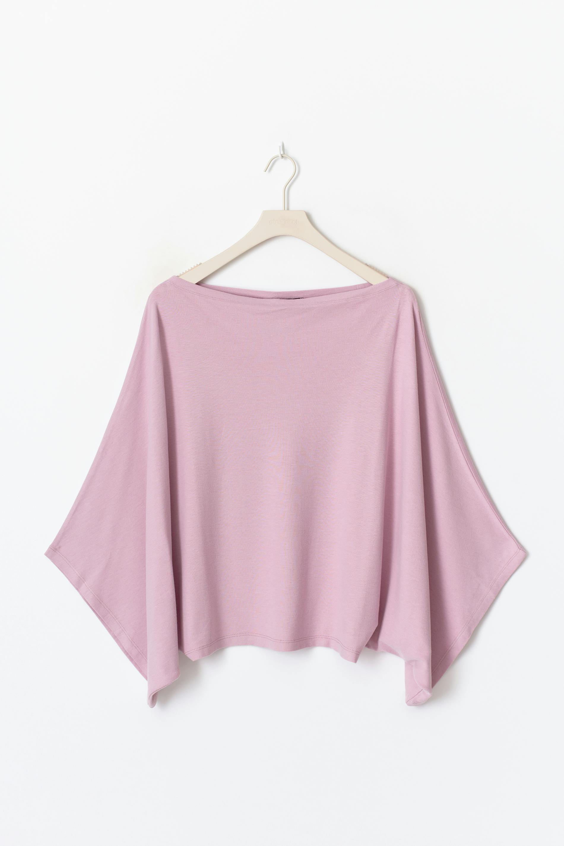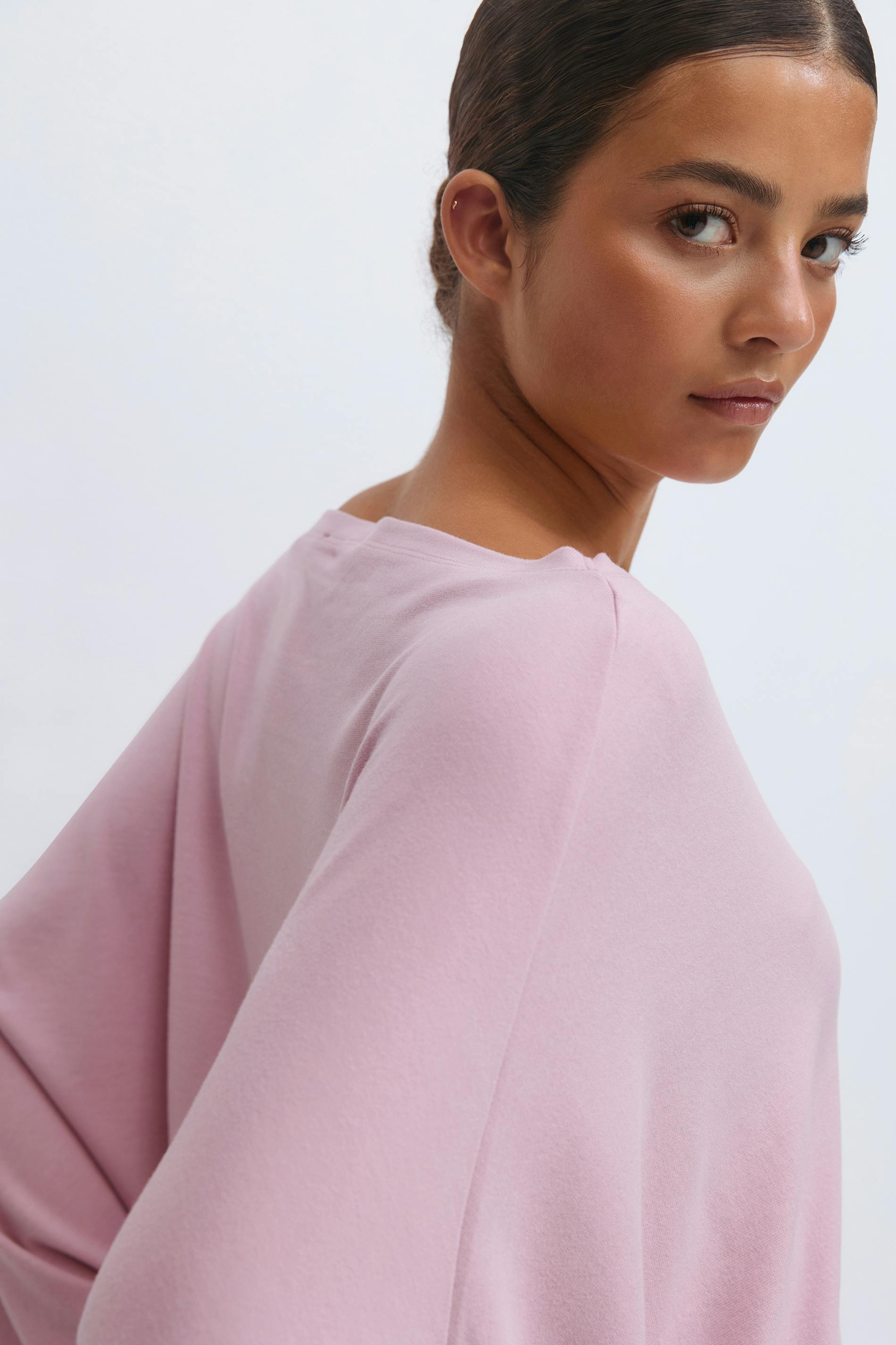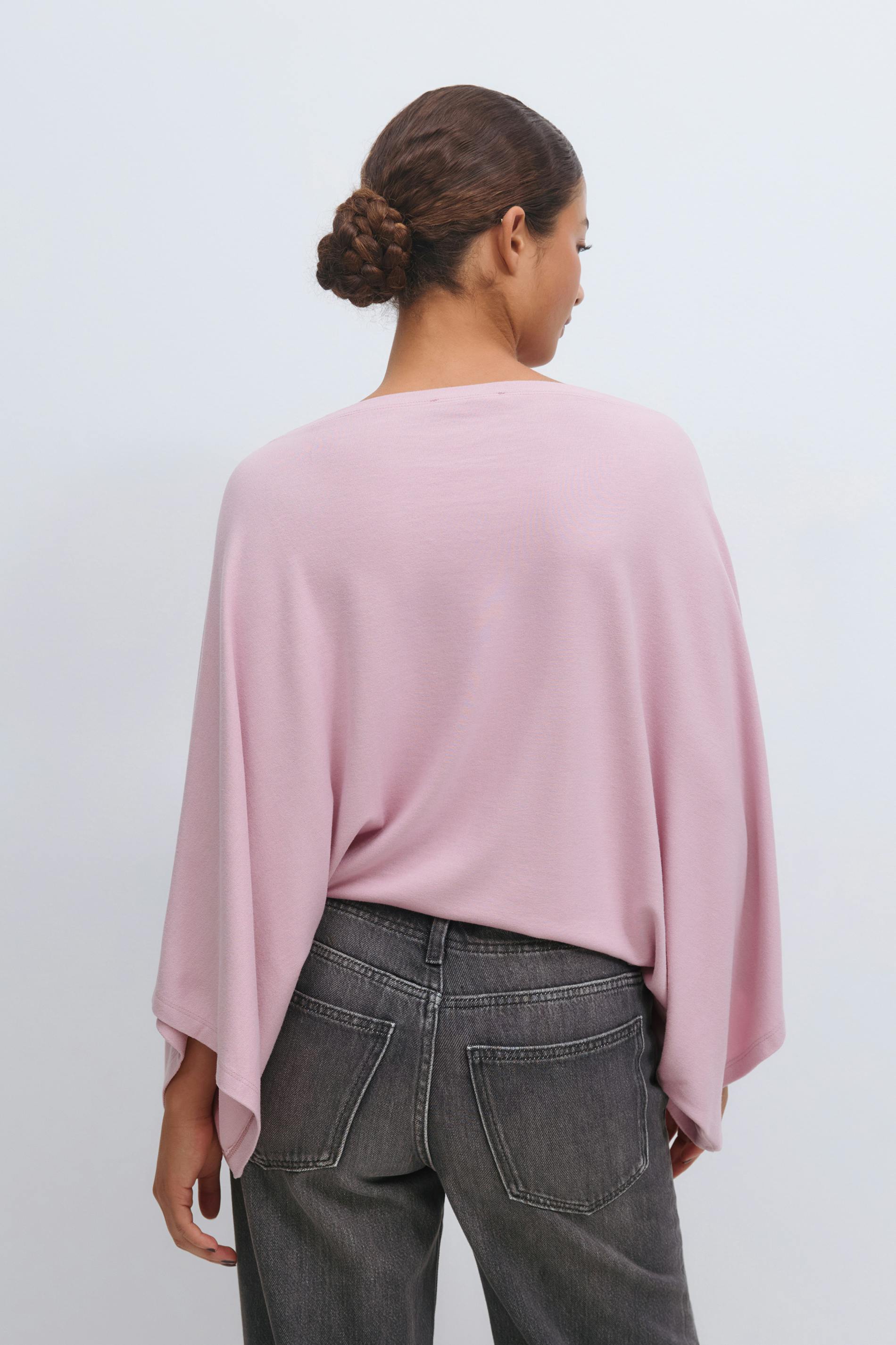 Kort poncho med en vid ärm. Ponchon är rosa och har en båtringning. Den har en lös passform.