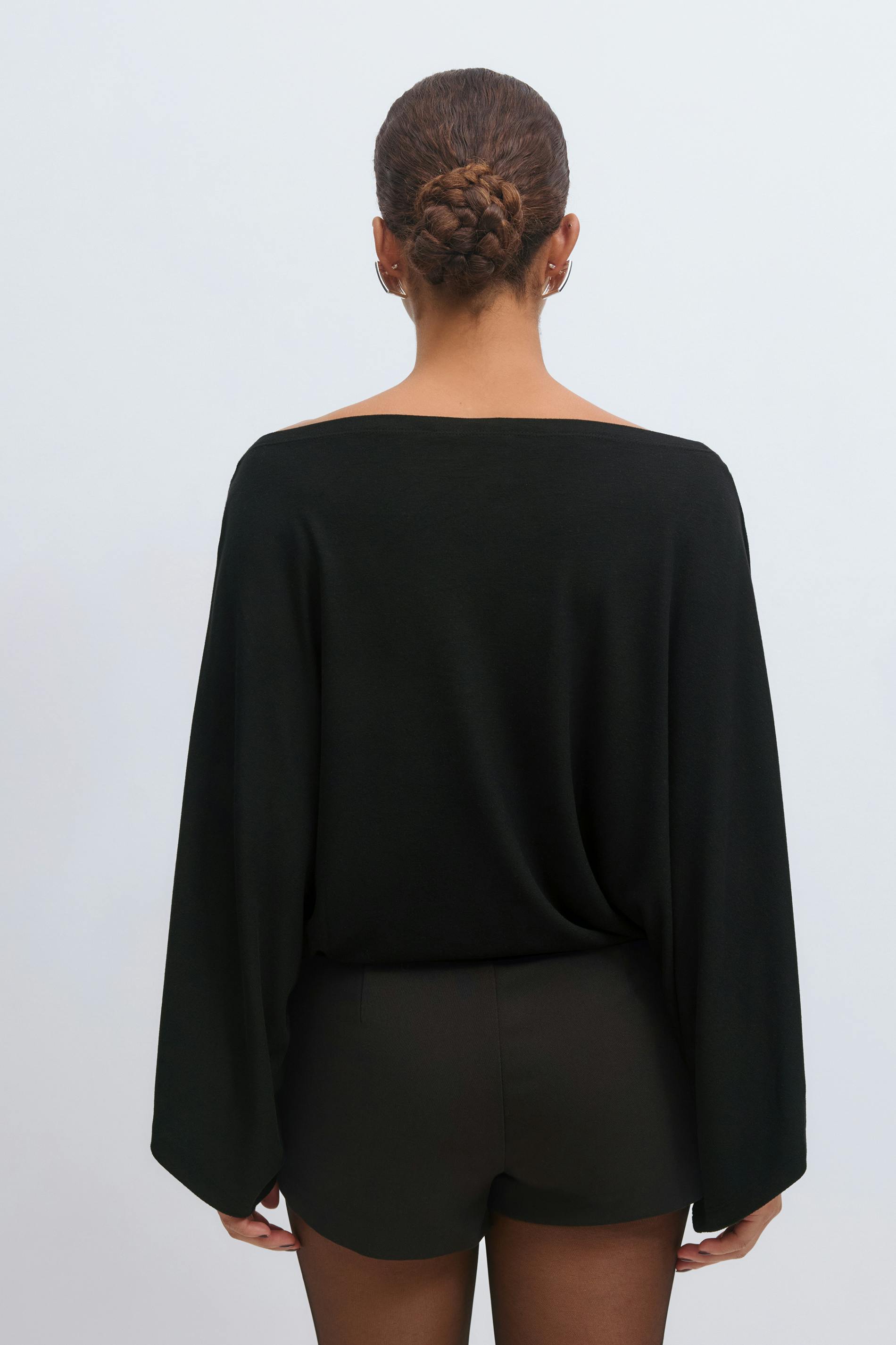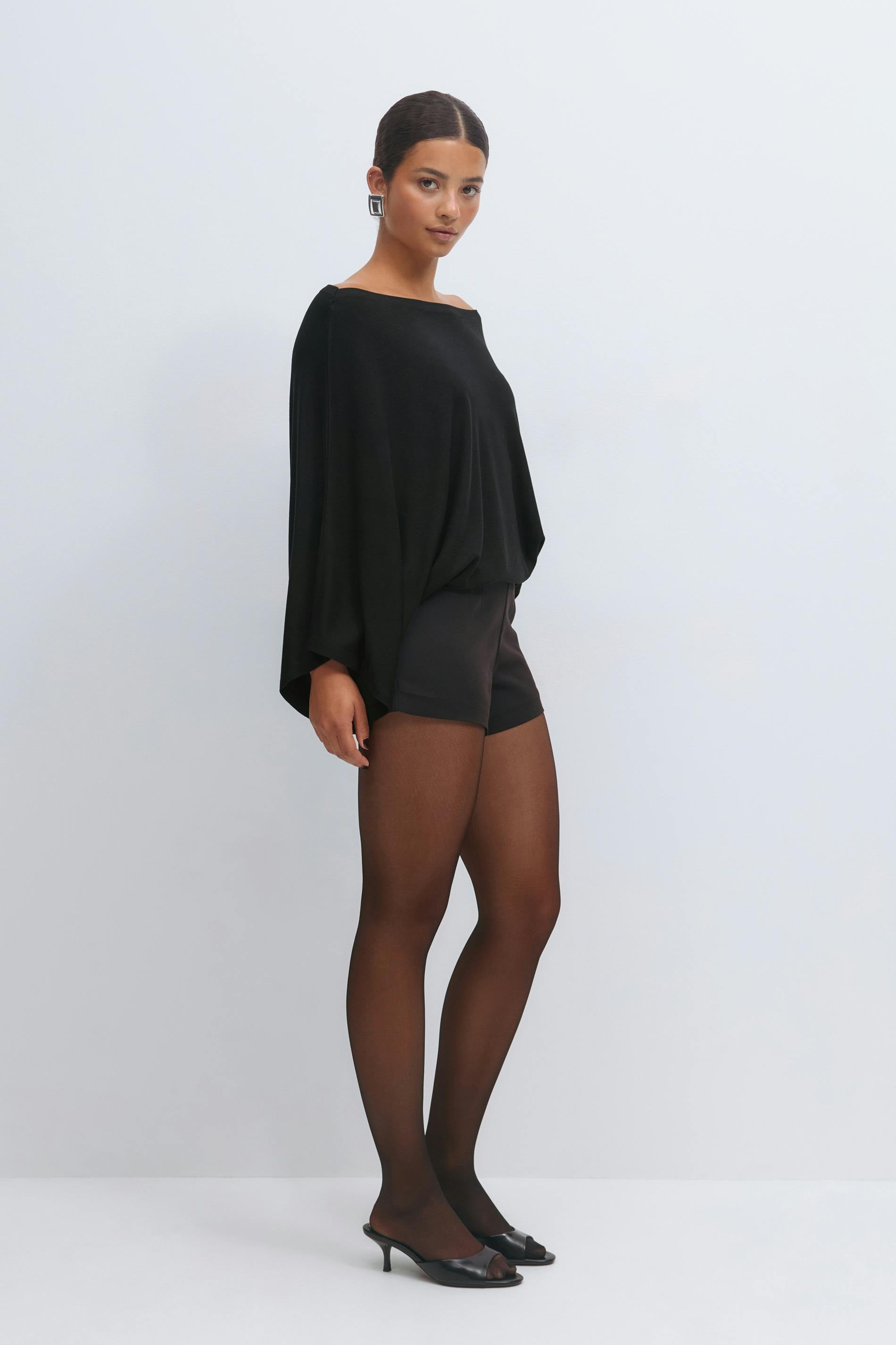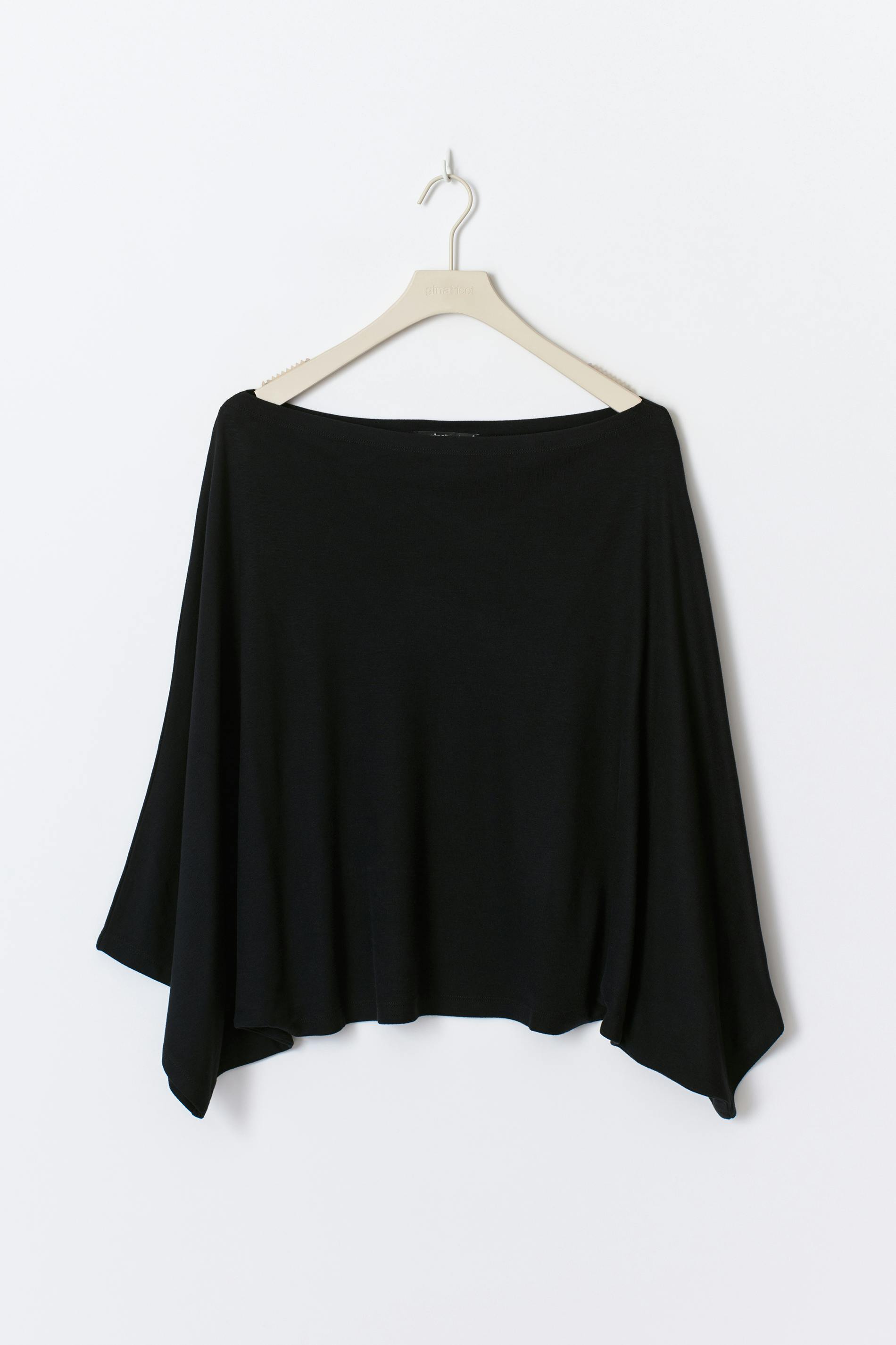 Kort poncho med en vid ärm. Ponchon är svart och har en båtringning. Den har en lös passform.