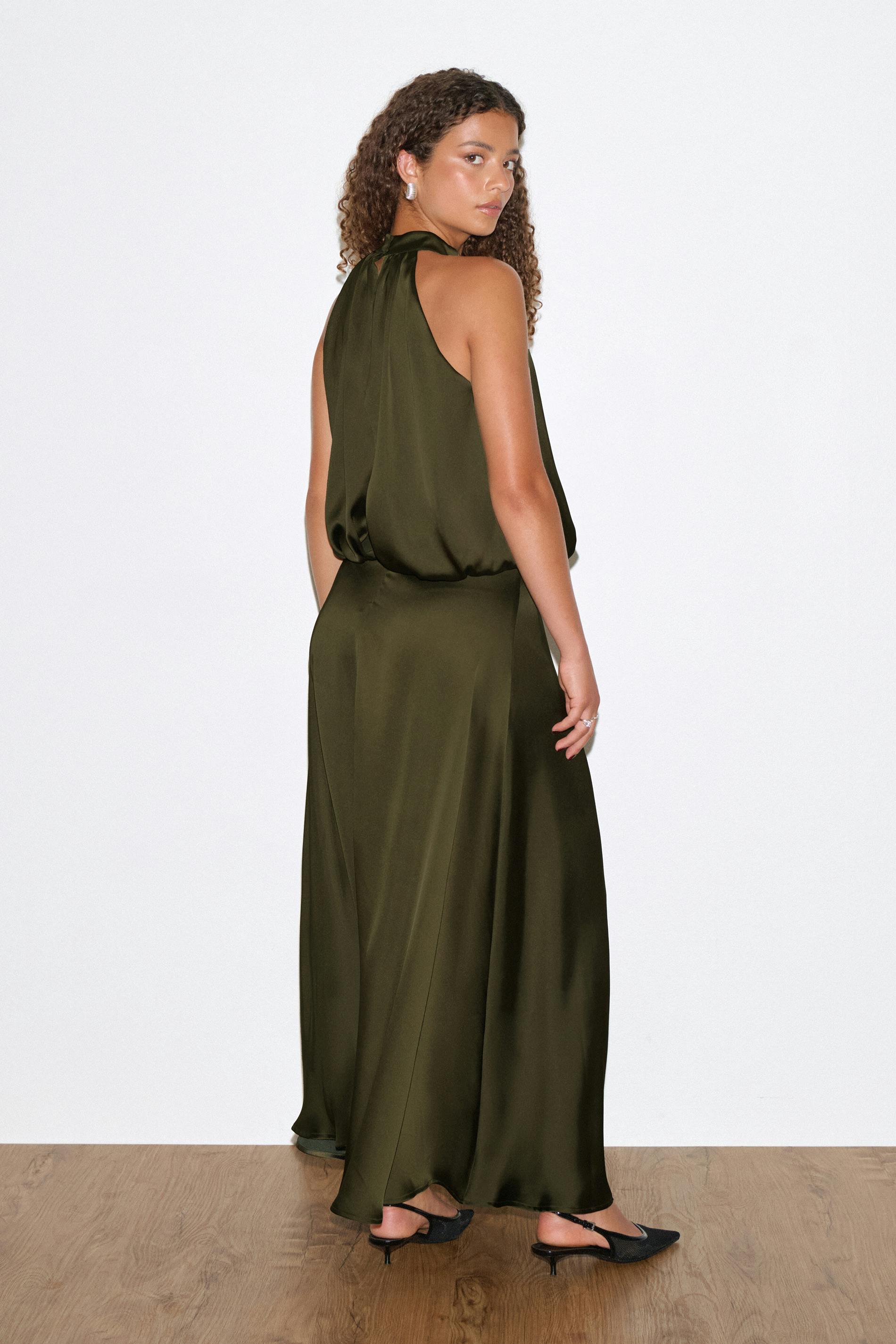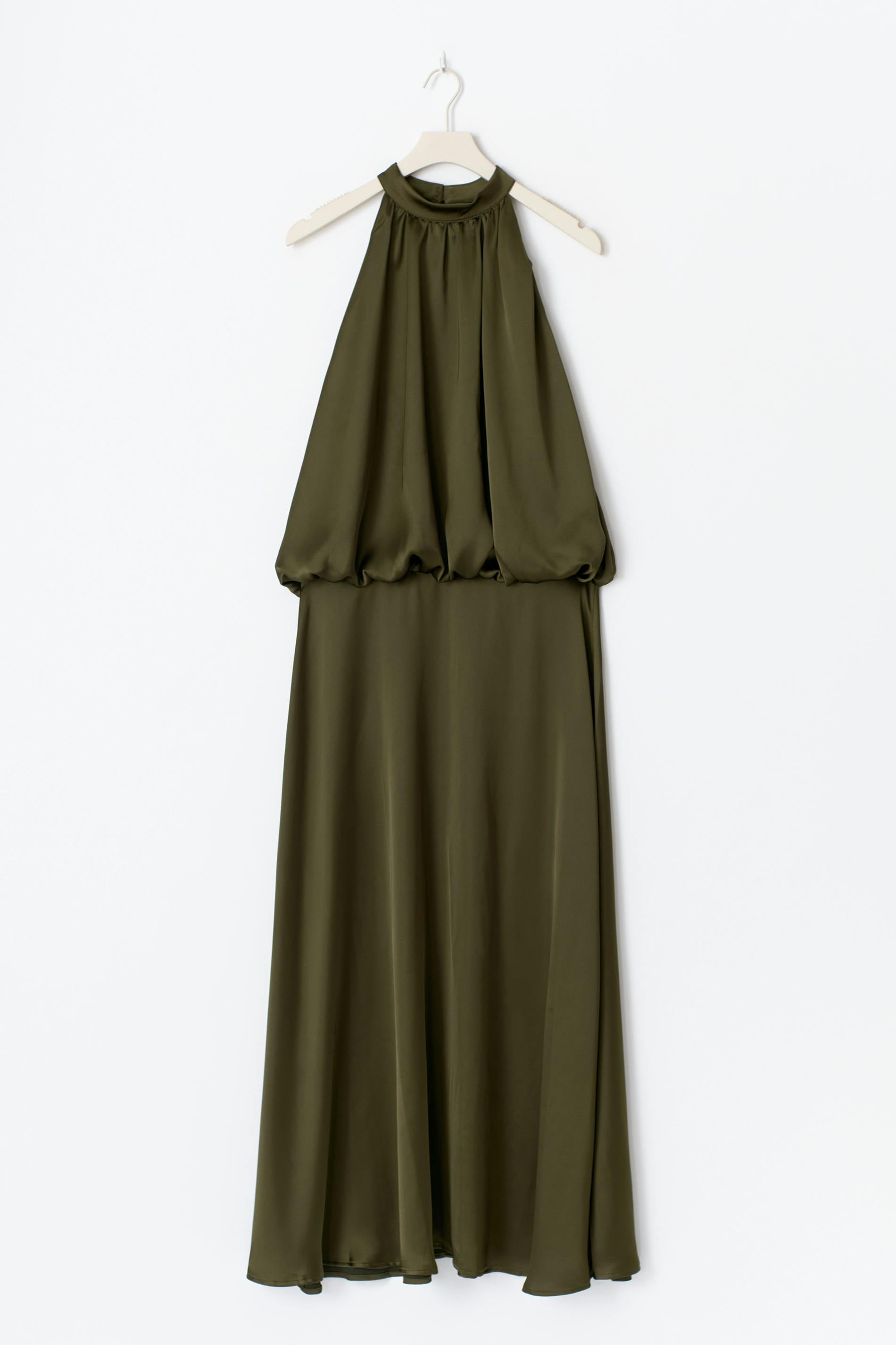 Lång satinklänning med halterneckdesign. Satinklänningen är grön och har glansig kvalitet. Den har ärmlös design, normal passform och knäppning i nacken.