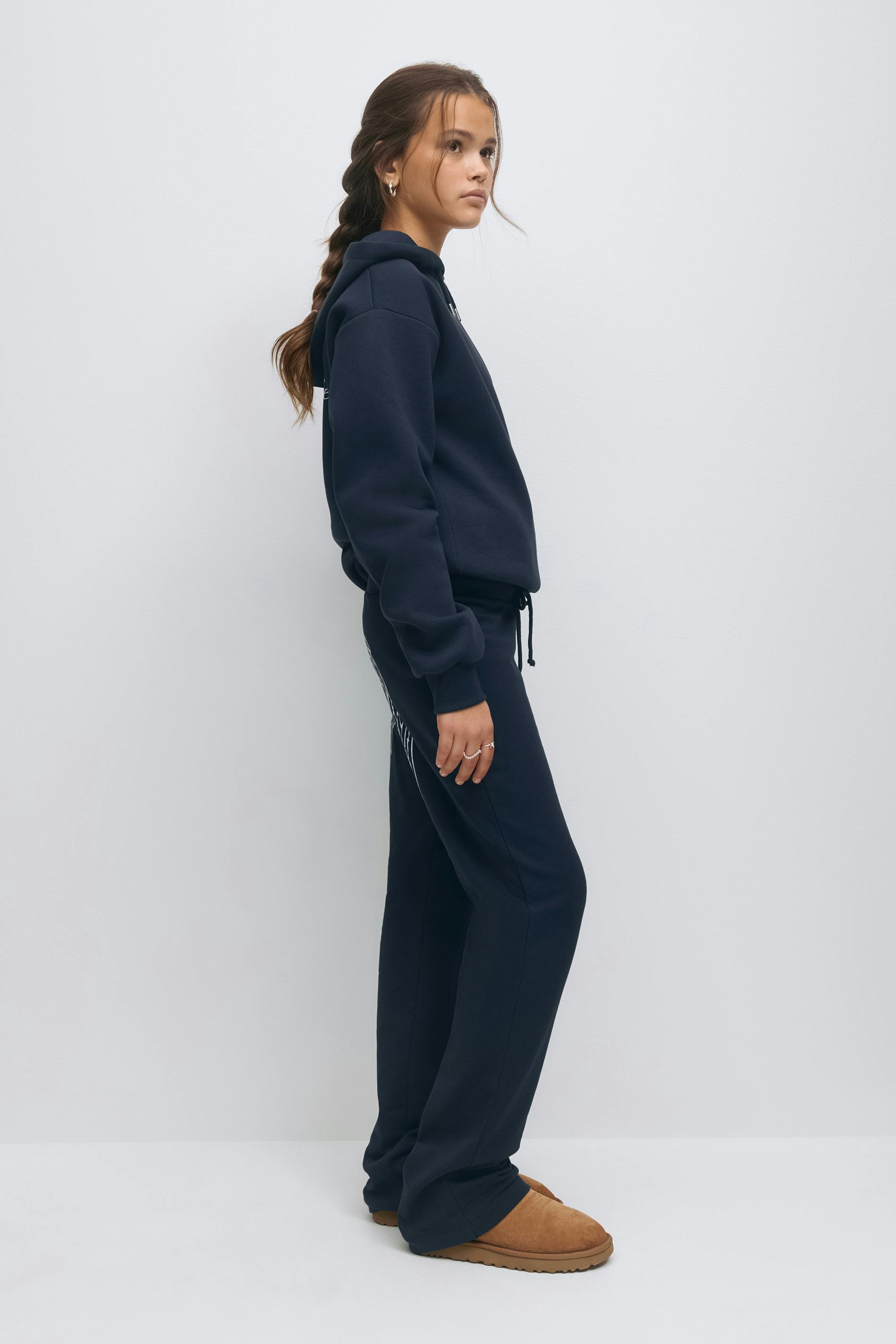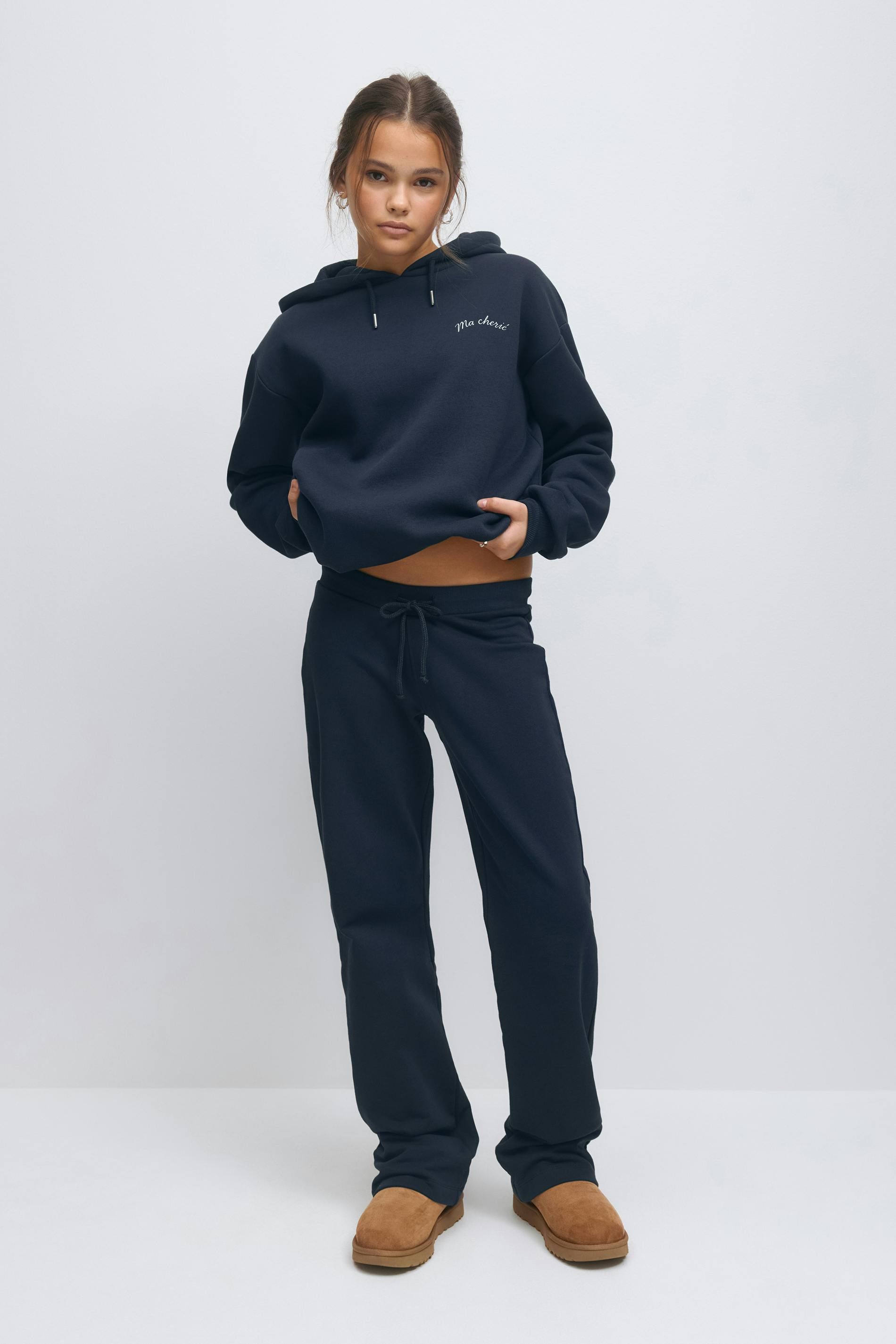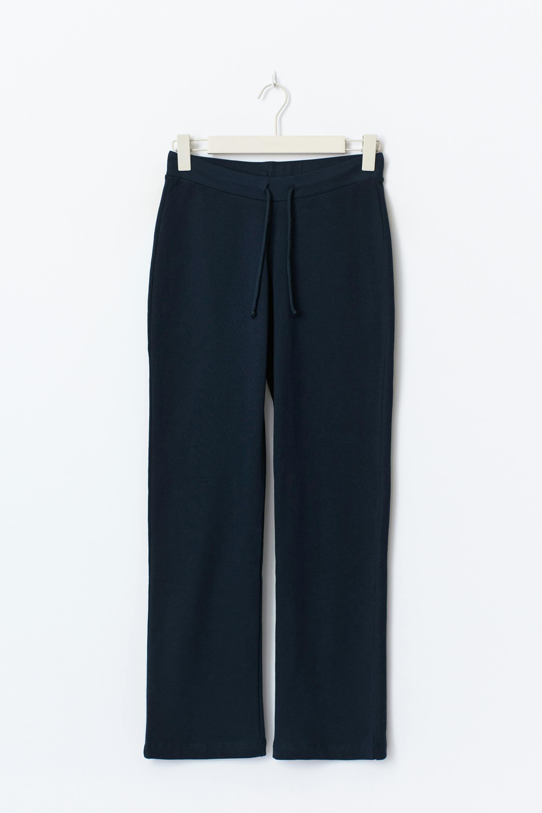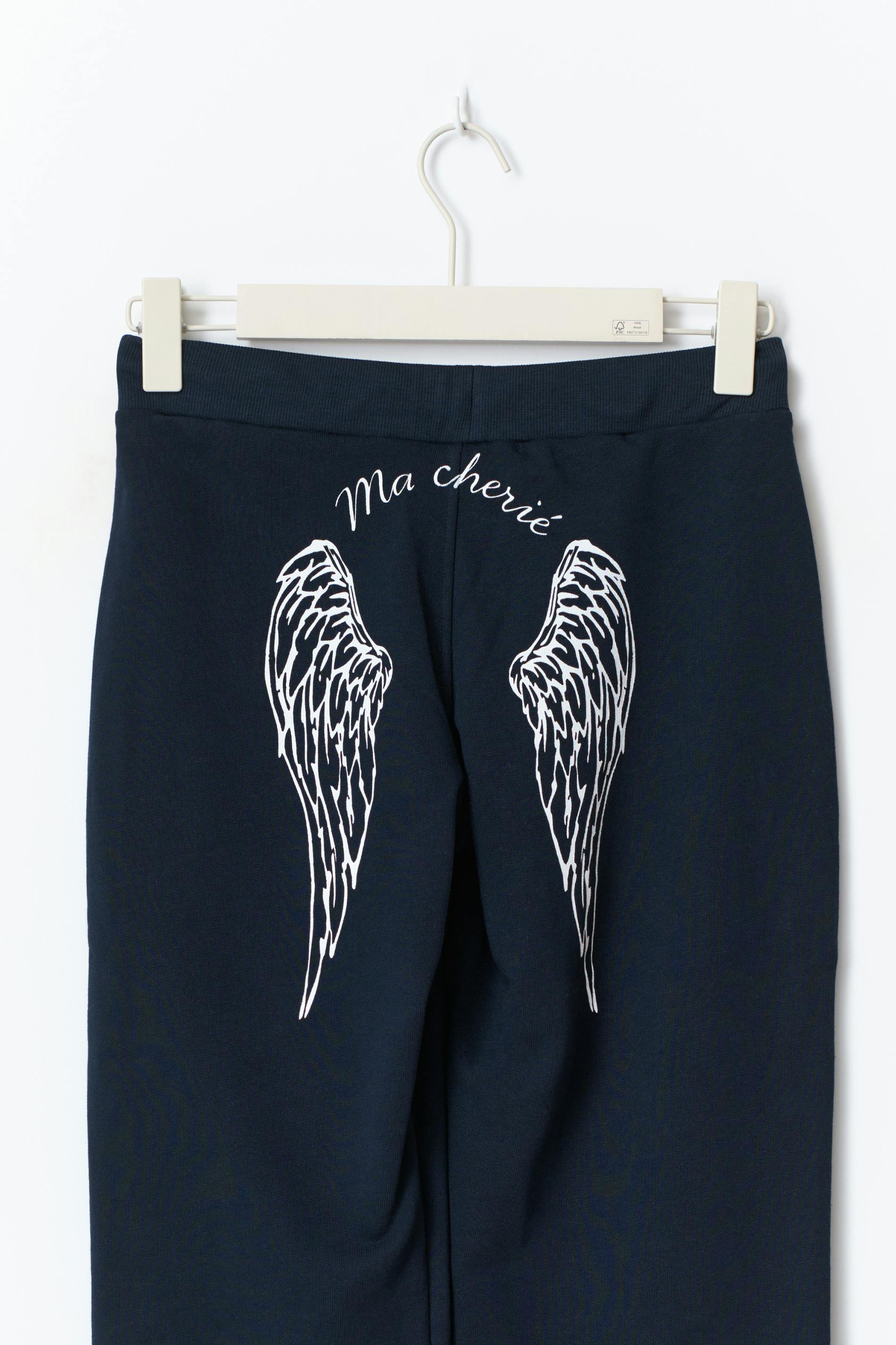 Sweatpant med raka ben. Sweatpanten är marinblå och har ett tryck baktill. Den har en låg midja med en knytbar dragsko.