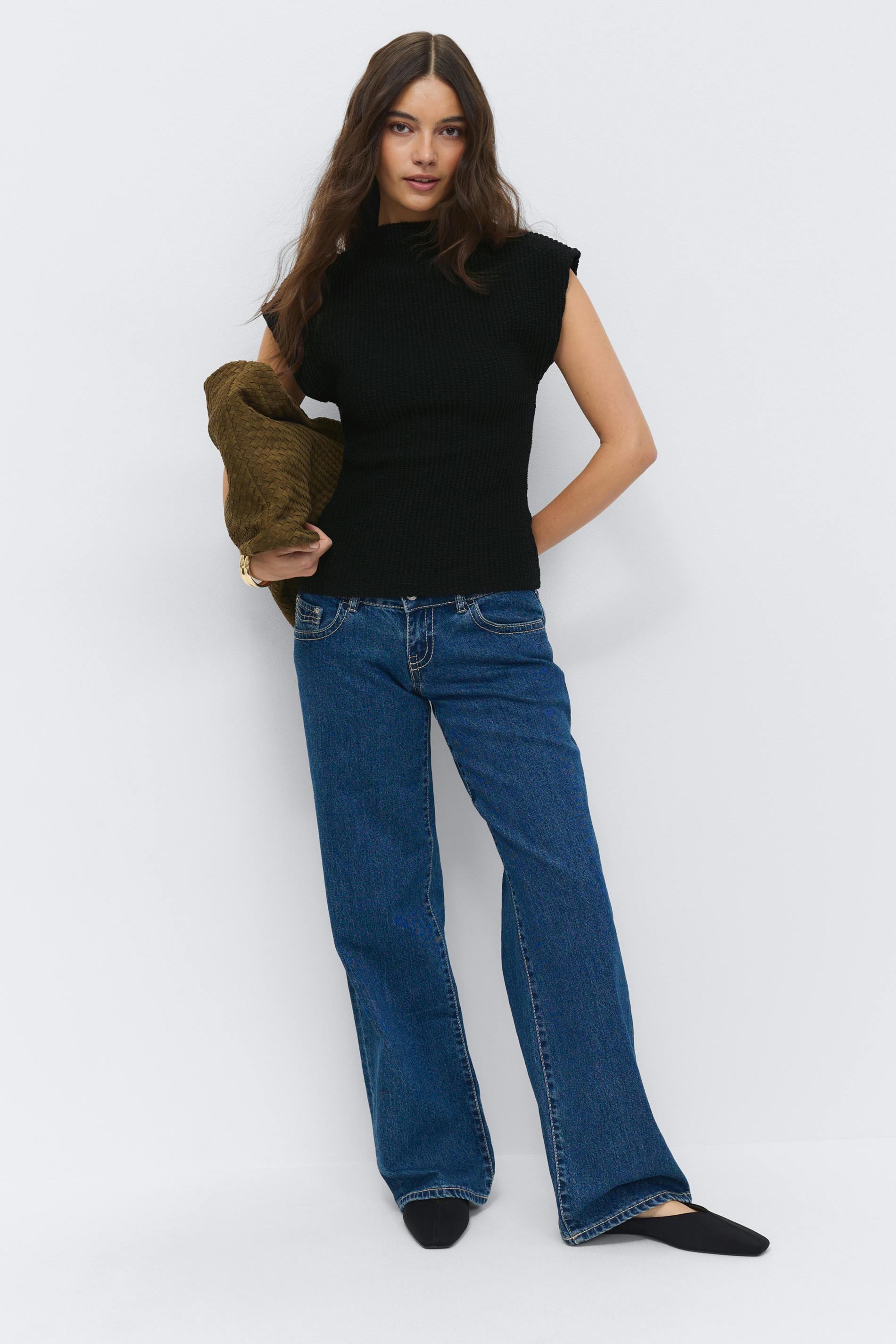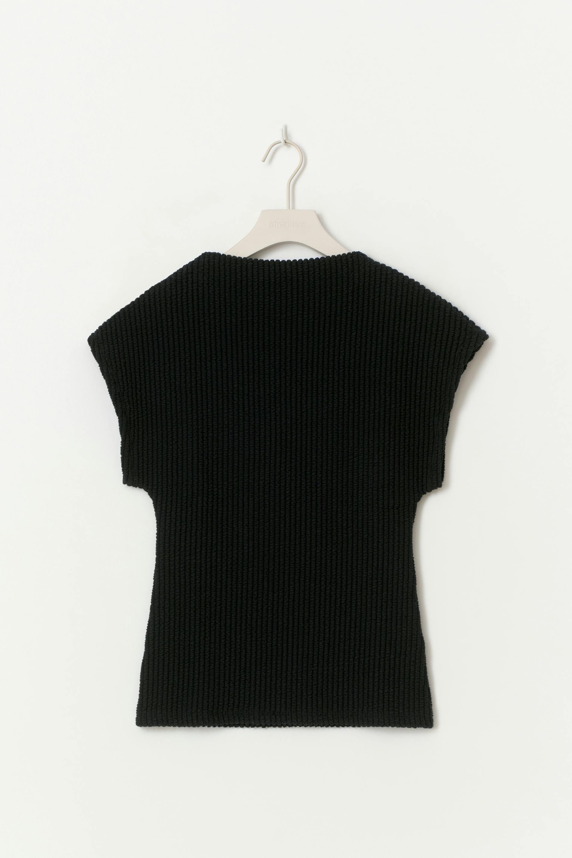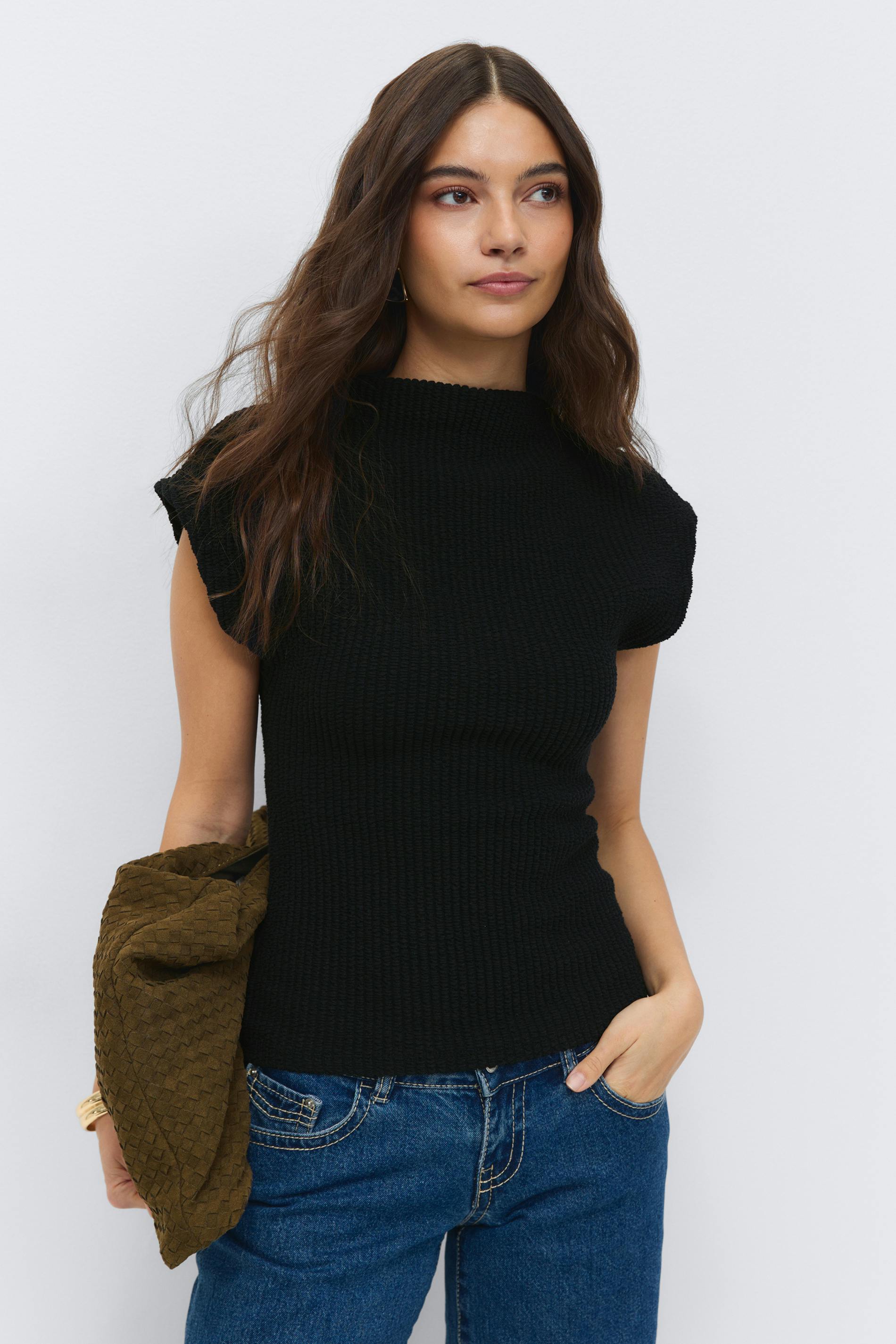 Ärmlös topp med trattkrage. Toppen är svart och har strukturerat material.