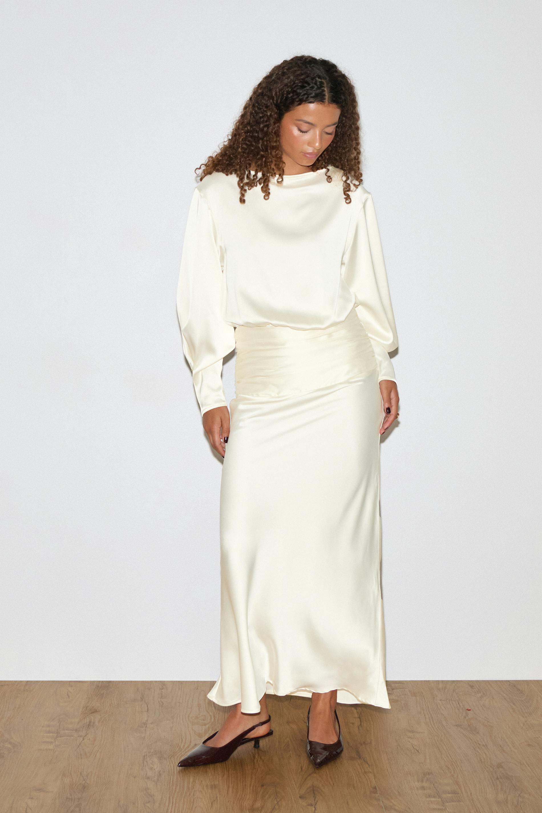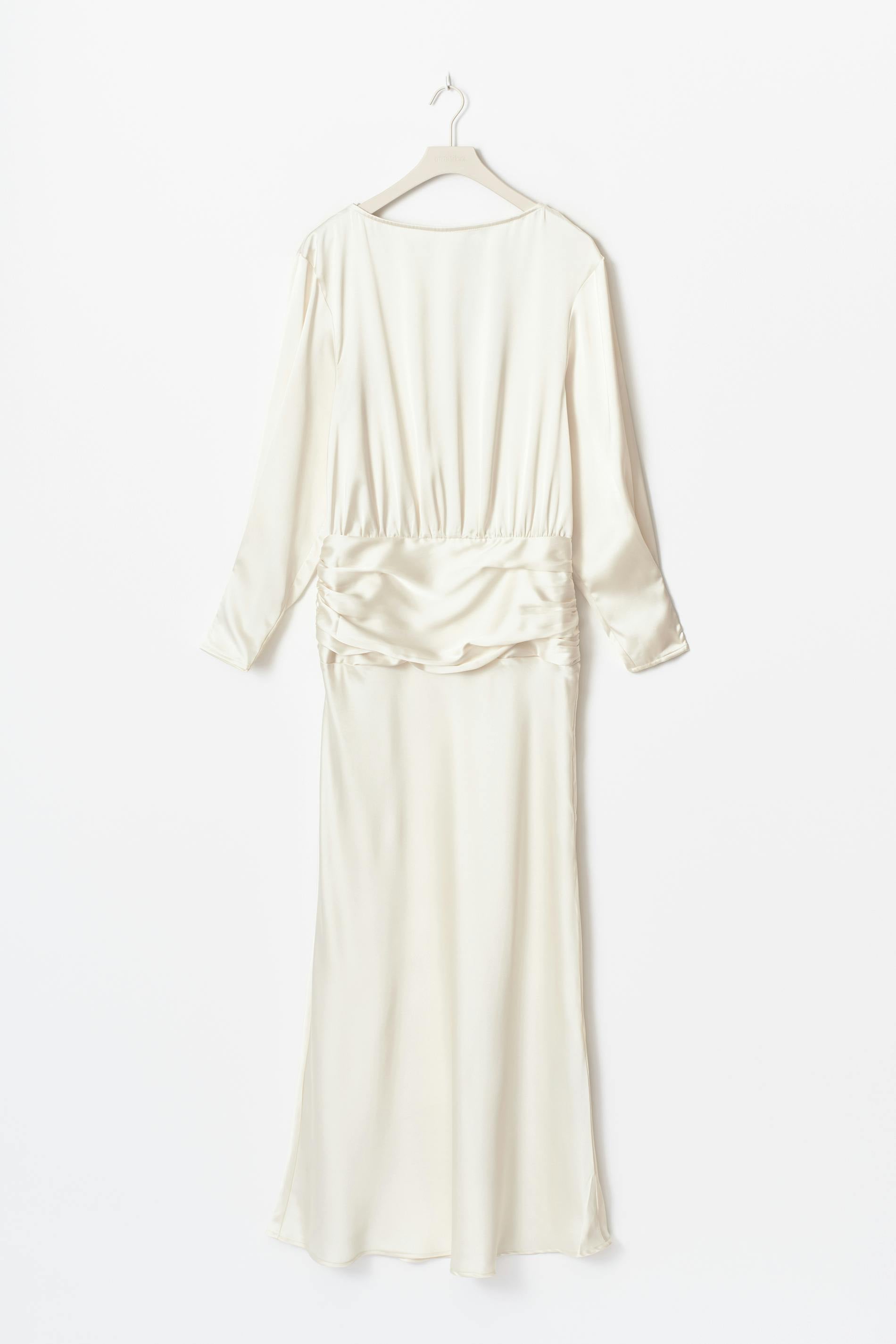 Långklänning i satin med en ballongärm. Klänningen är krämfärgad och har en rynkad midja. Den har en rund hals och en normal passform.
