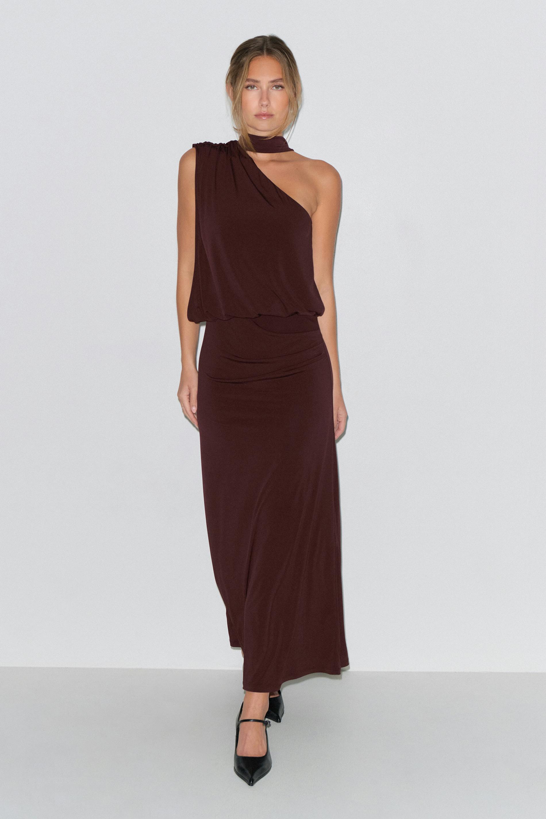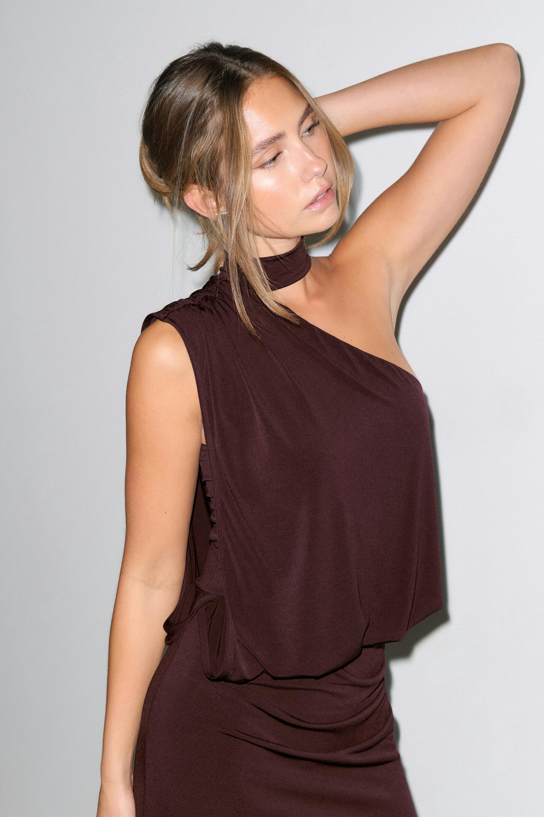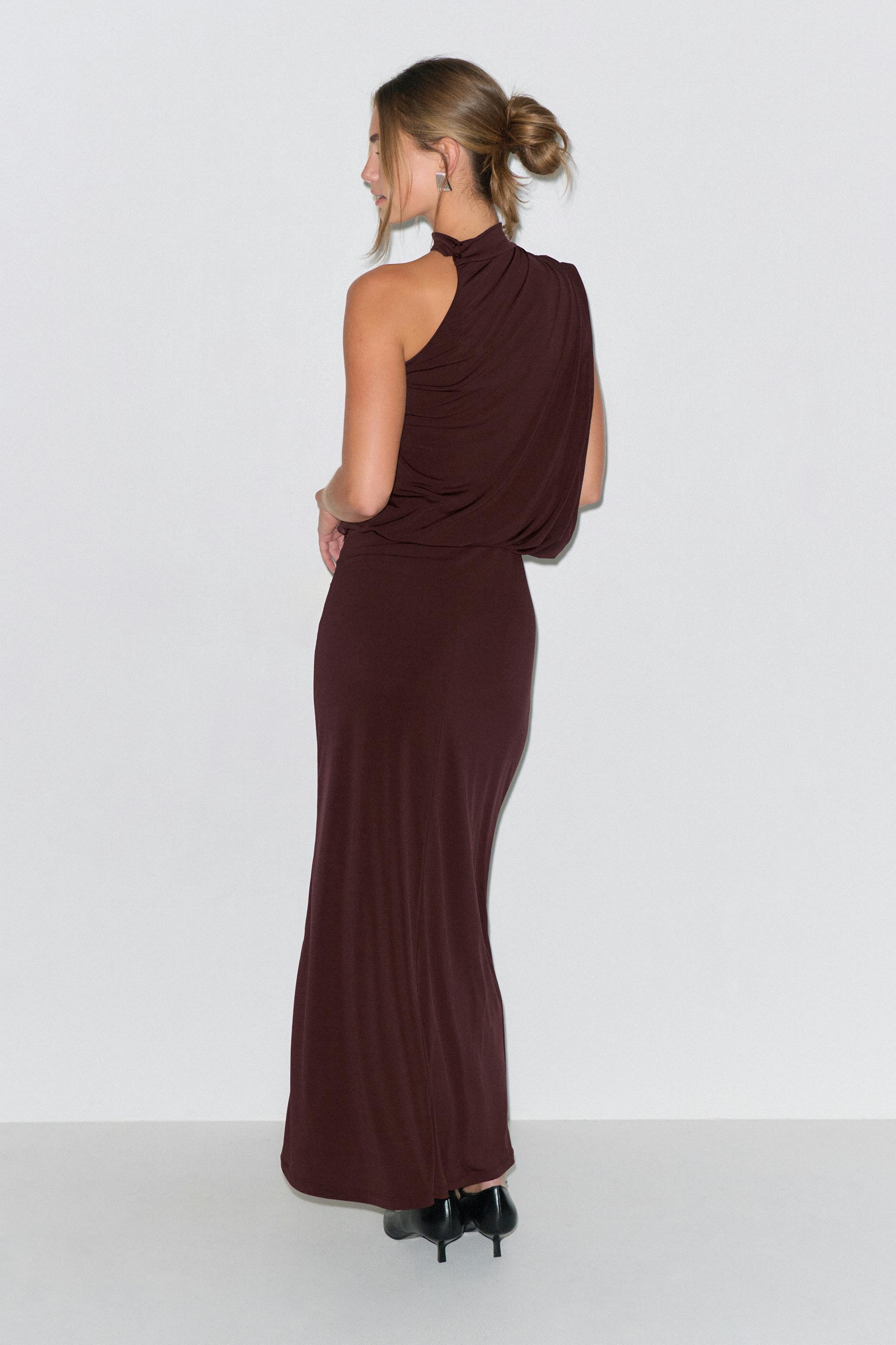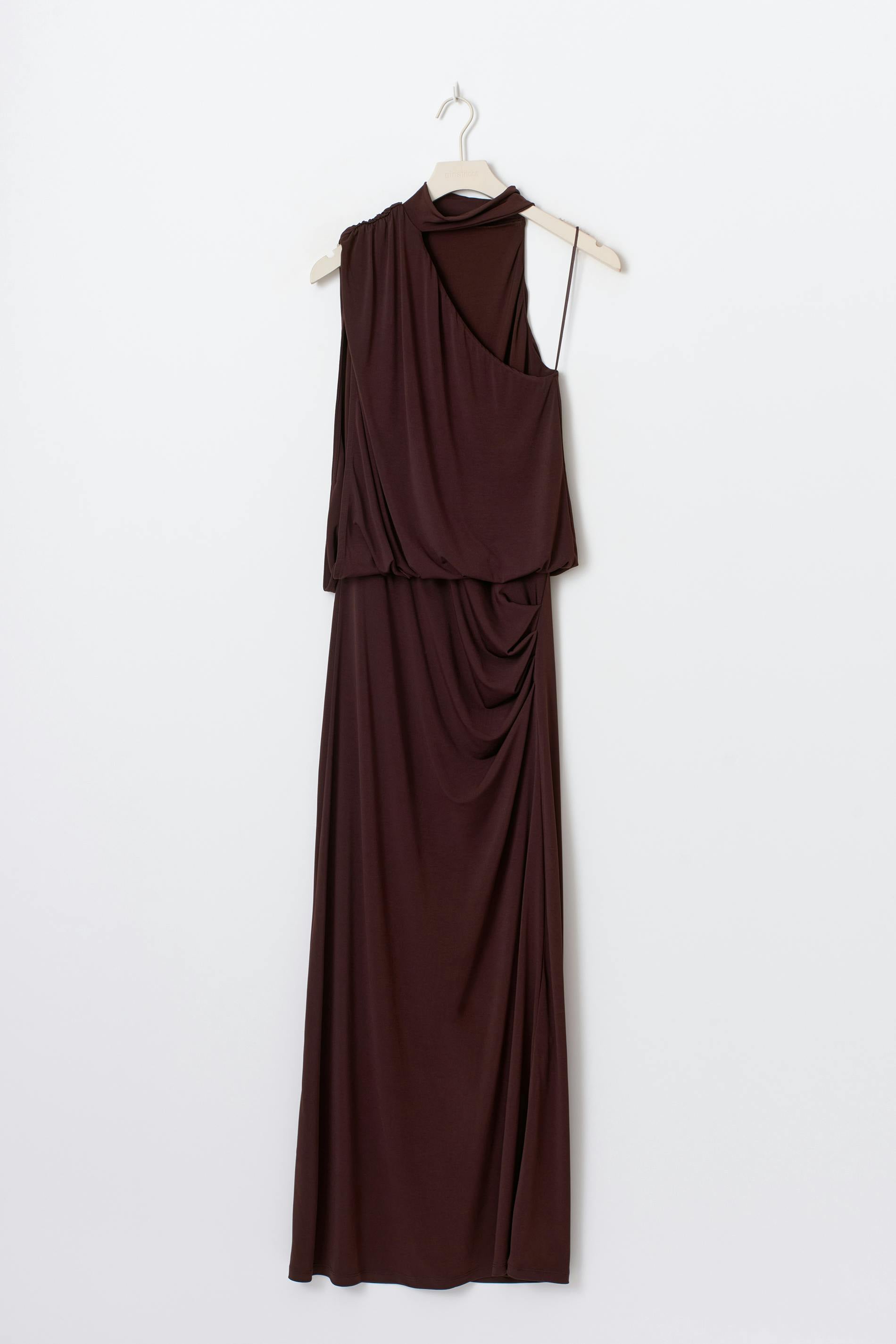 Ärmlös långklänning med draperingar. Klänningen är plommon och har one-shoulder design. Den har scarfdetalj vid halsen, rynkad axel och maxi-längd.