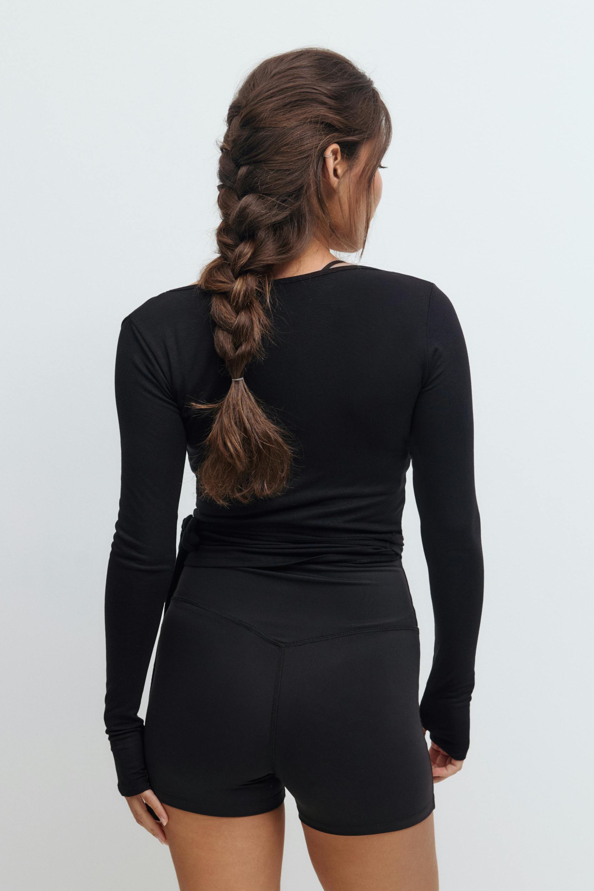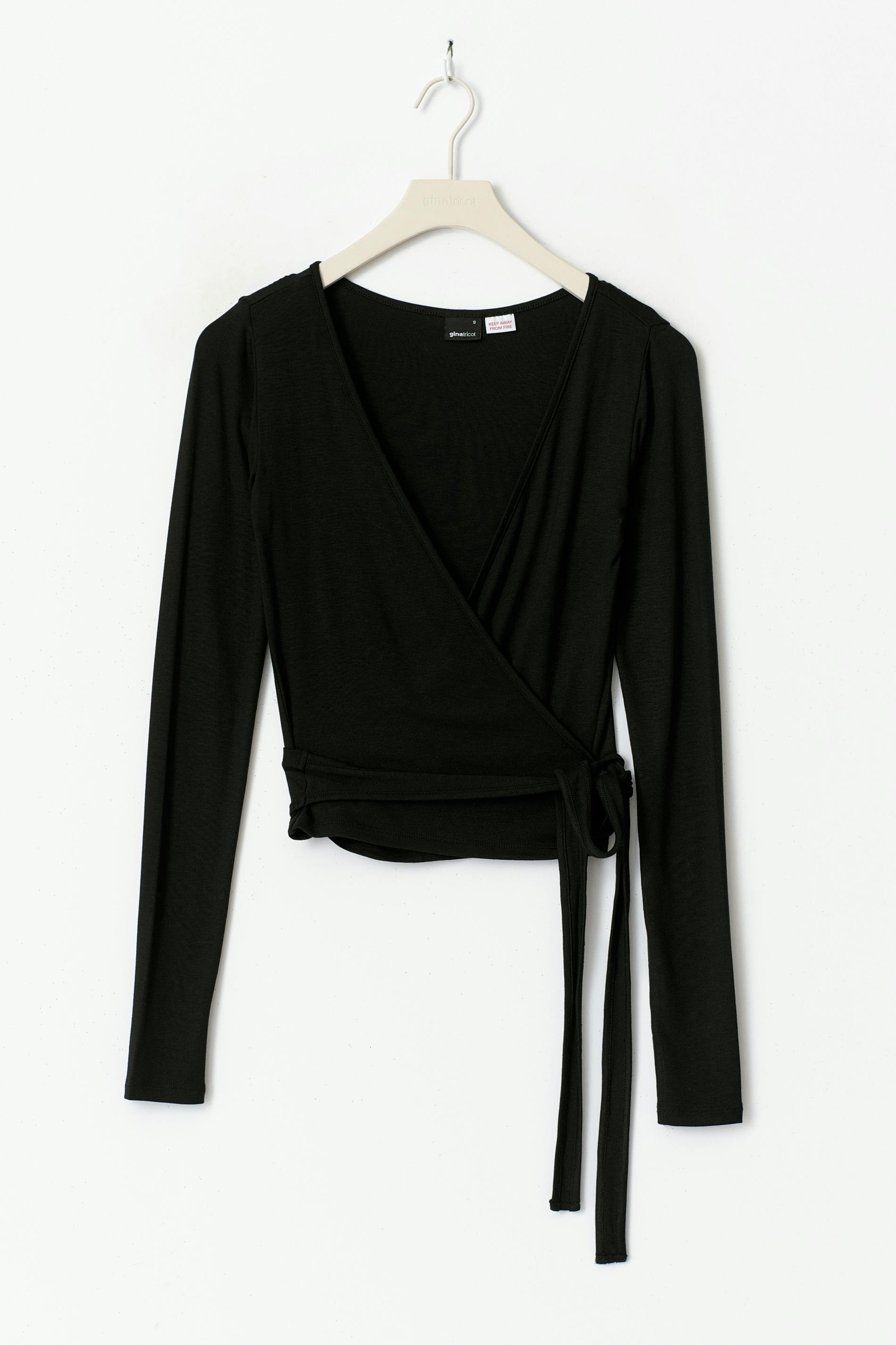 Omlottopp med knytning i midjan. Toppen är svart och har tumhål. Den har v-ringning, lång ärm, mjuk kvalitet och normal passform.