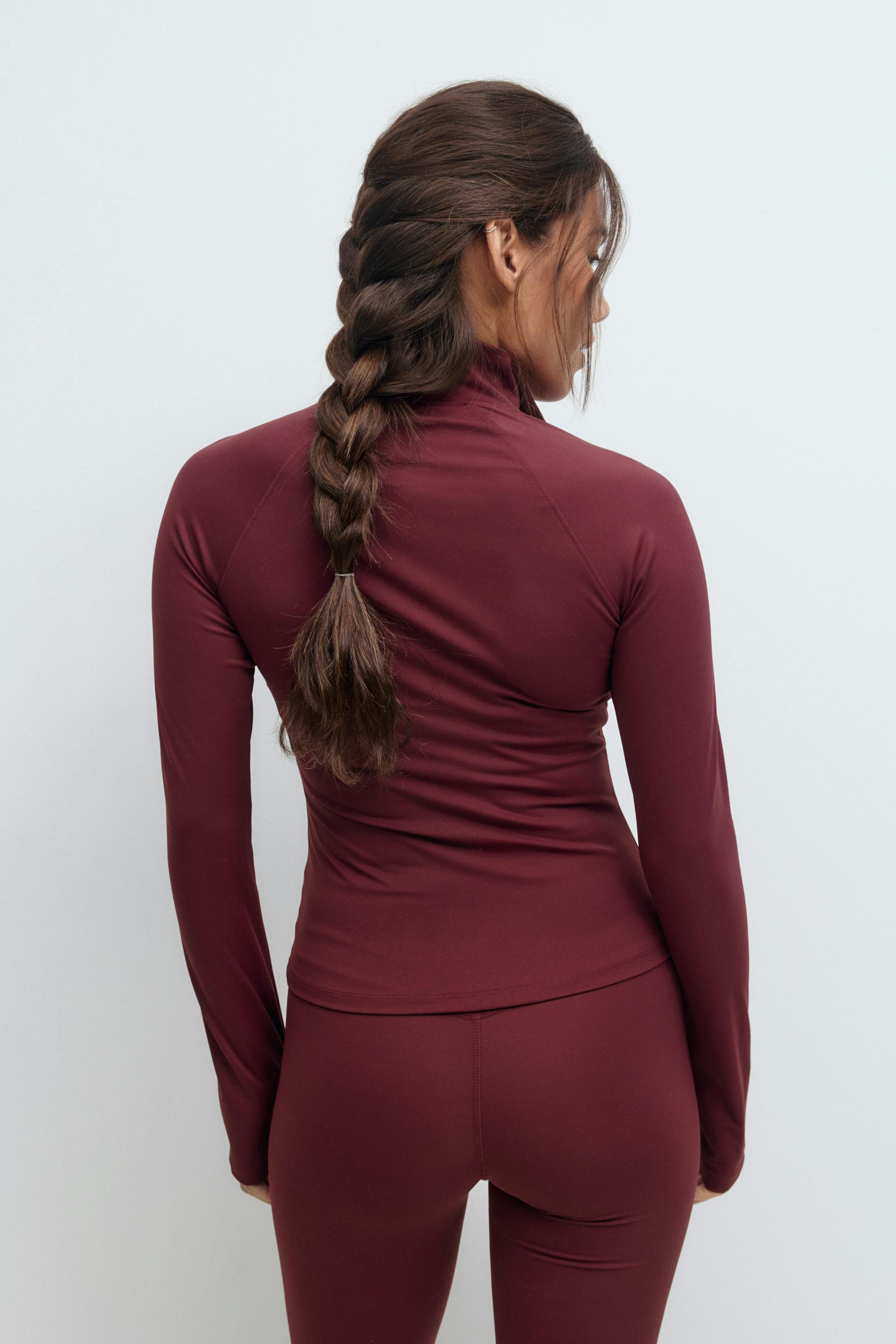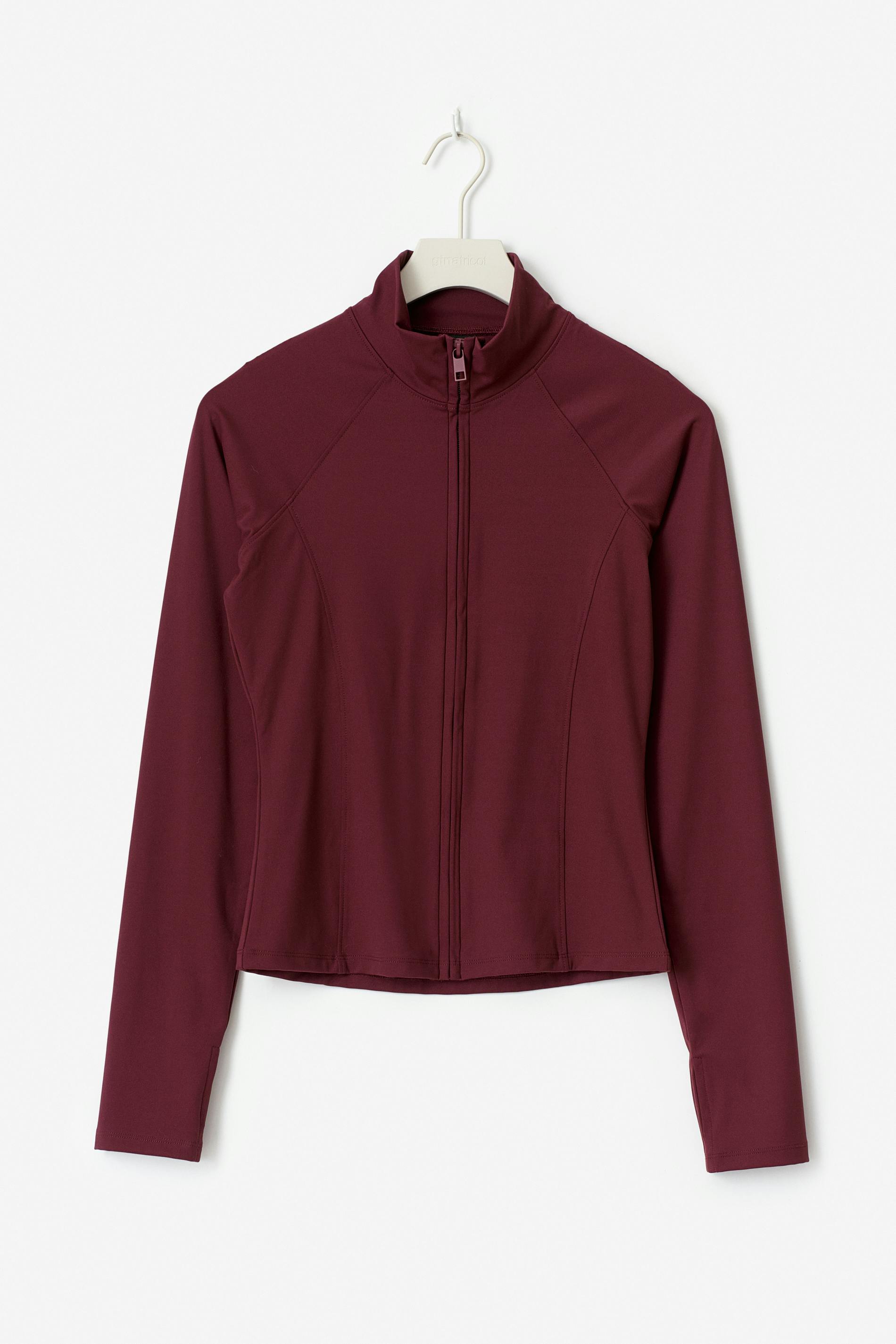 Sportig jacka med tumhål. Jackan är vinröd och har dragkedja fram. Den har en polokrage, dekorativa sömmar fram och bak, figurnära passform, långa ärmar och mjuk, stretchig kvalitet.