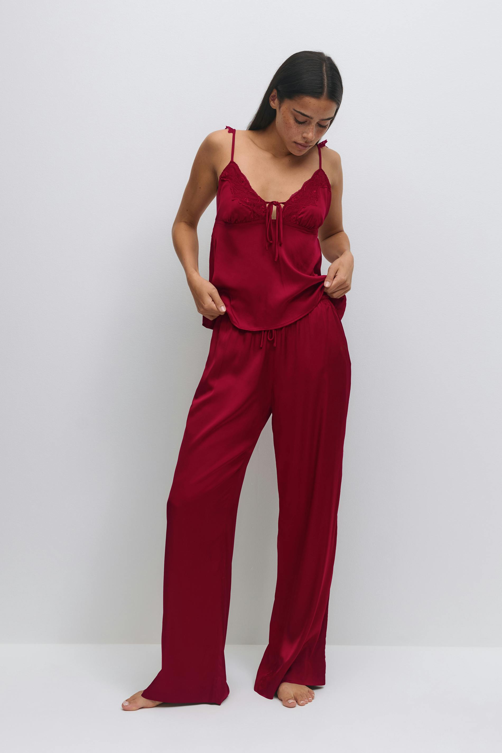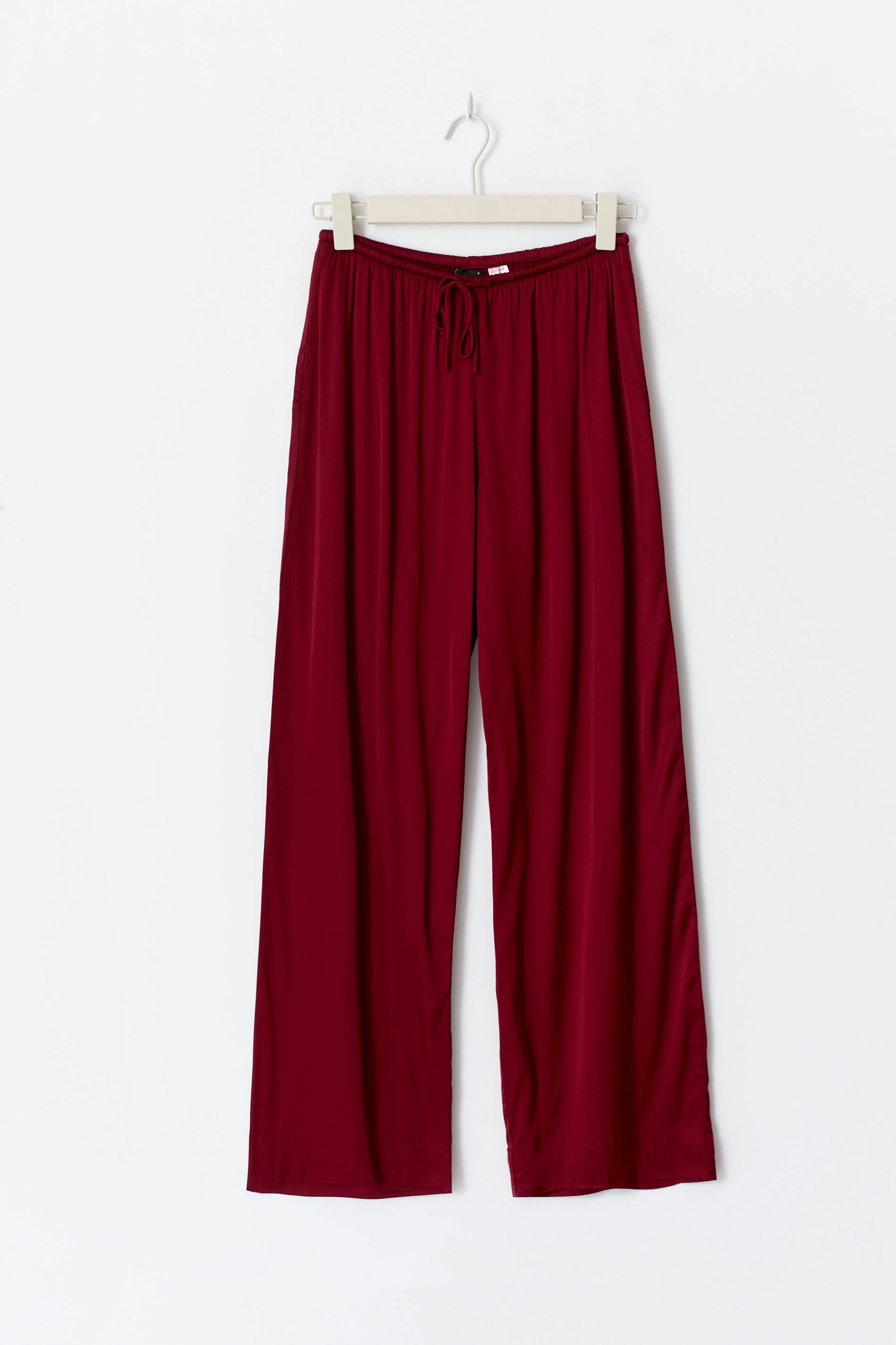 Långa pyjamasbyxor i satin med vida ben. Pyjamasen är mörkröd och har fickor i sidsömmen. Den har ett knytband framtill och en normal midja.