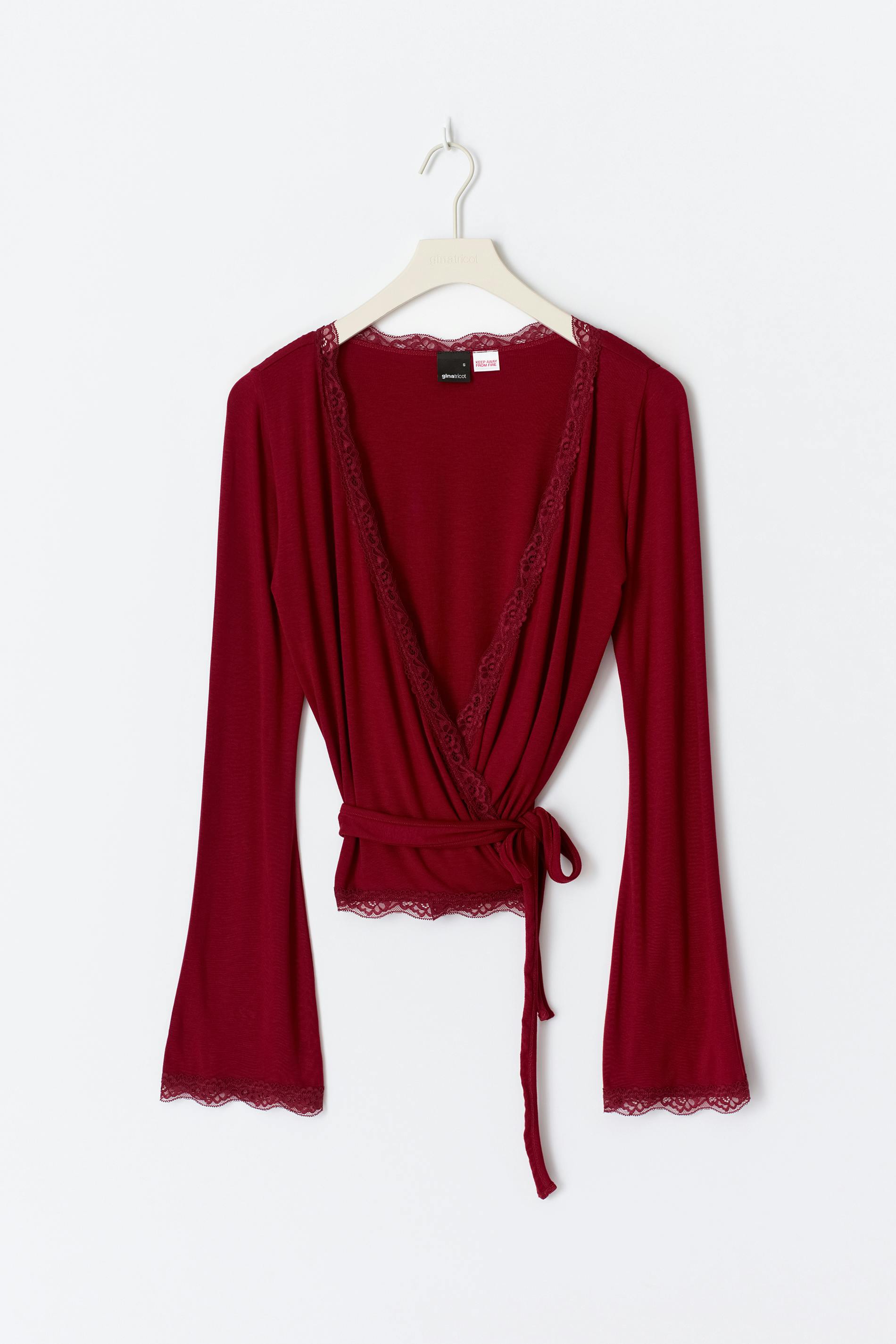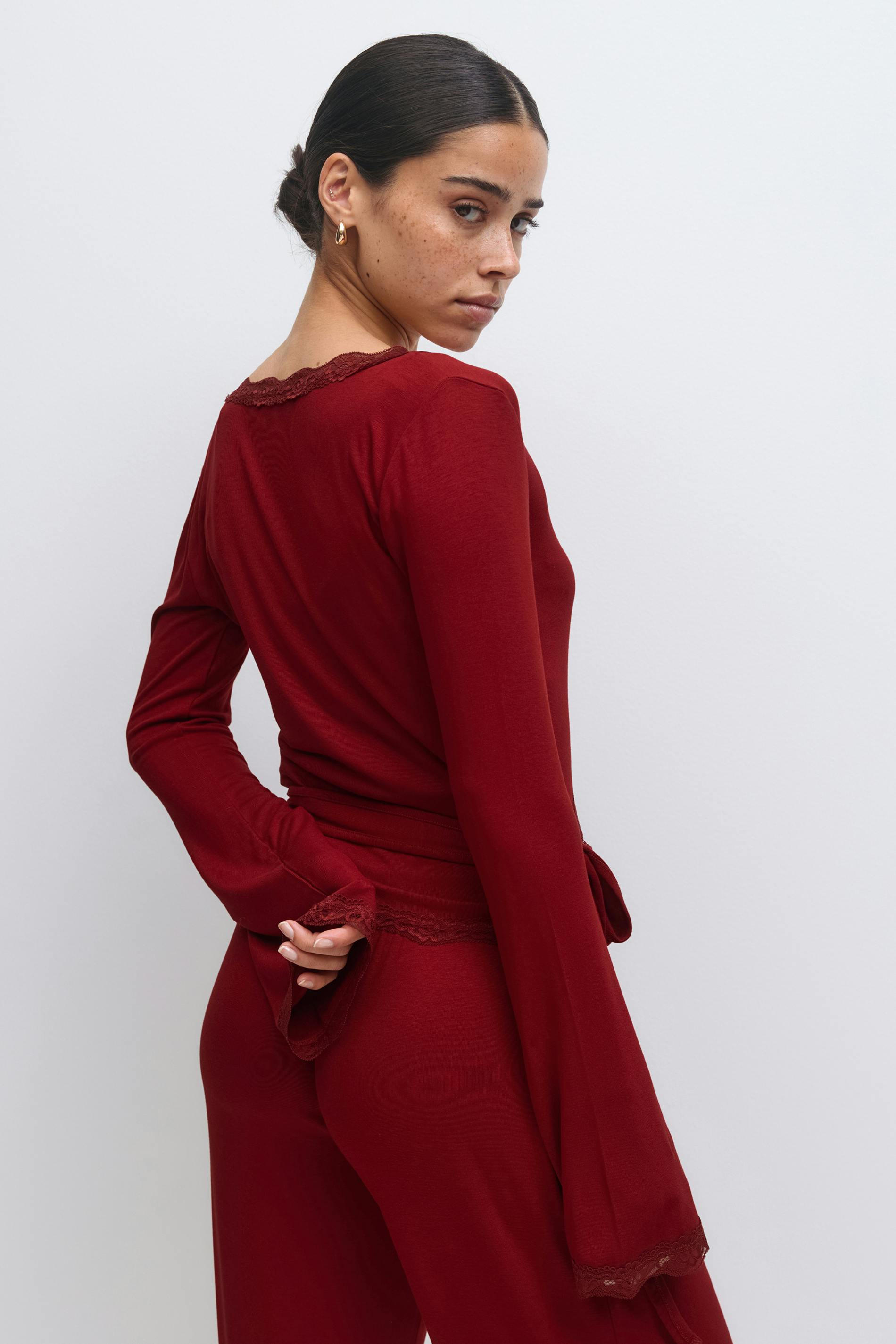 Omlottopp med knytning i midjan. Toppen är röd och har en v-ringning. Den har spetsdetaljer, en lång ärm och en normal passform.